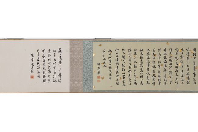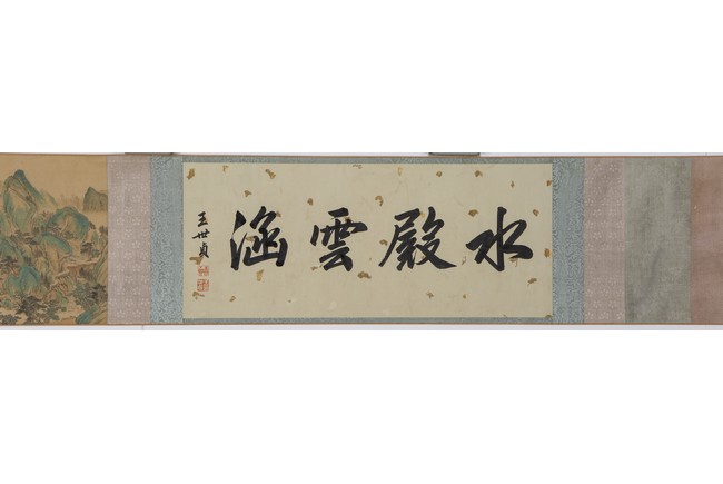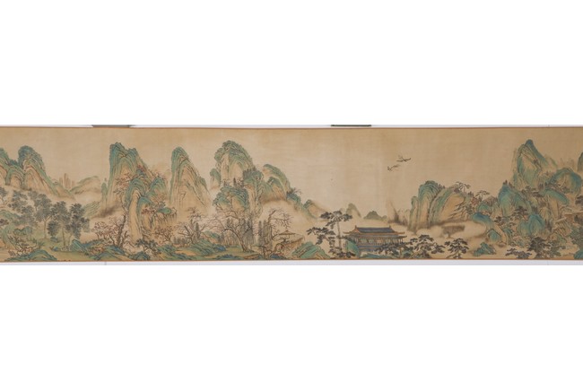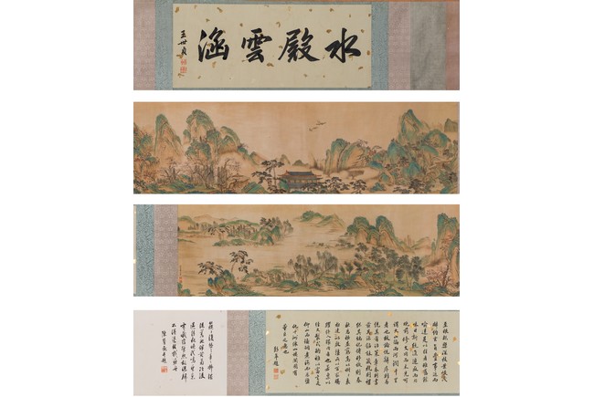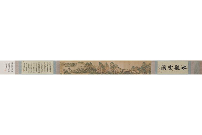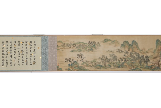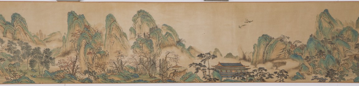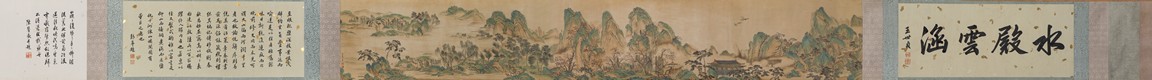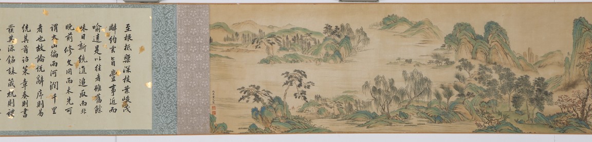 Ink and color on silk painting. Landscape. Handscroll. Signed by Qiu Ying with two seals of the artist. Inscribed and signed by Wang Shizhen and Peng Lai with two seals of mark each, and Chen Jian with one seal of mark.