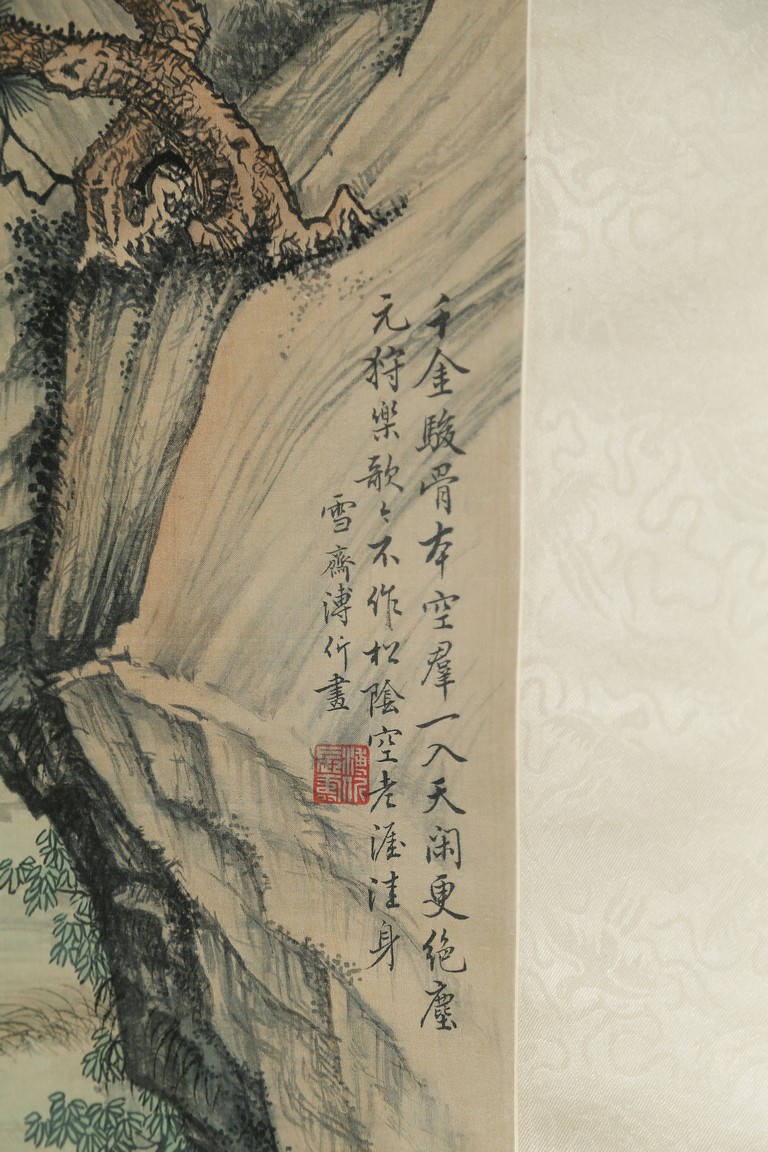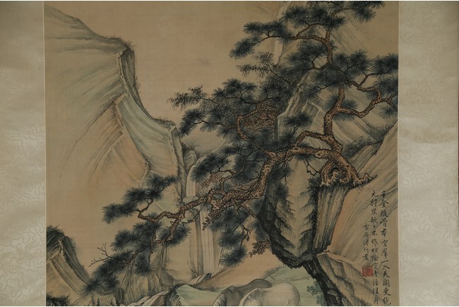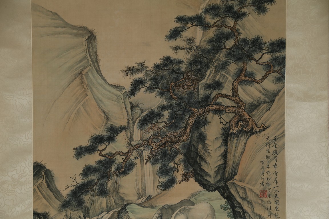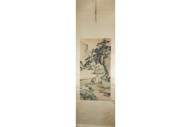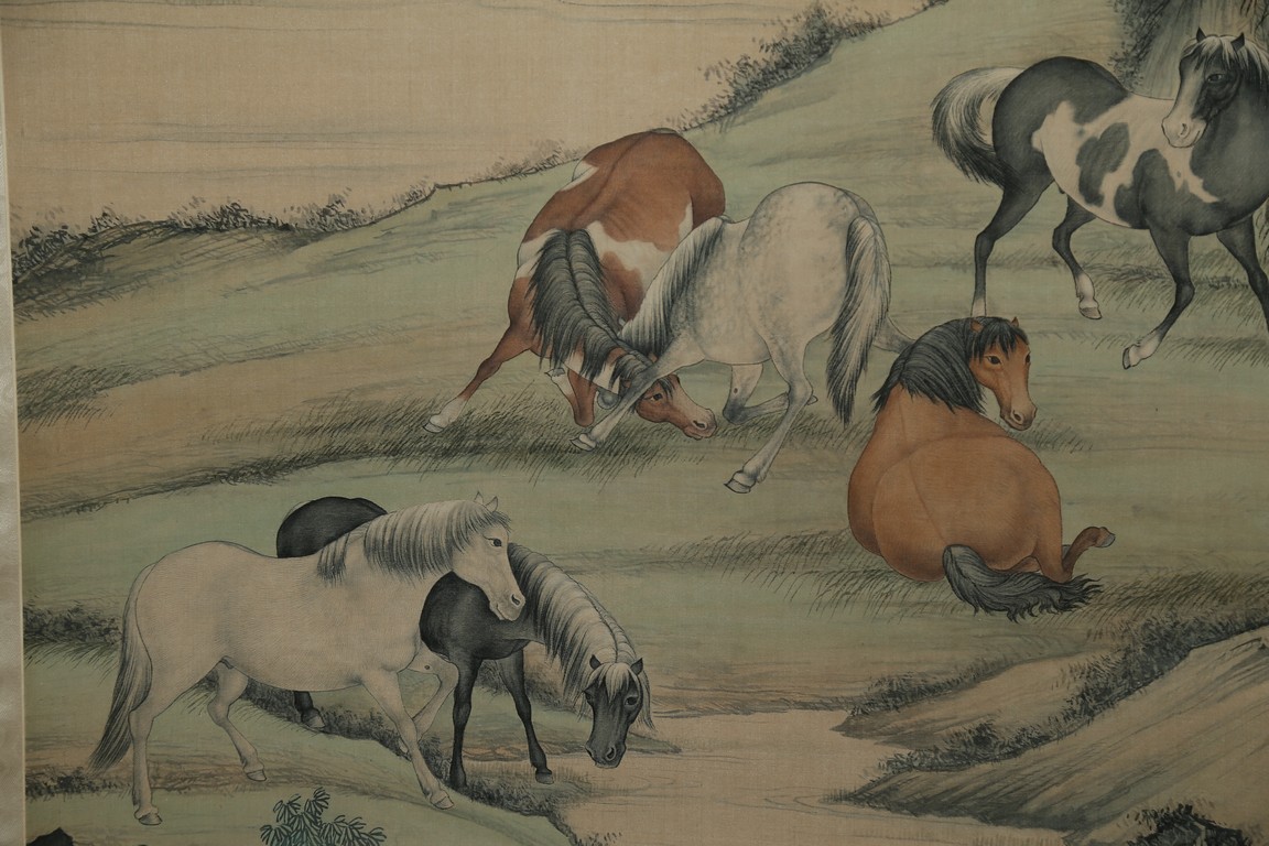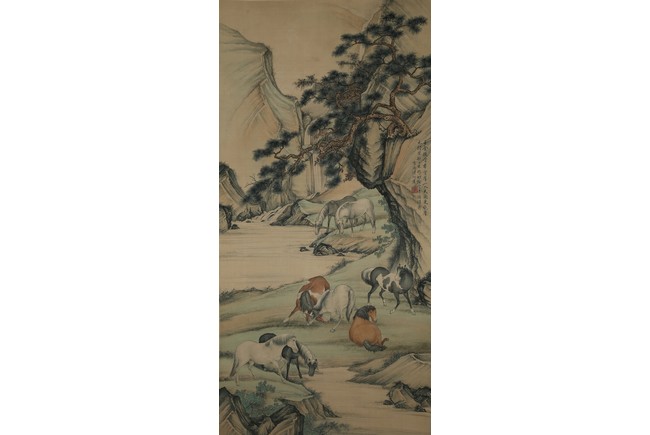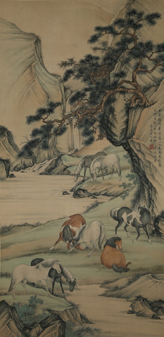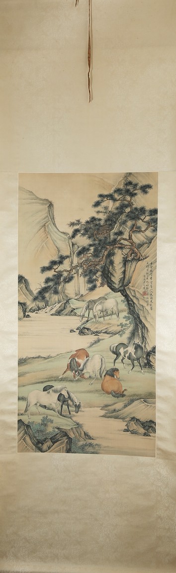 Ink and color on silk painting. Horses. Hanging scroll. Inscribed and signed by Pu Jin and with one seal of the artist.