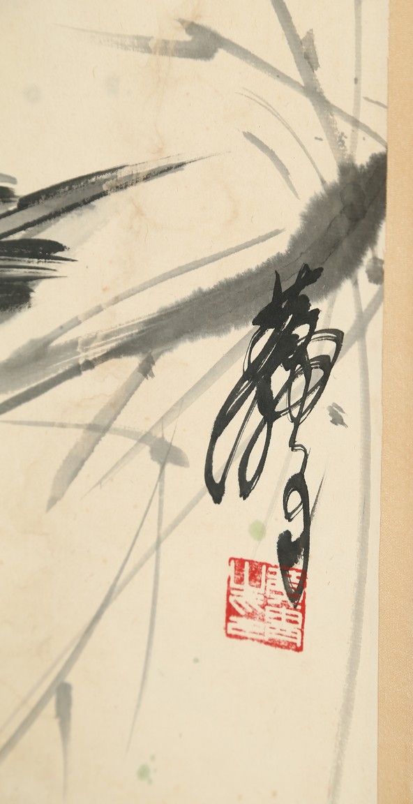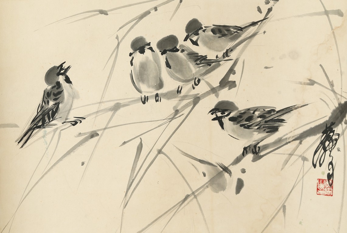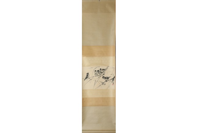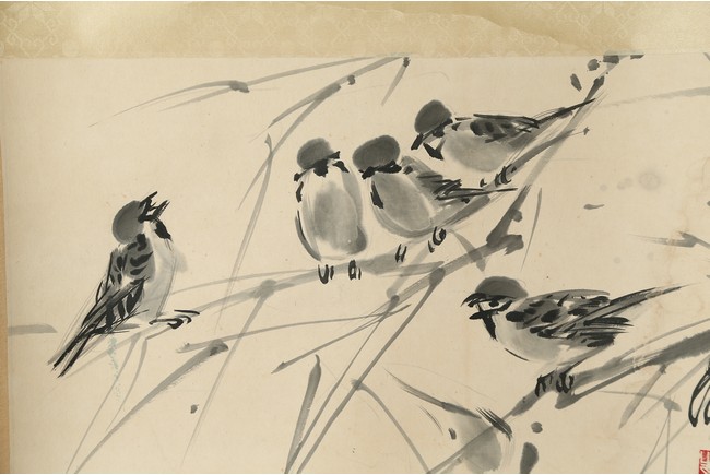 HUANG ZHOU: INK ON PAPER 'SPARROWS' PAINTING 黃胄 麻雀圖 水墨紙本 立軸