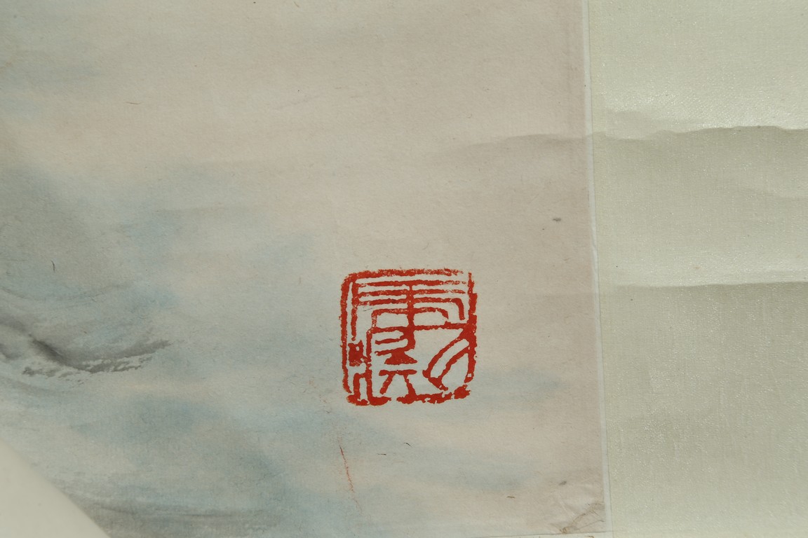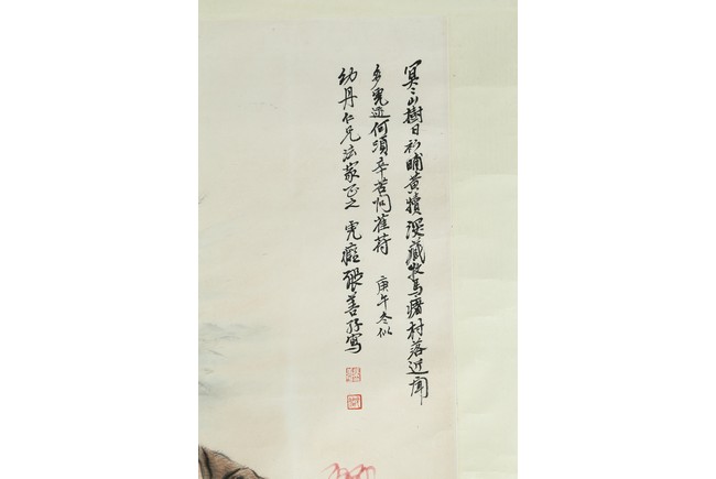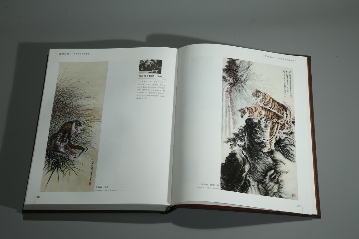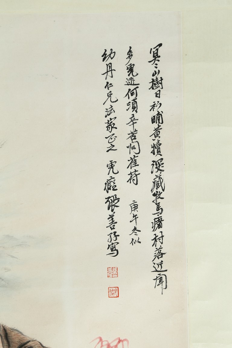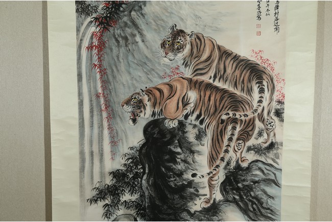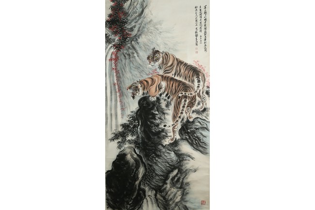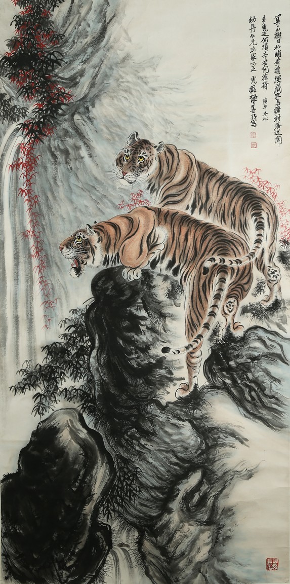 Ink and color on paper painting. Tigers. Scroll. Inscribed and signed Zhang Shanzi and with three seals of the artist.