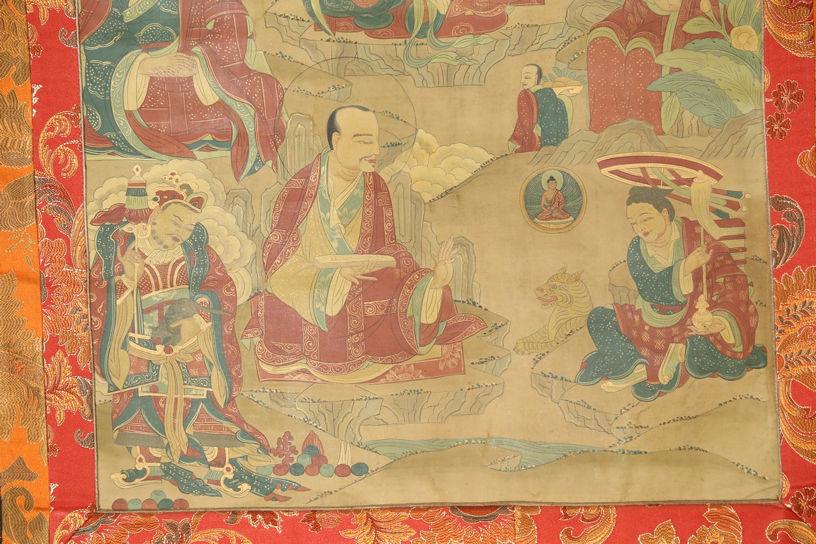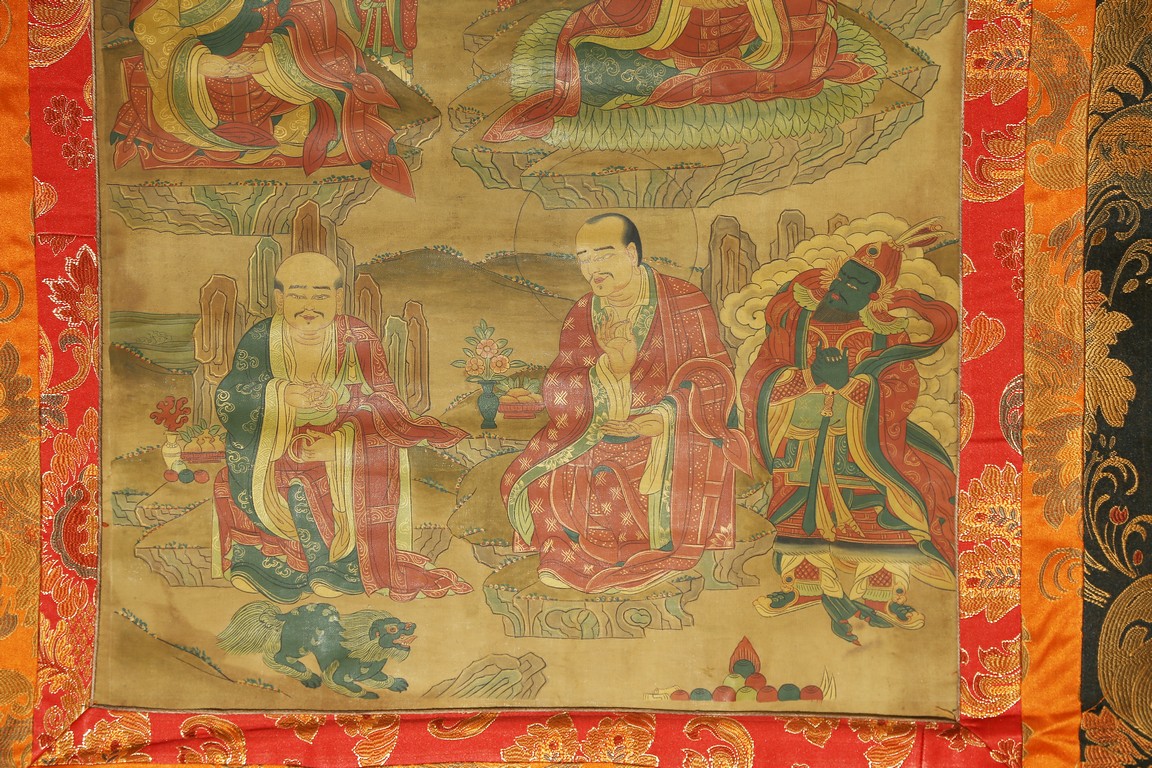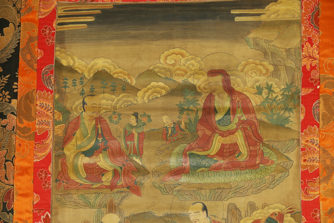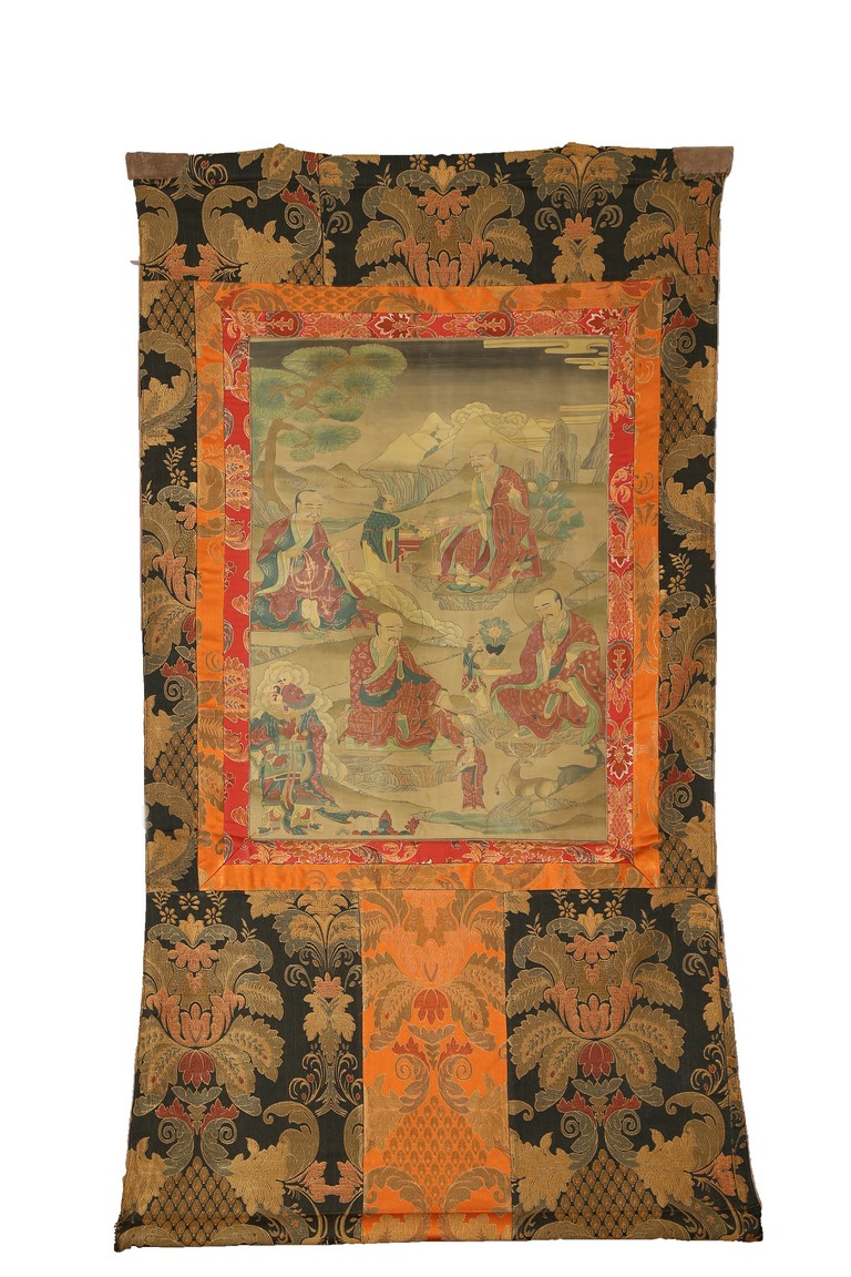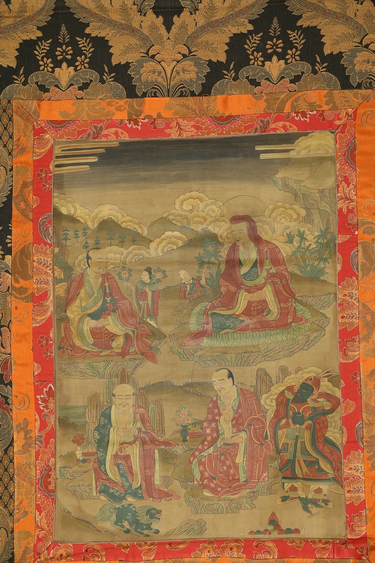 Comprising five thangka, each depicting different bodhisattva scene, including one with four seated immortals conversing, head backed with nimbus and wearing long robe, set within a top of mountain landscape; and one with a bodhisattva seated on double lotus throne, accompanied by two attendants on both left and right, with blossoming flowers and large nimbus behind him.