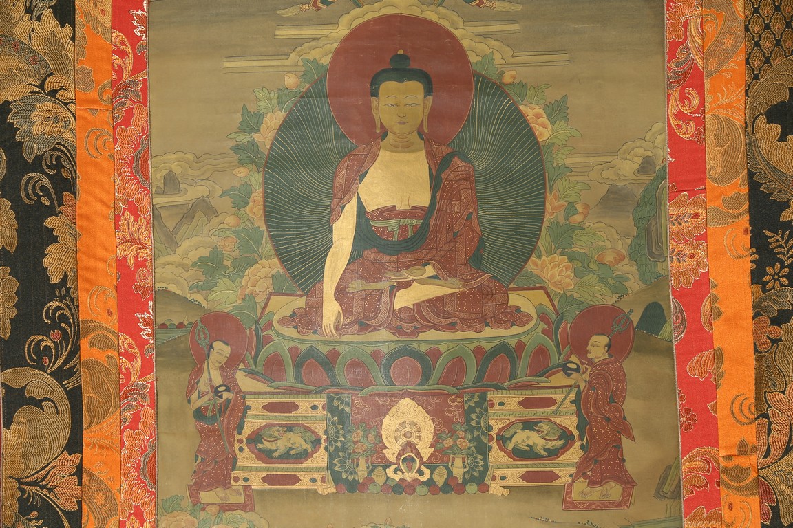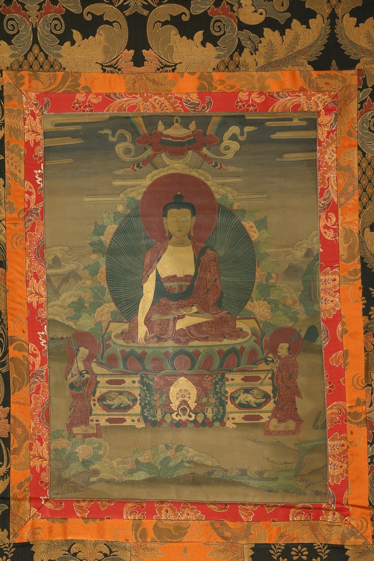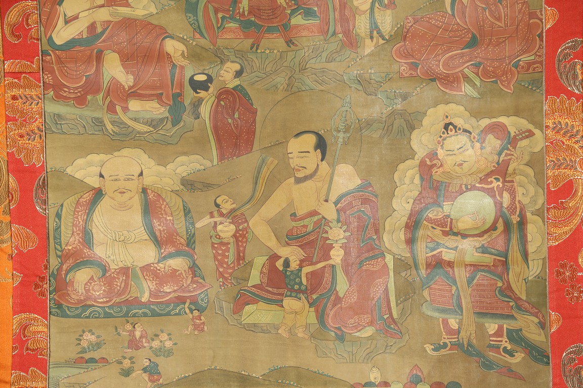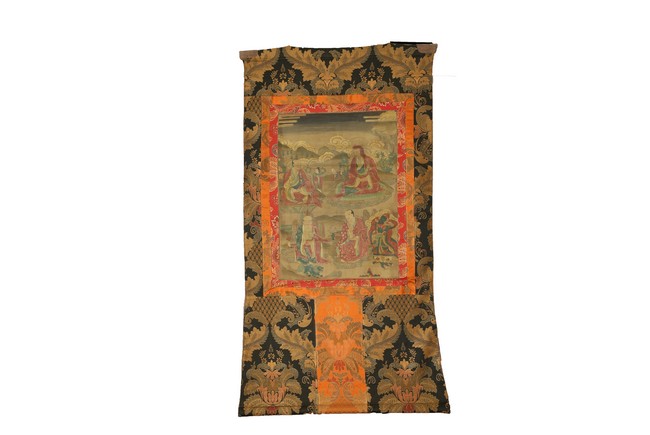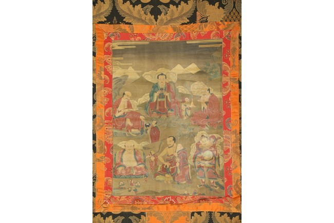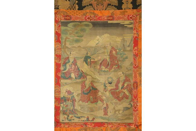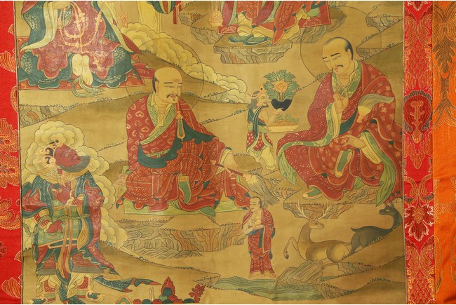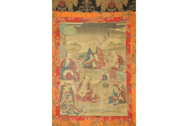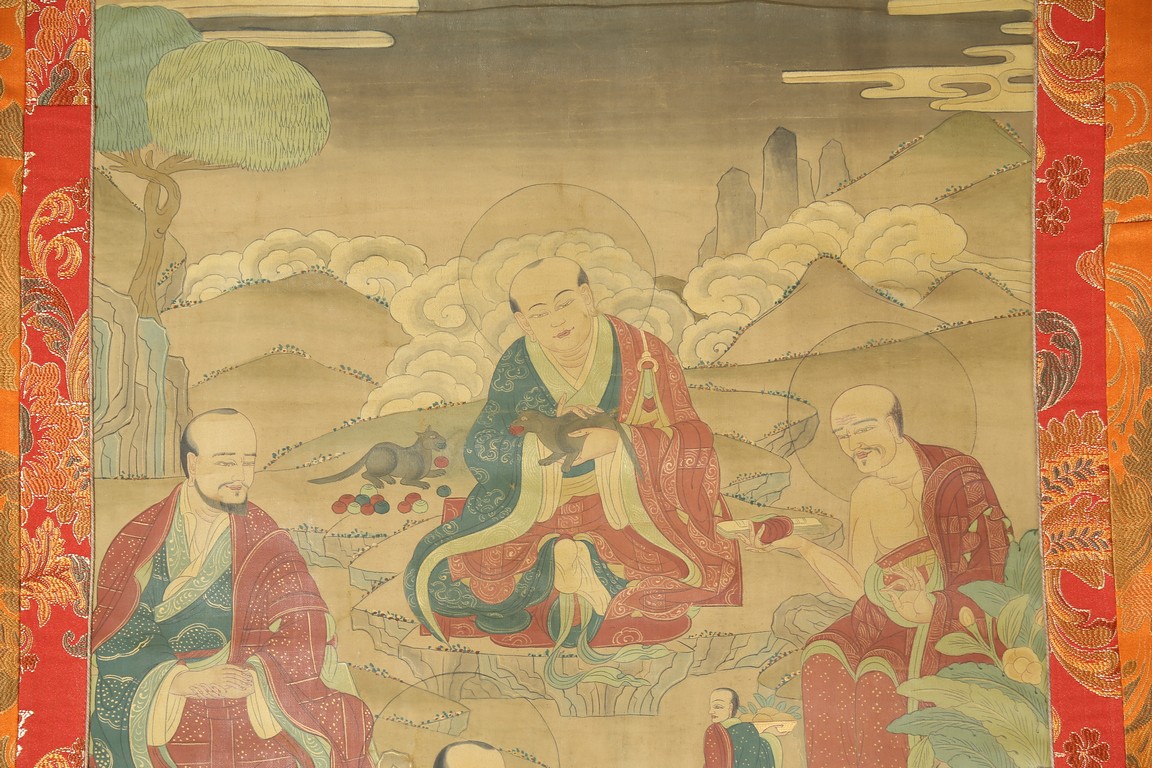 Comprising five thangka, each depicting different bodhisattva scene, including one with four seated immortals conversing, head backed with nimbus and wearing long robe, set within a top of mountain landscape; and one with a bodhisattva seated on double lotus throne, accompanied by two attendants on both left and right, with blossoming flowers and large nimbus behind him.