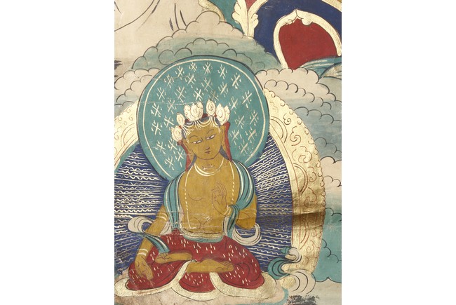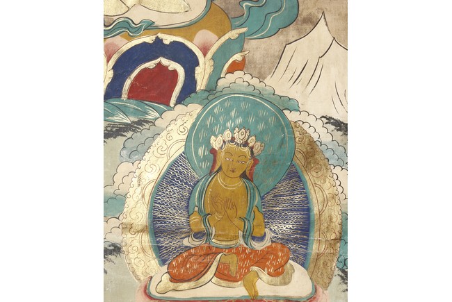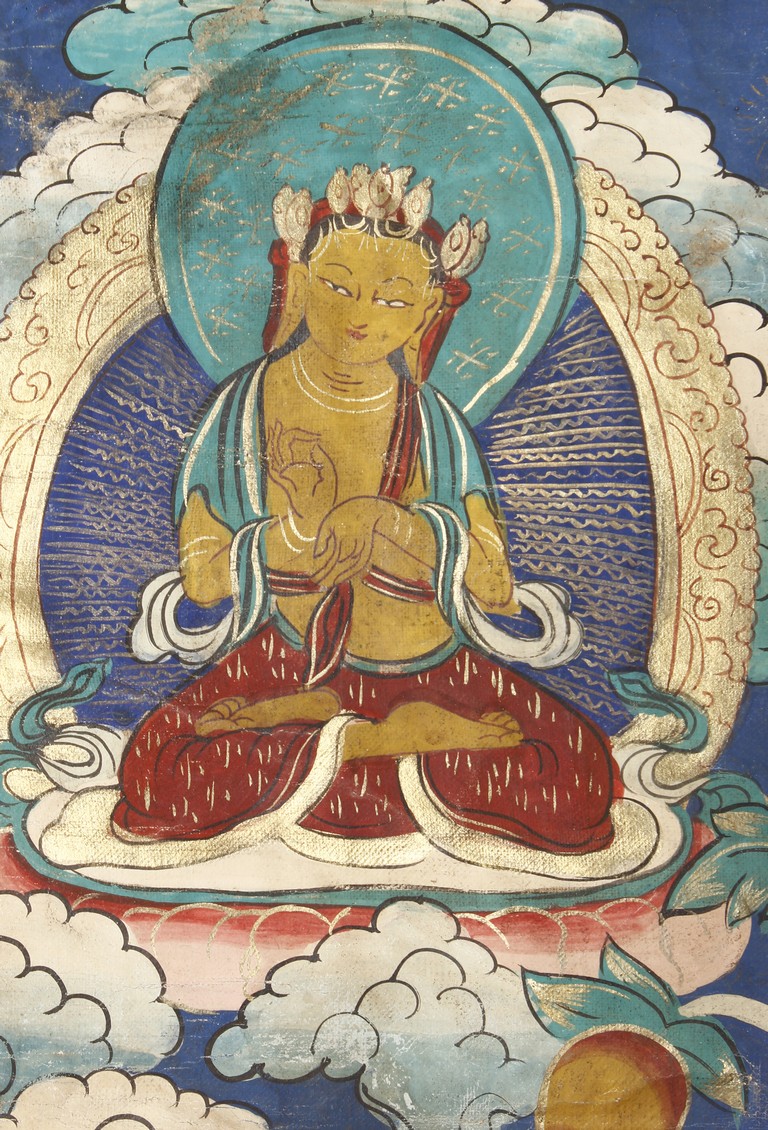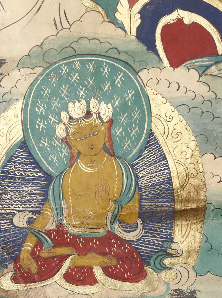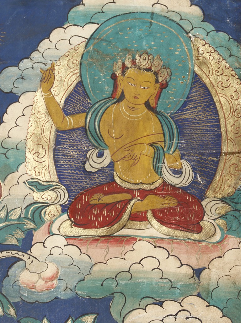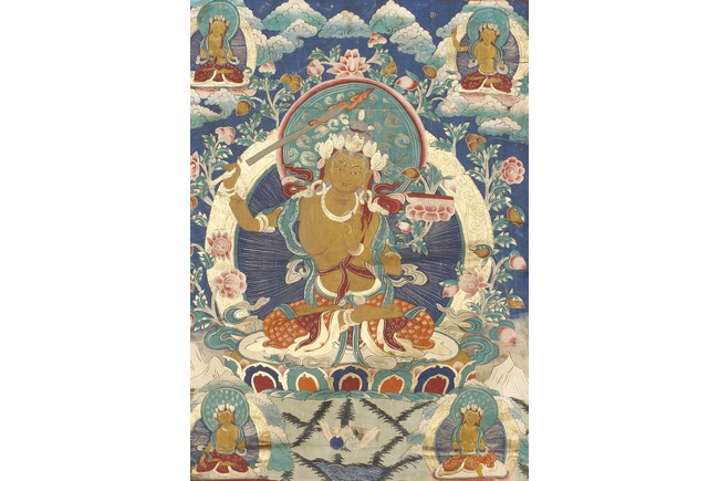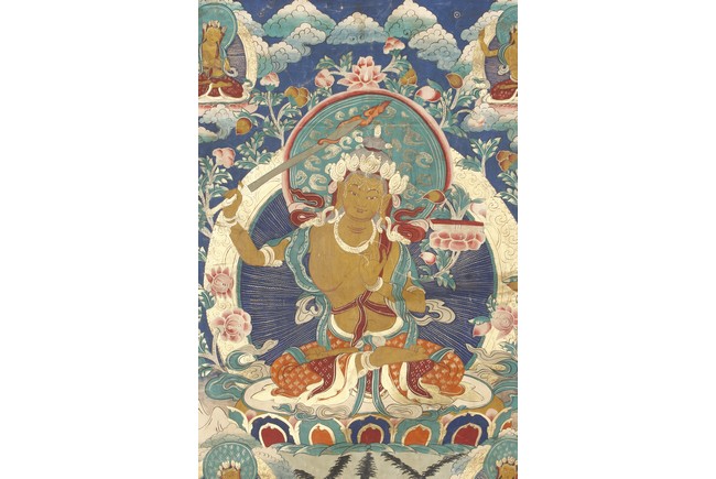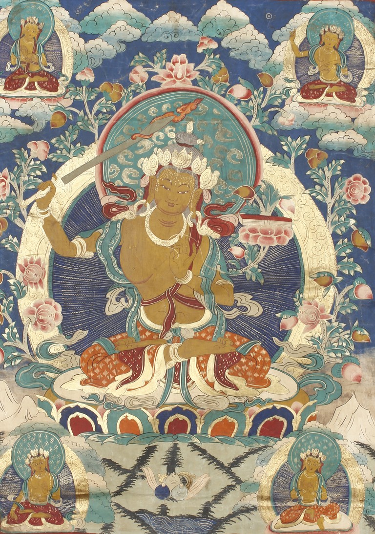 Painted on a cloth, this thangka features manjushri raising up a sword on right hand and seated in dhyanasana against a blue and ivory colored mandorla. His face is vividly drew with benevolent and serene expression and hair tied in a topknot against a green roundel. He is surrounded by deities with similar blue mandorlas amidst clouds. Qing Dynasty period.
