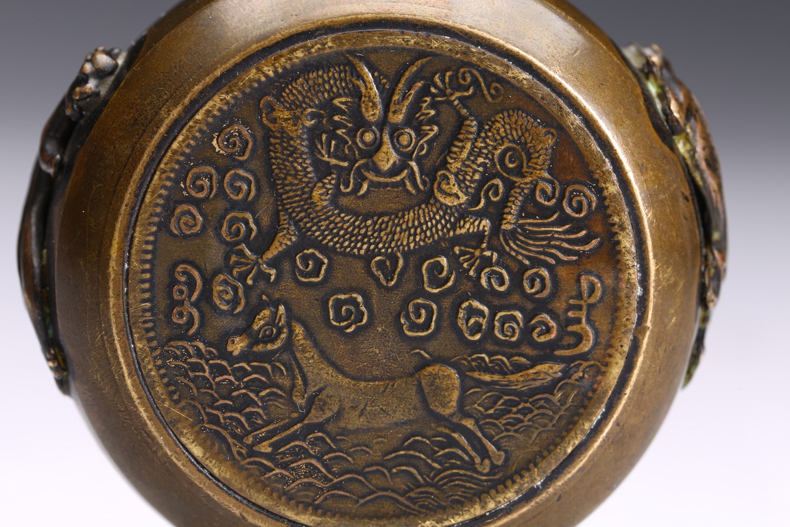 Cast in shallow relief with dragon and mythical beast, base three character mark.