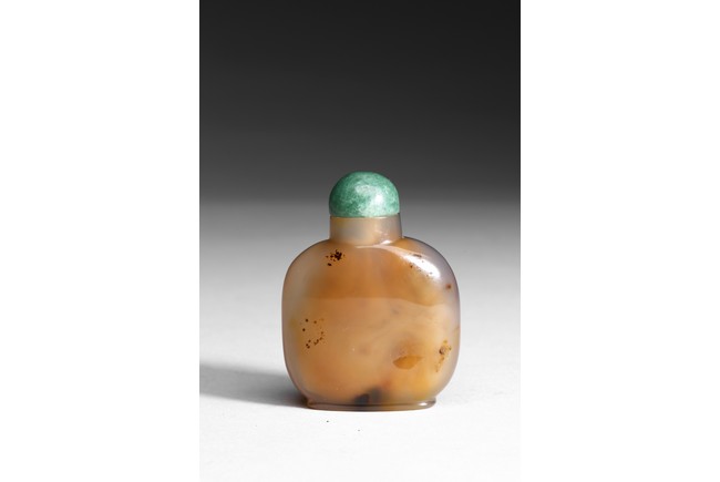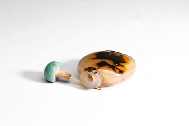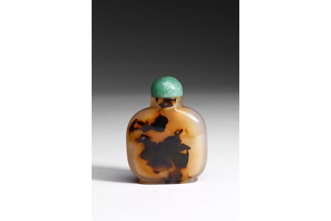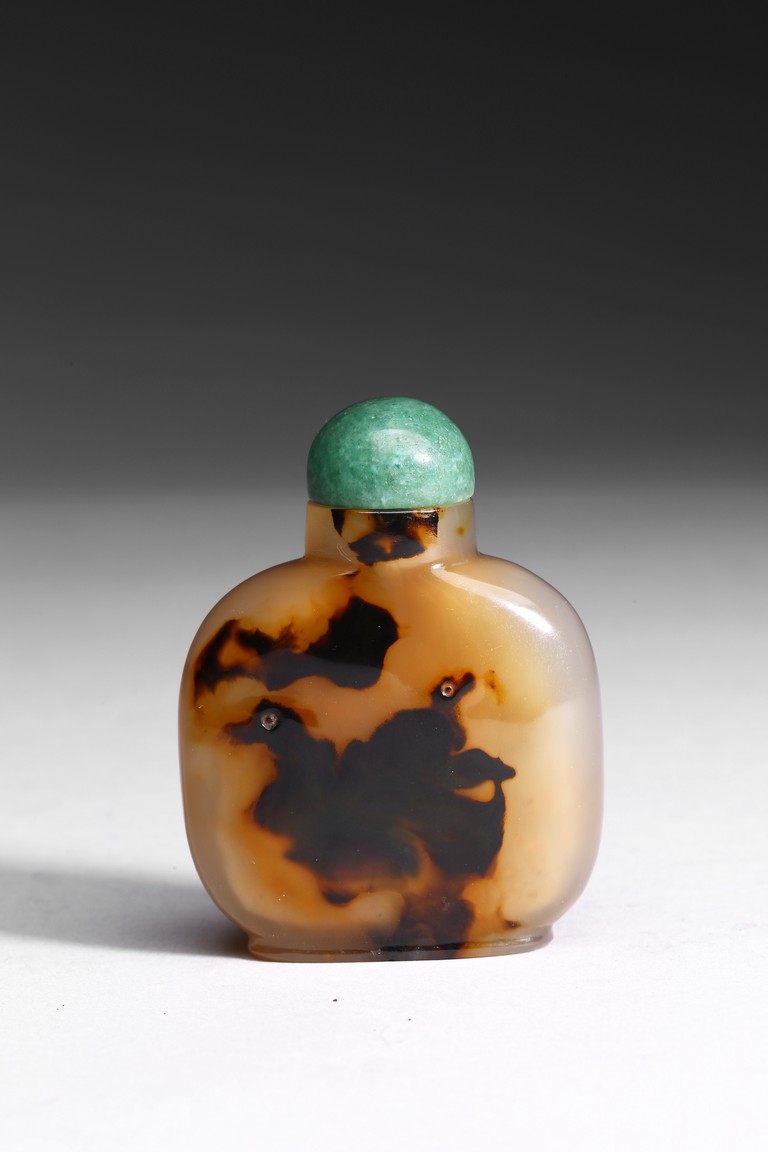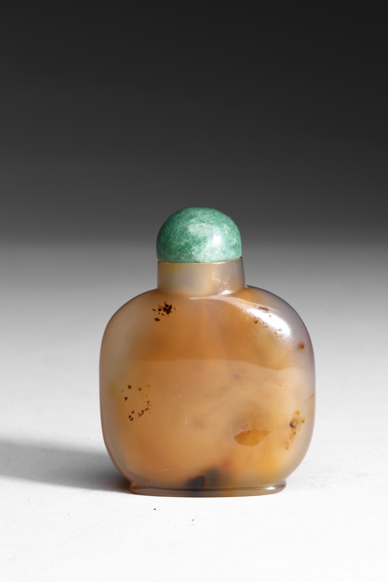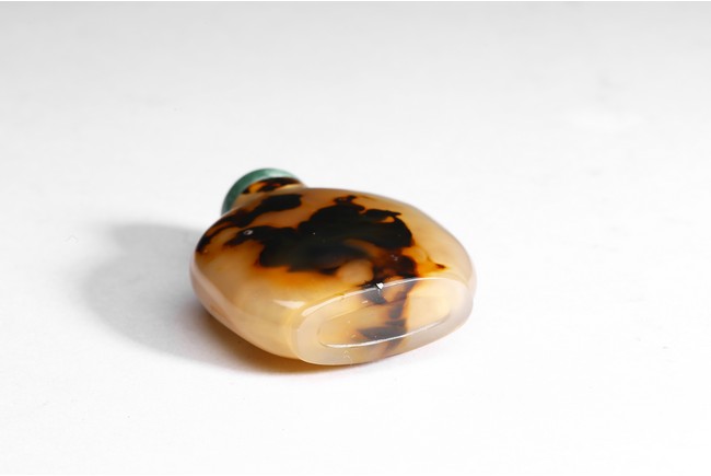 Of well hollowed, flattened rounded square form, the inclusions on one side carved to suggest two swimming opposing each other in a pond. Qing Dynasty period.