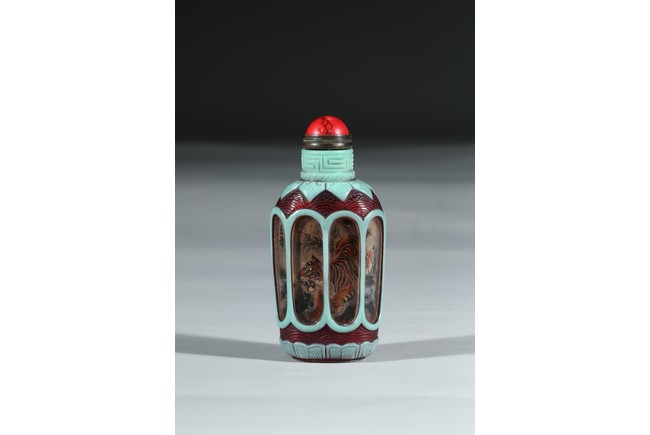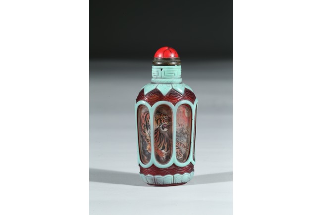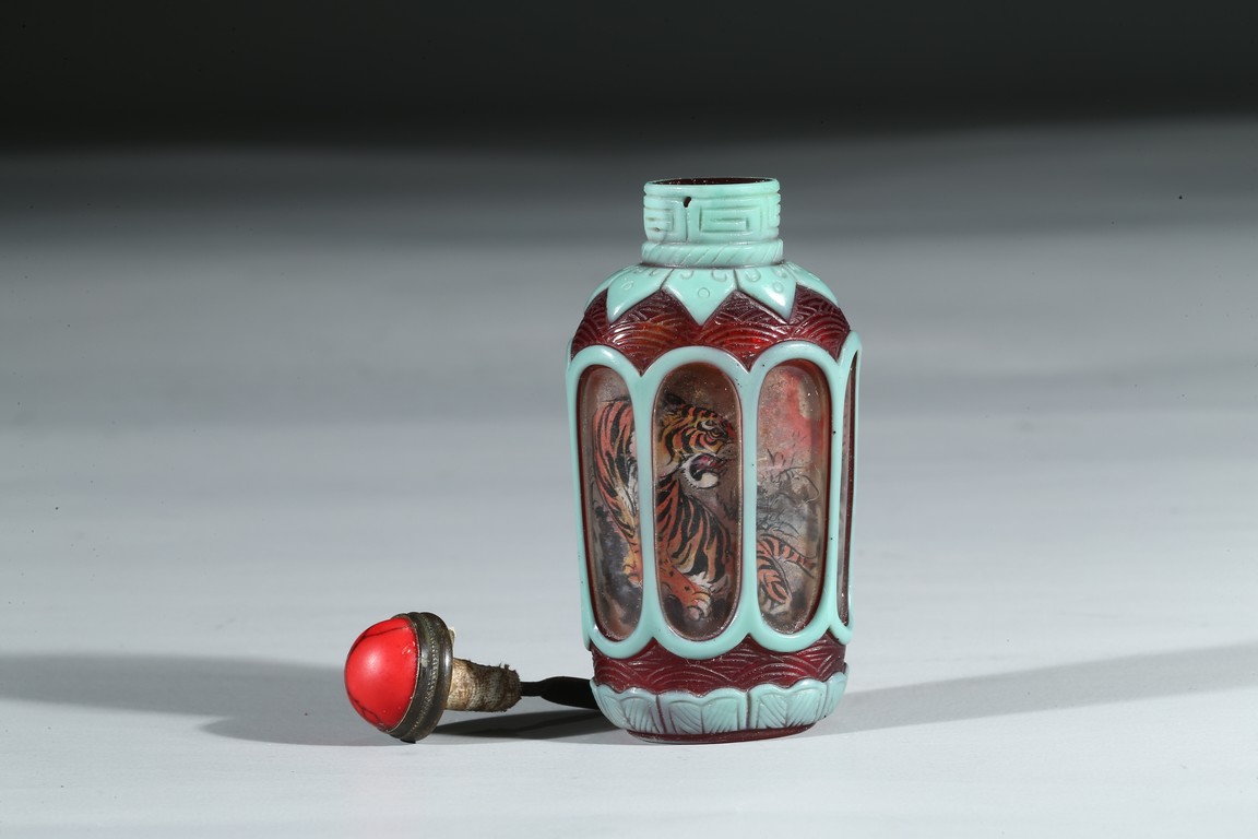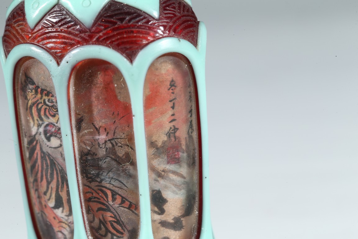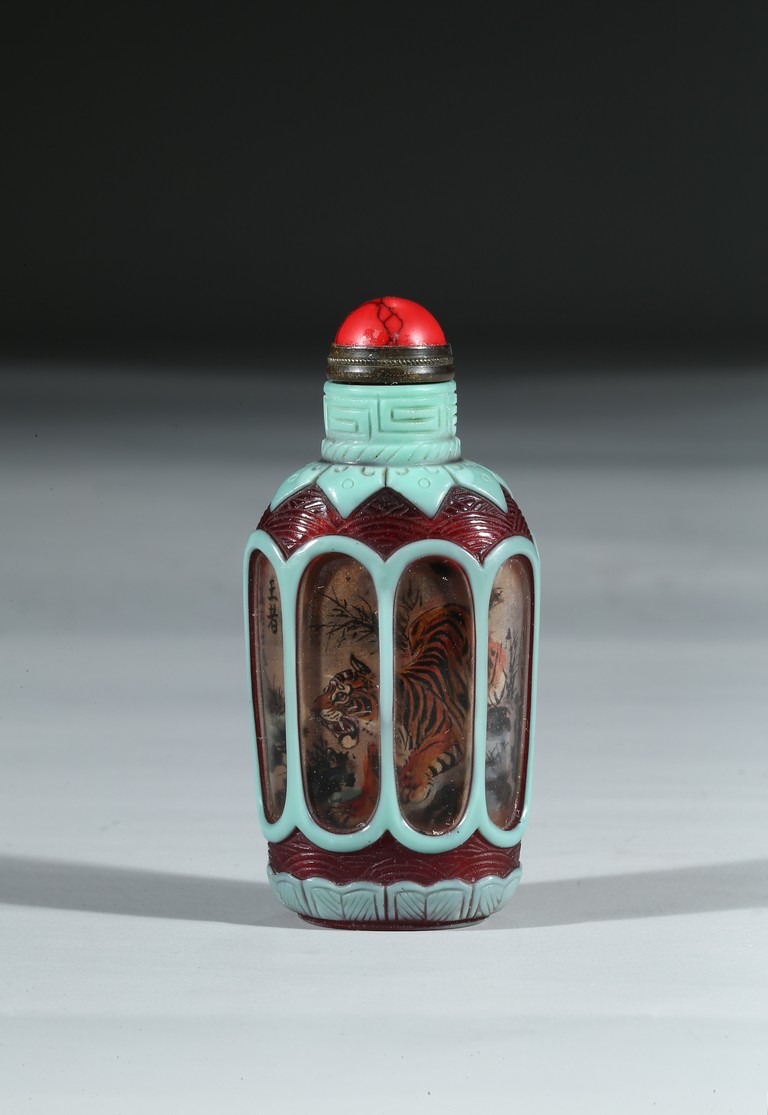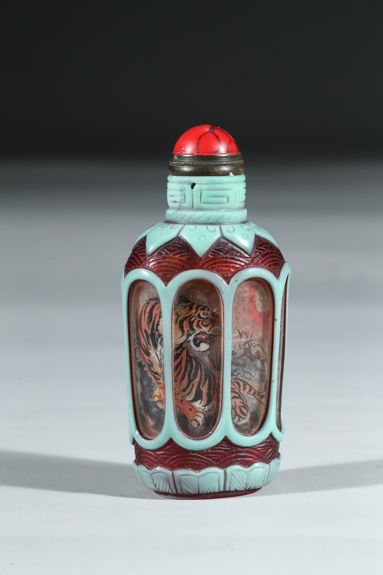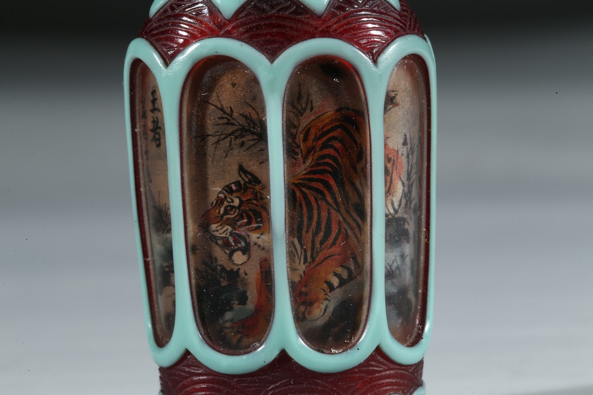A GLASS AND INSIDE PAINTED SNUFF BOTTLE 料器內畫虎圖鼻煙壺