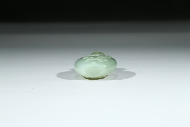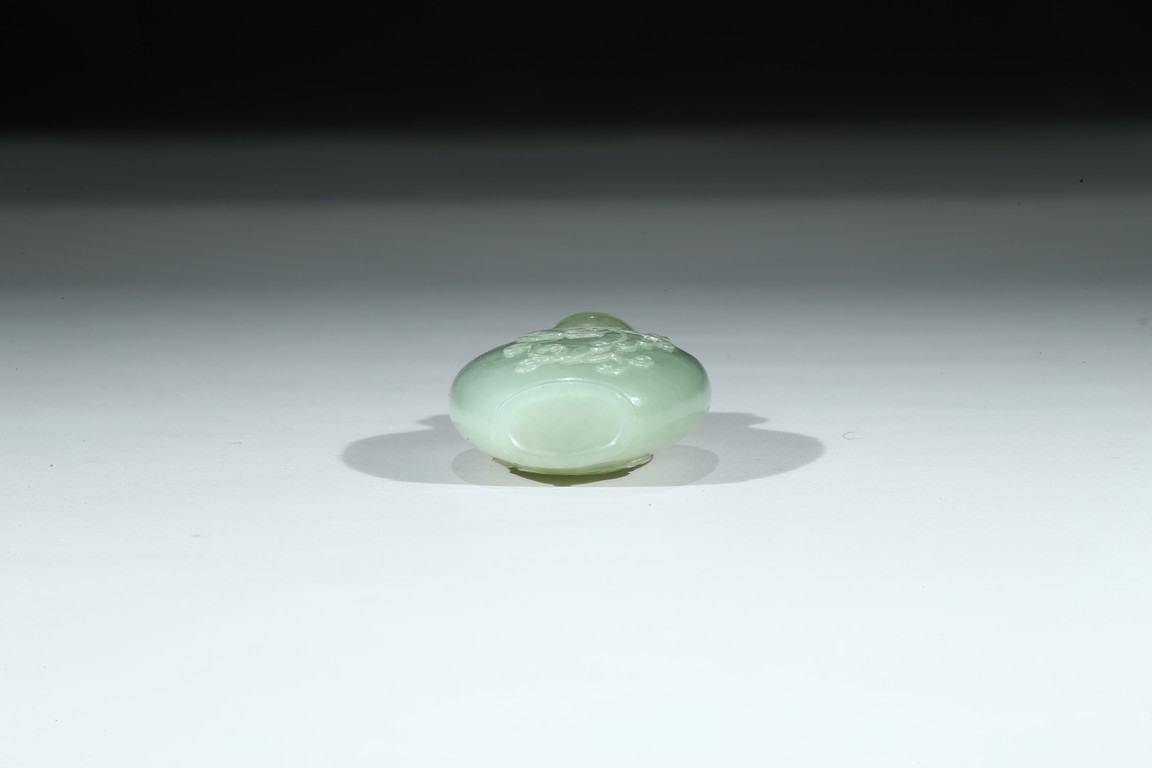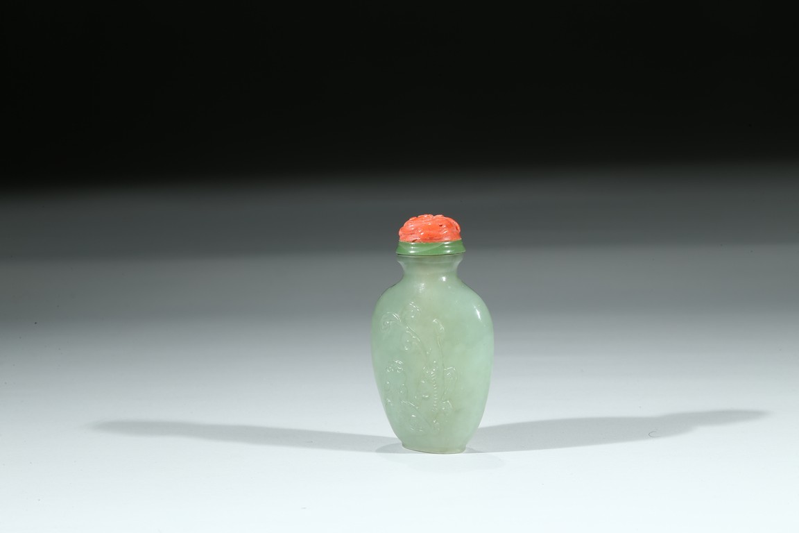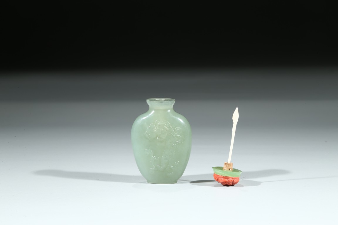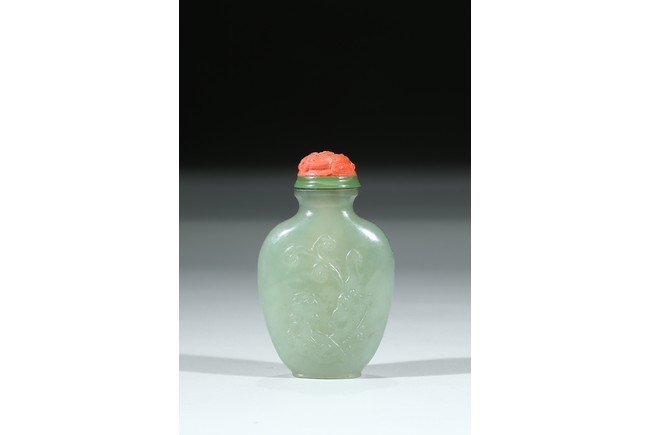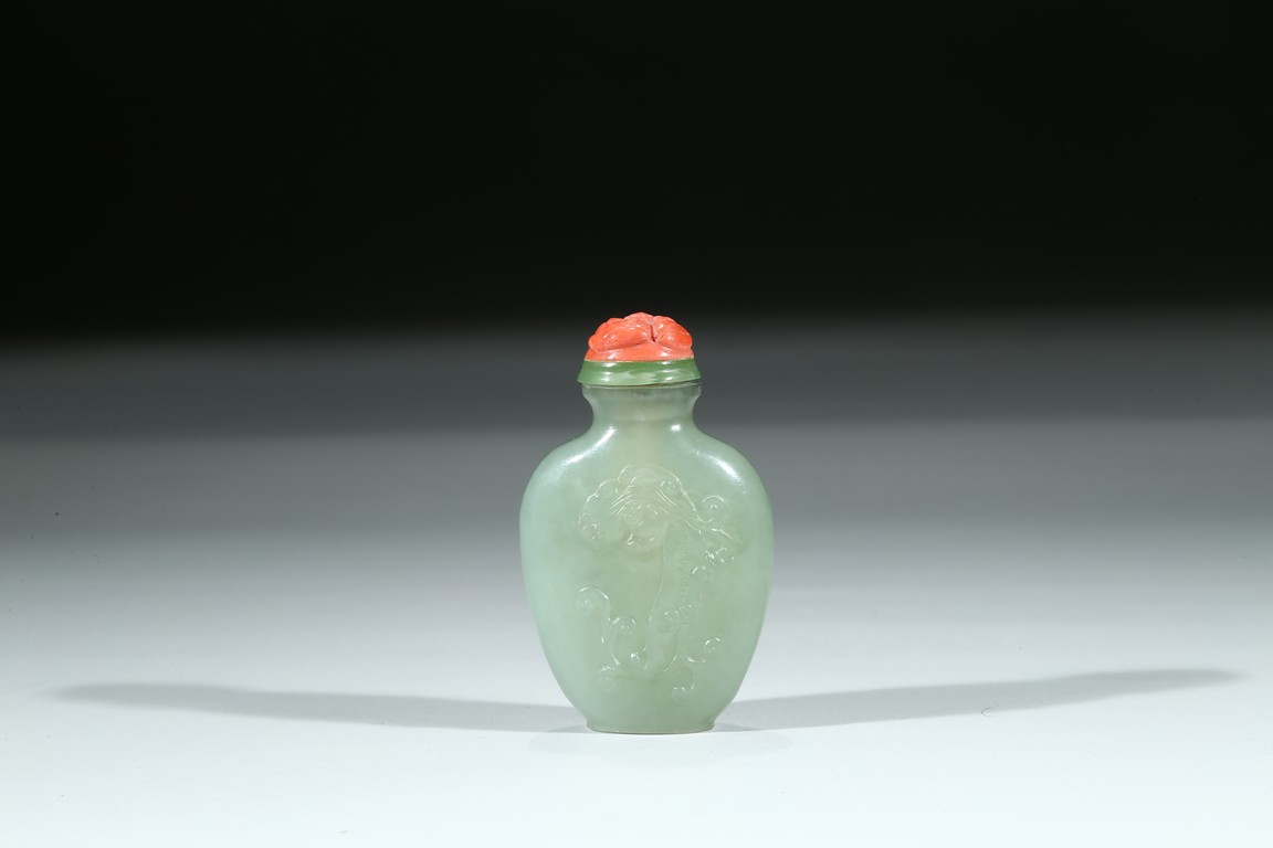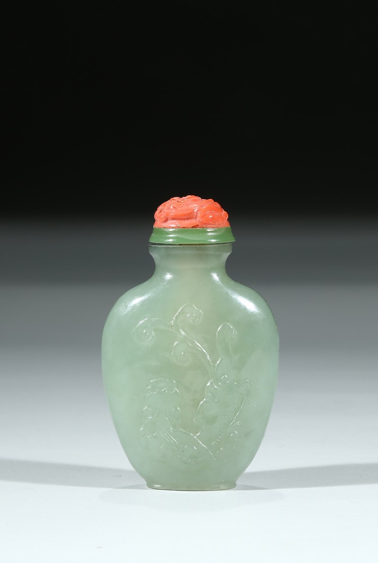 Of flattened rounded rectangular form, body carved in shallow relief with sinuous chilong, fitted with coral stopper. Qing Dynasty period.