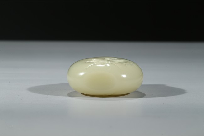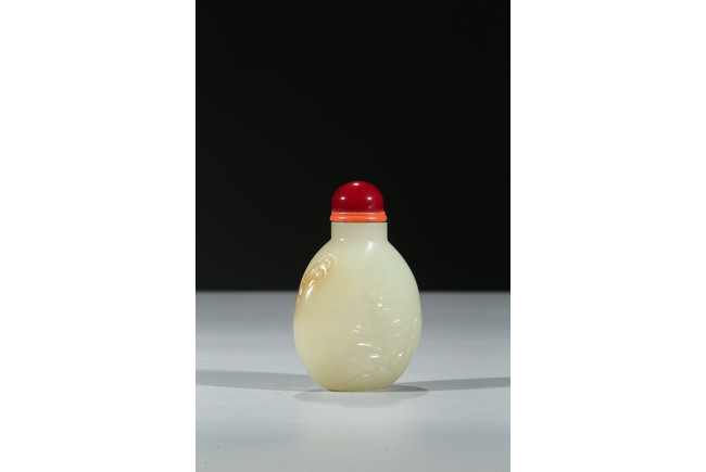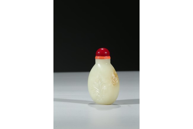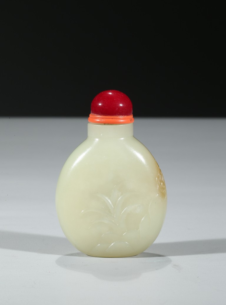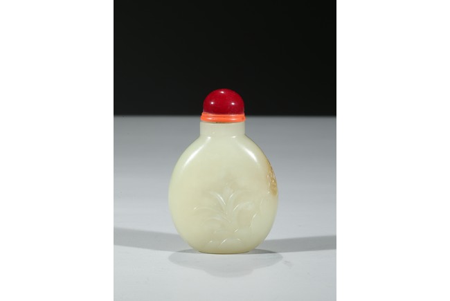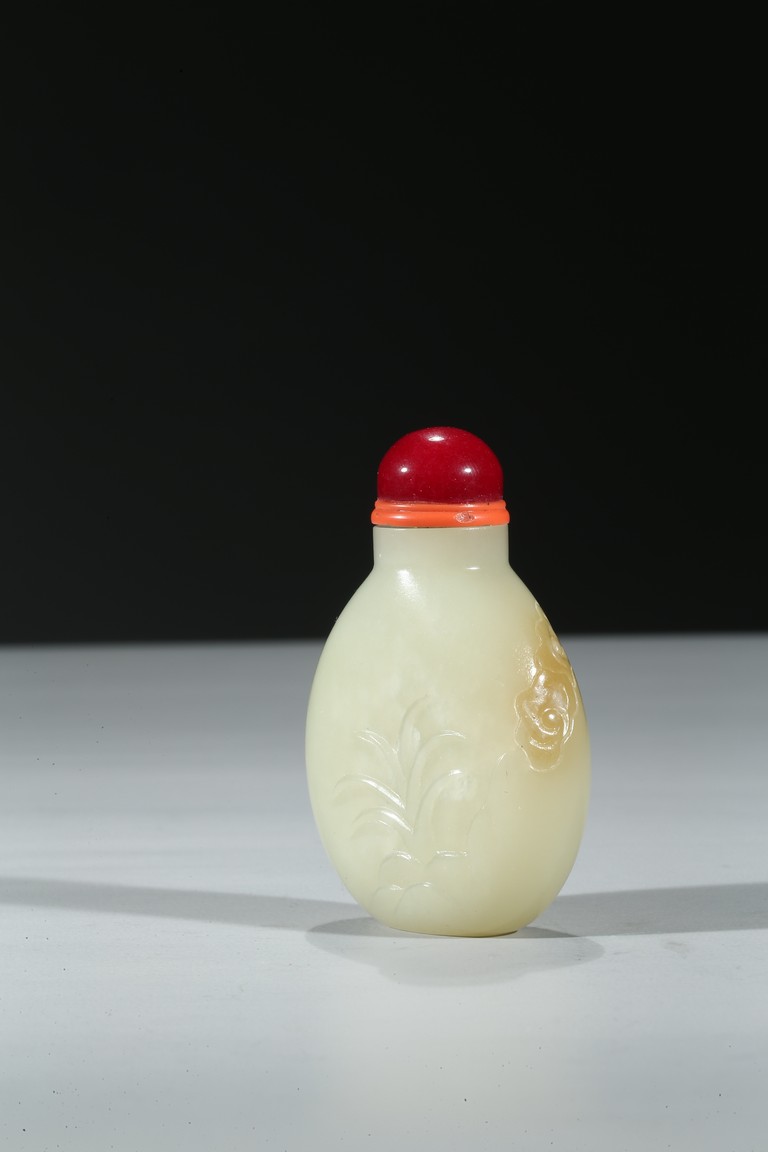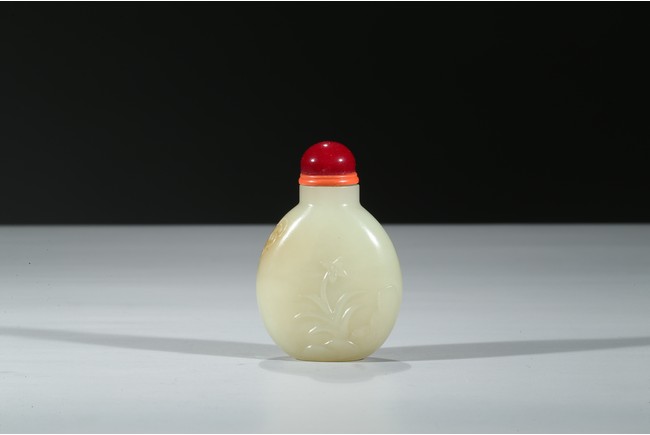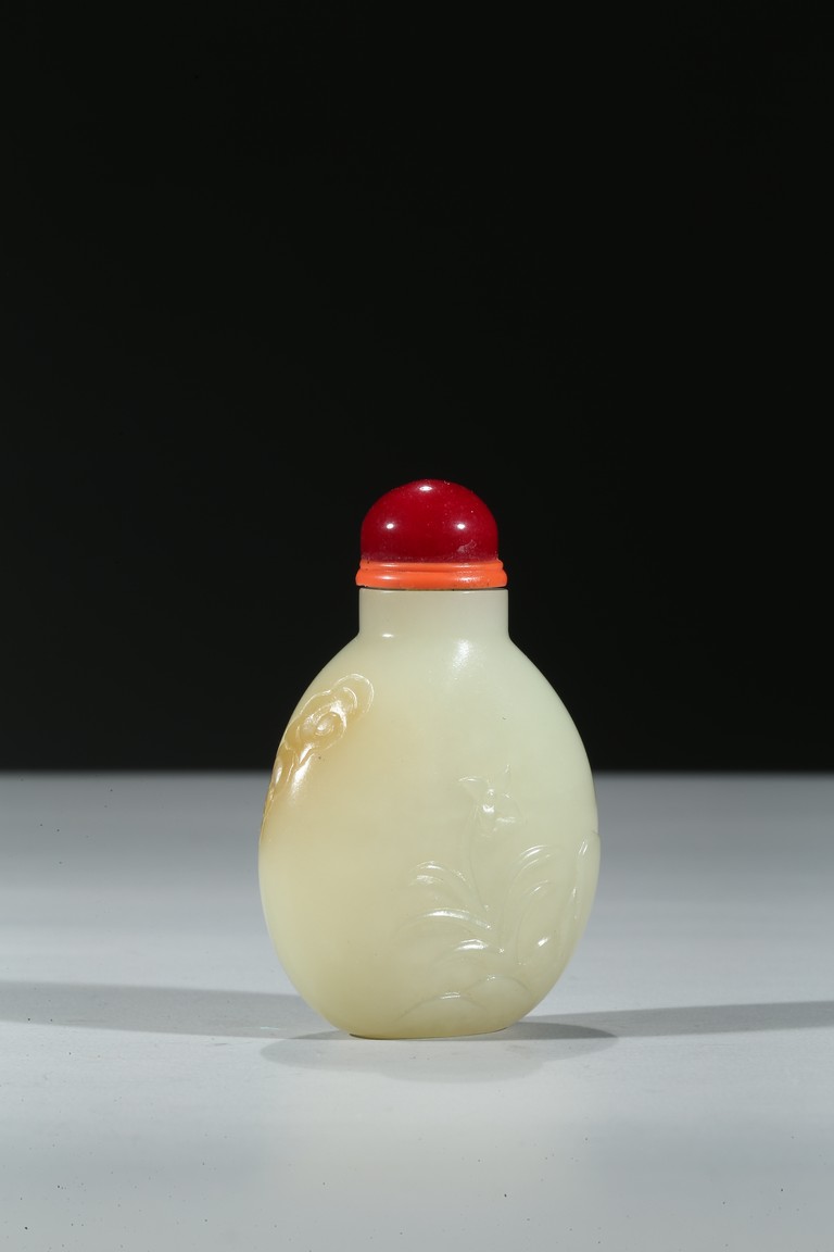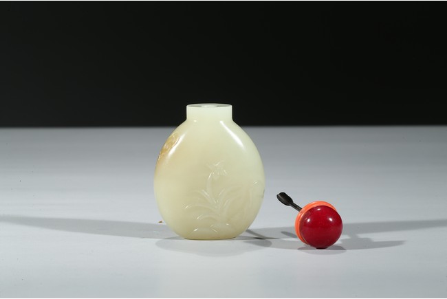 Of ovoid shape, the bottle is carved with orchid in relief on front and reverse. fitted with stopper. Qing Dynasty period.