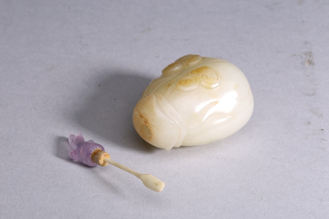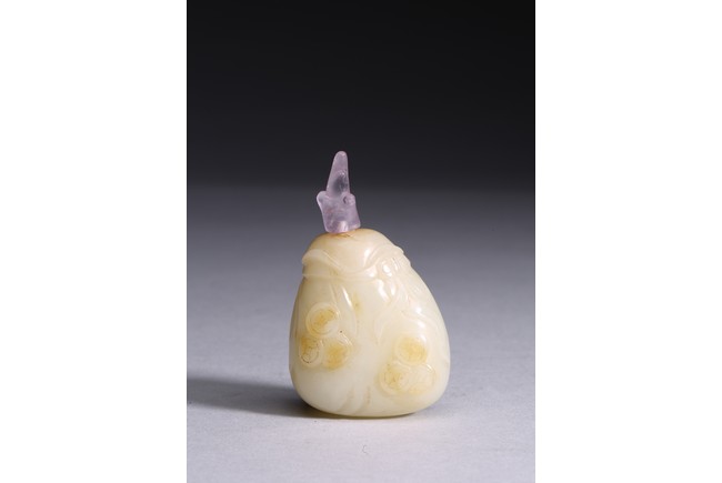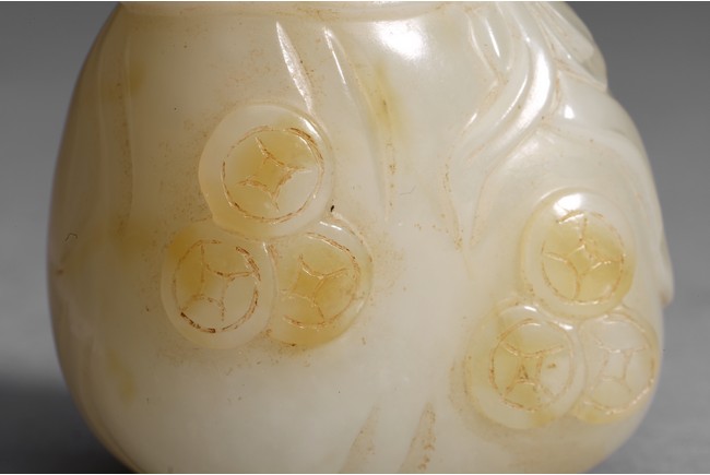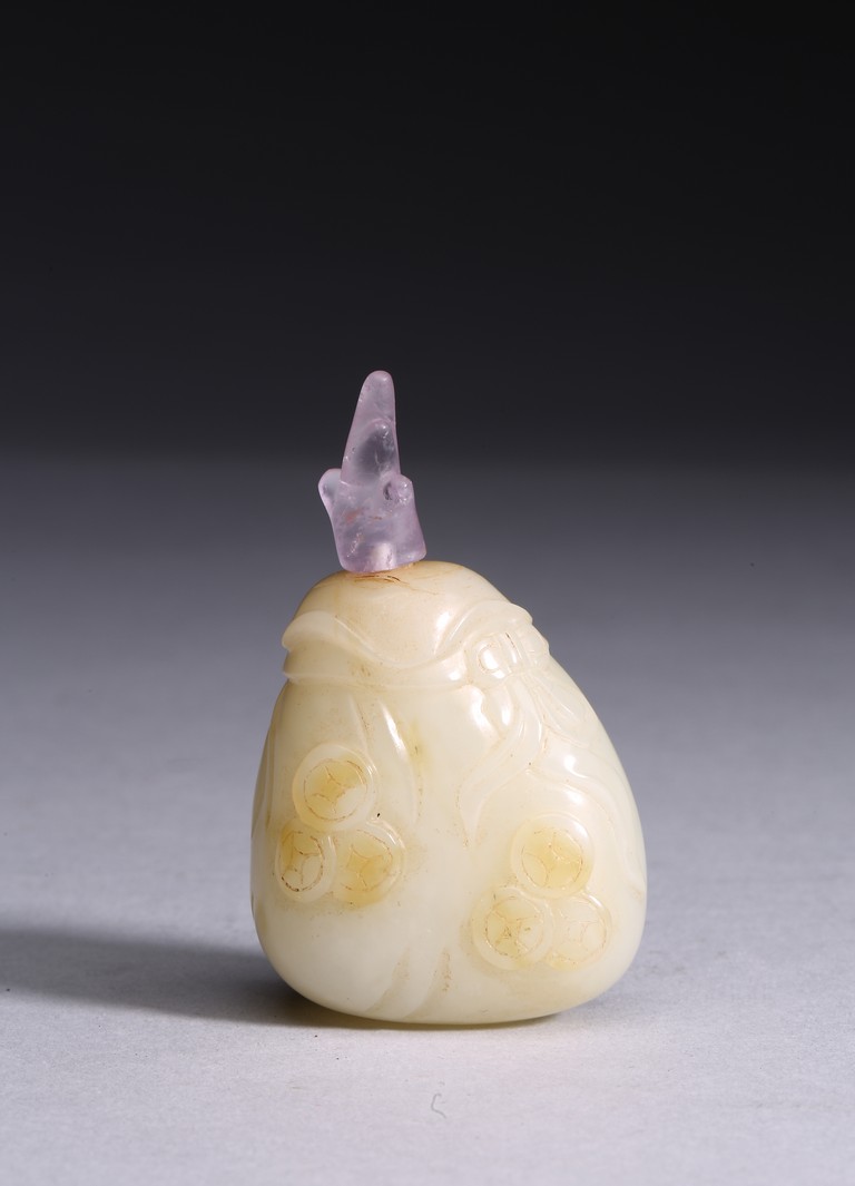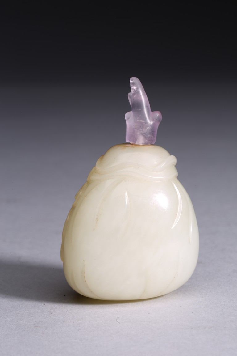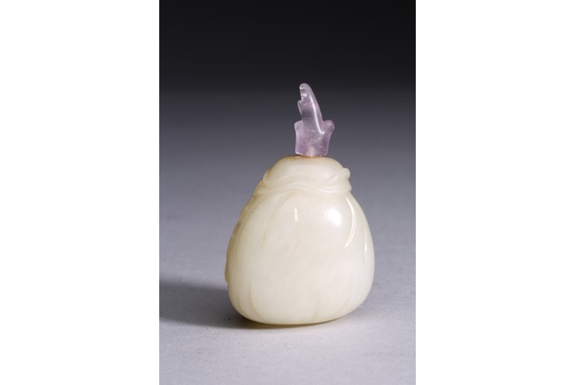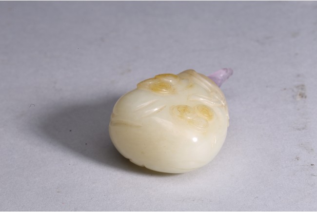 Modelled in the form of coin bag, the stone is of polished white tone with slight russet skin. Qing Dynasty period.