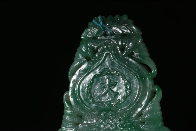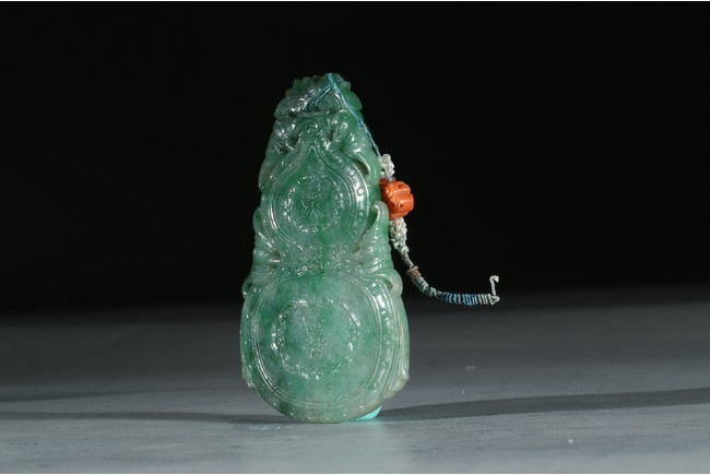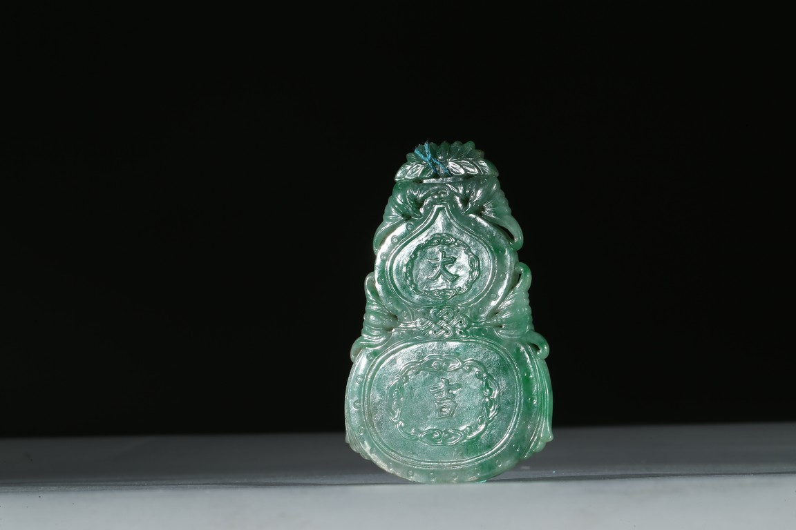 葫蘆型,種質細膩潤澤,顏色濃厚,線條流暢。葫蘆內分別裝飾“大吉”、“天喜”,字體蒼勁有力,筆鋒迴轉之處流暢舒展。“大吉”字樣與“葫蘆”造型相配合的設計是清代較為典型及常用的吉祥圖案,象徵福祿綿長、子孫萬代、大吉大利。