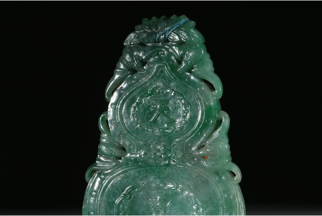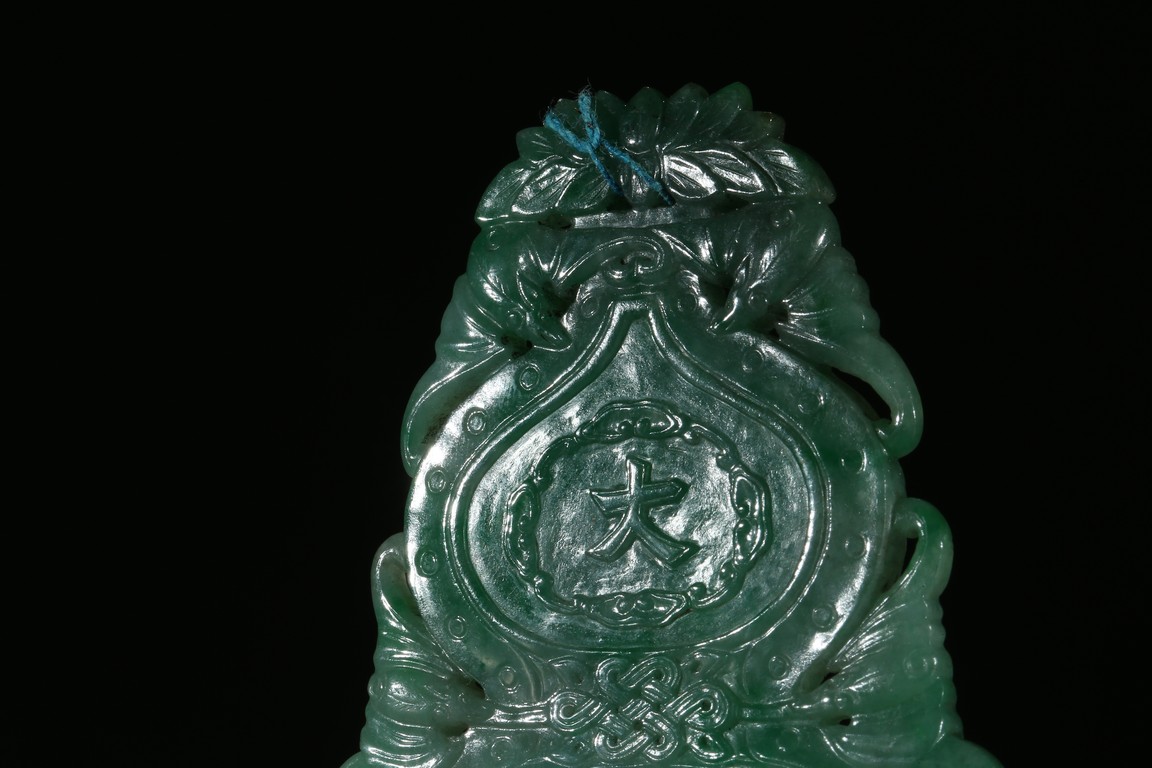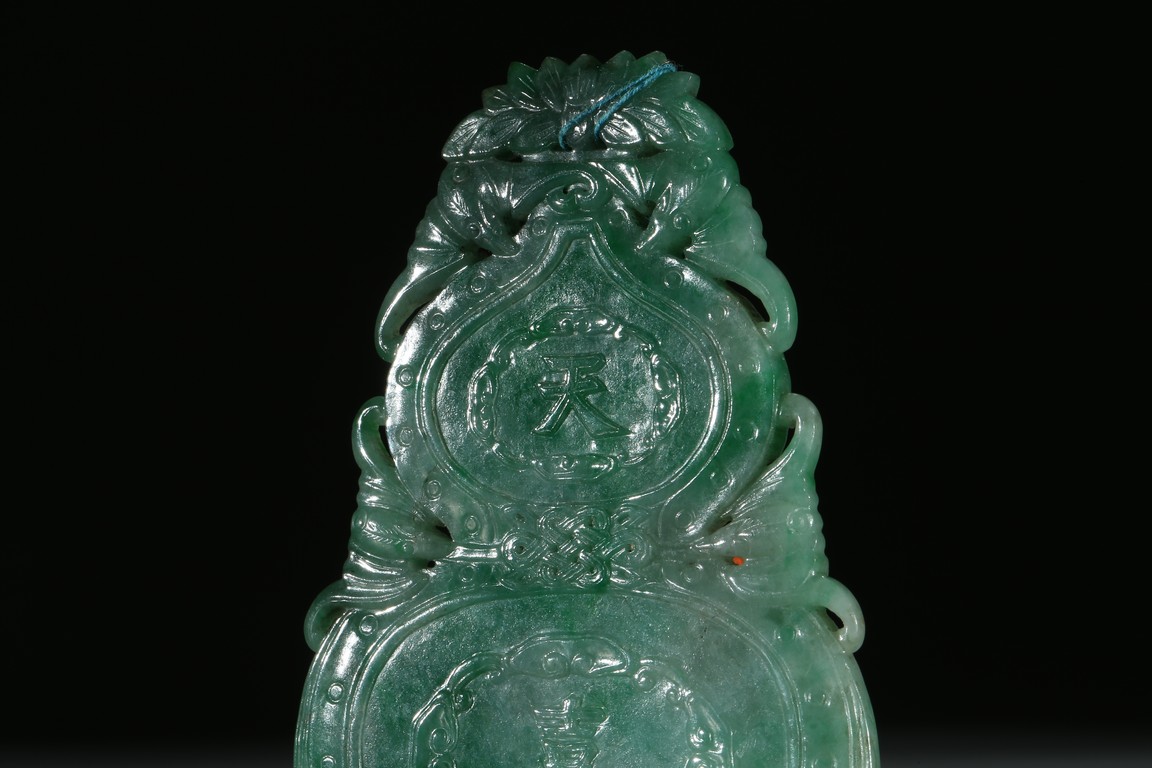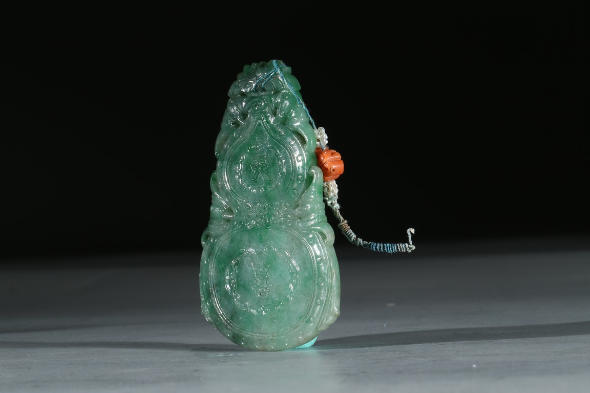 Carved and pierced with the gourd flanked with flying bats, the front inscribed with the characters da ji in low relief, the reverse with two characters tian xi. Qing Dynasty period.