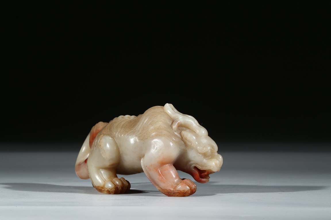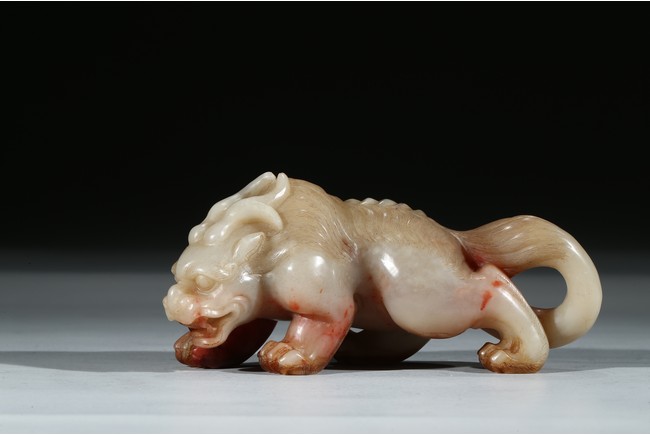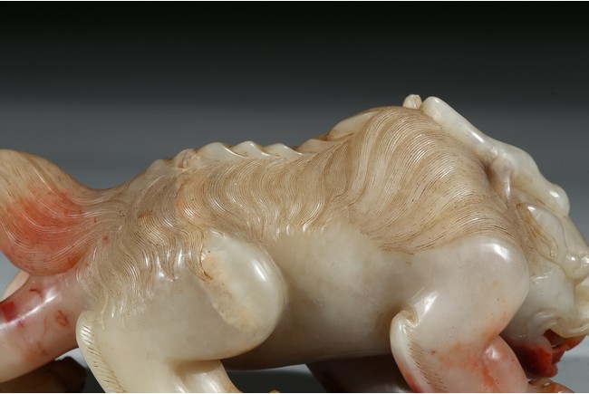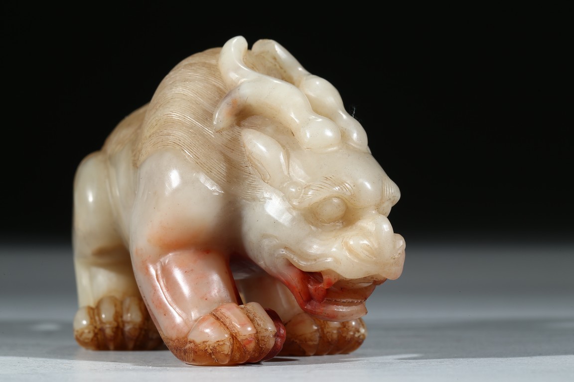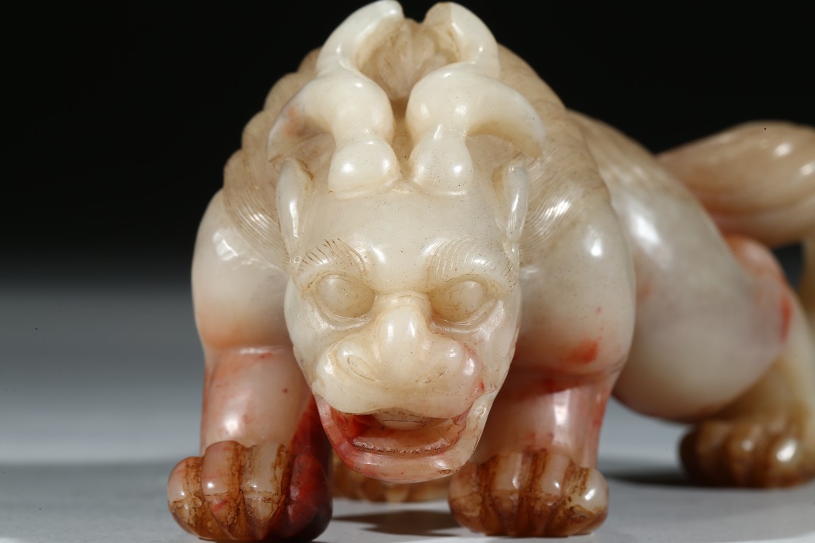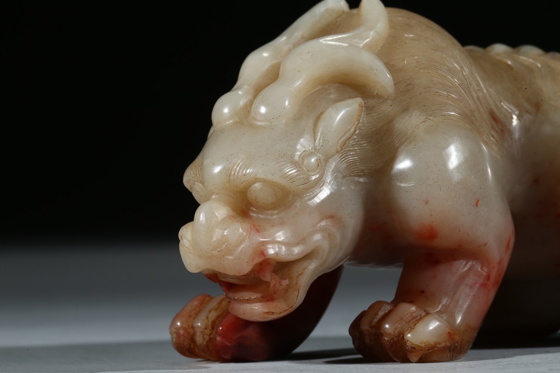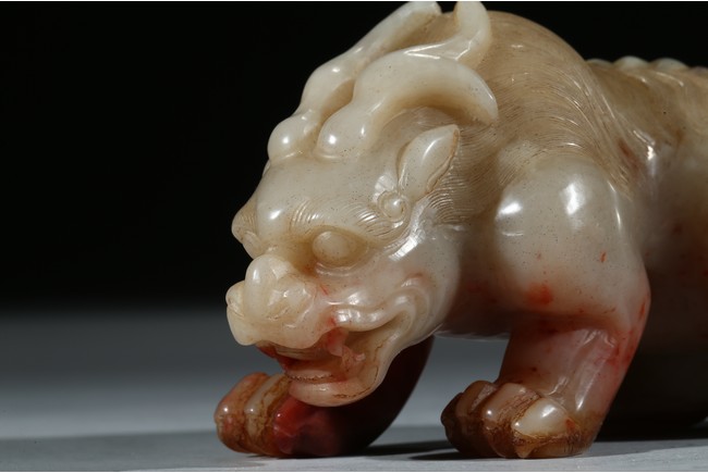取天然凍石,其質地如脂凝凍,潤透通靈。圓雕為瑞獸擺件,毫不吝材,以求造型之美態。瑞獸形體健碩,作行走狀,四肢前屈,頭部高昂,背部下凹,臀部隆起。雕刻技法精美,活靈活現,逼真傳神,昂首屈肢,目視前方,張牙露齒。整器造型別緻,端莊大氣,惟妙惟肖。