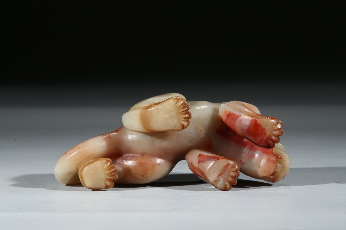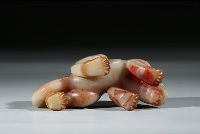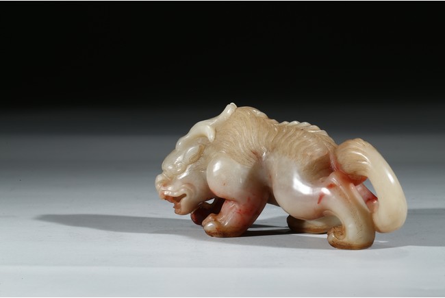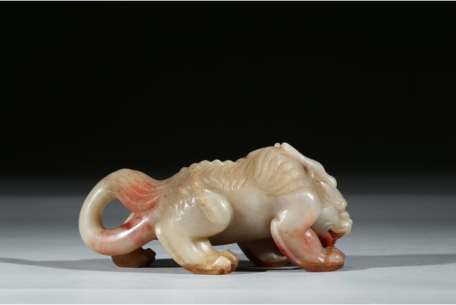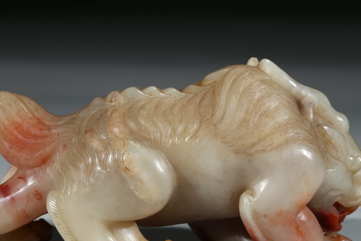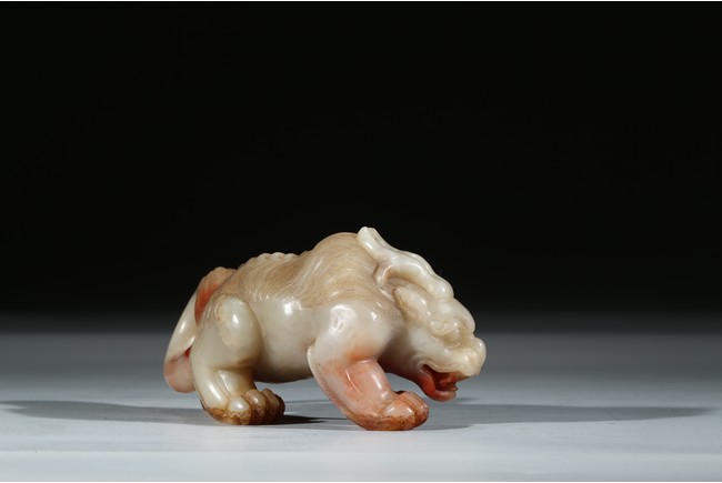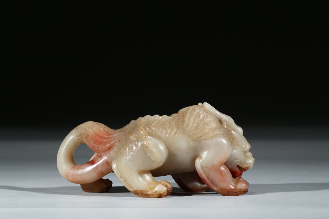取天然凍石,其質地如脂凝凍,潤透通靈。圓雕為瑞獸擺件,毫不吝材,以求造型之美態。瑞獸形體健碩,作行走狀,四肢前屈,頭部高昂,背部下凹,臀部隆起。雕刻技法精美,活靈活現,逼真傳神,昂首屈肢,目視前方,張牙露齒。整器造型別緻,端莊大氣,惟妙惟肖。