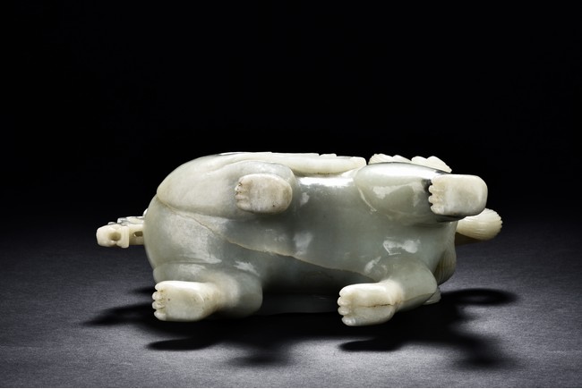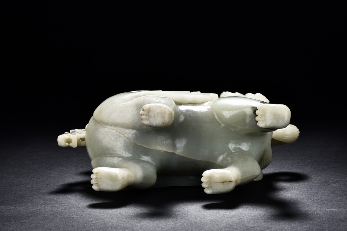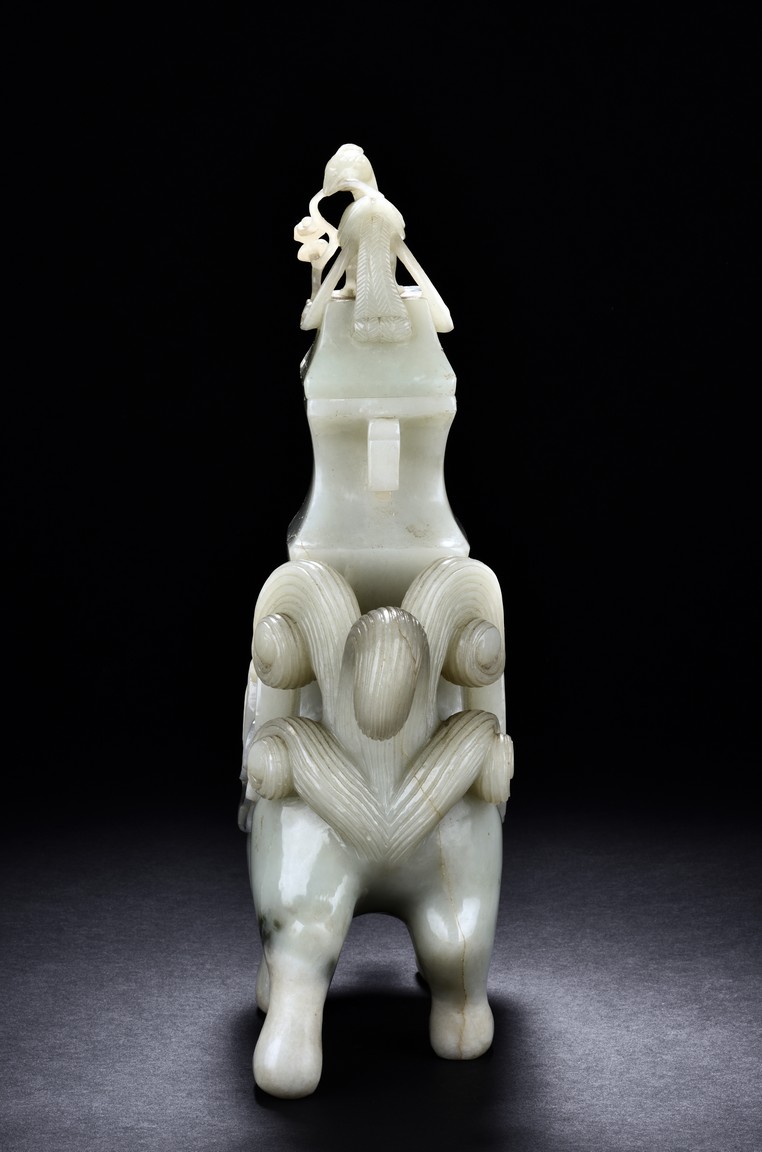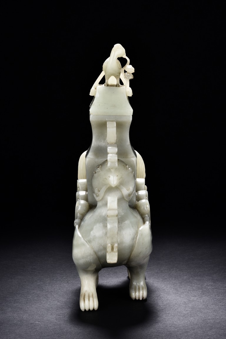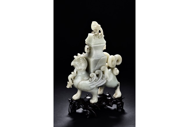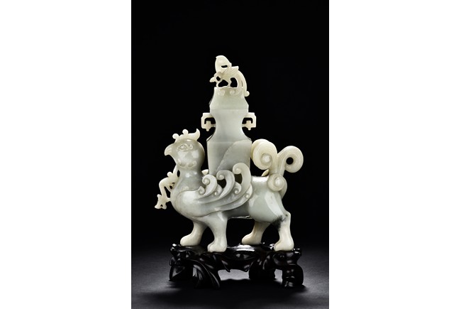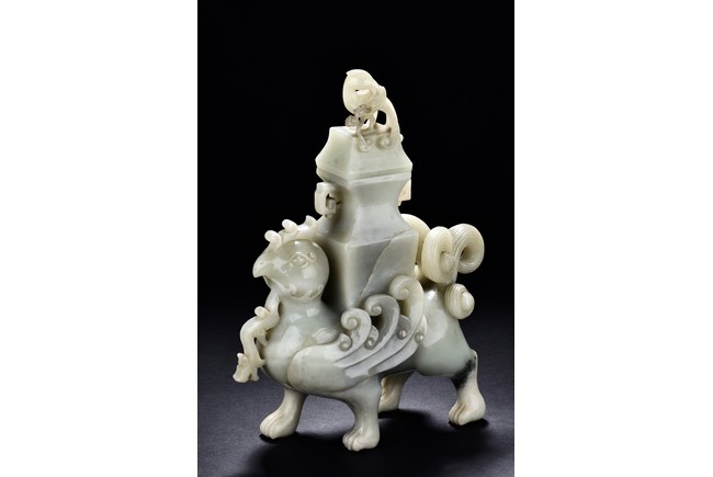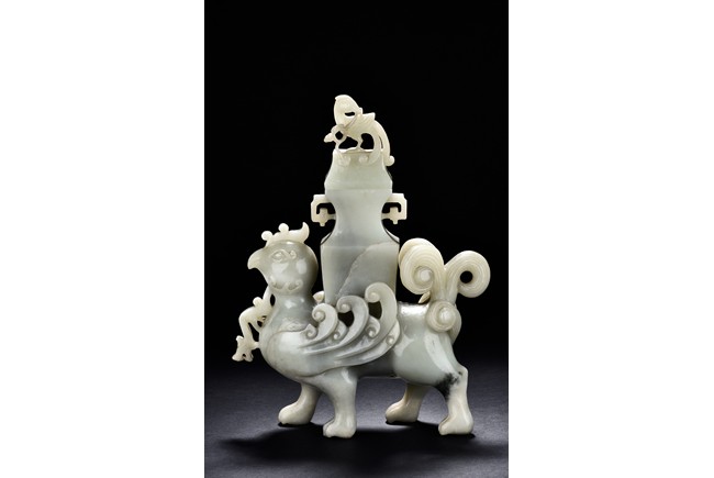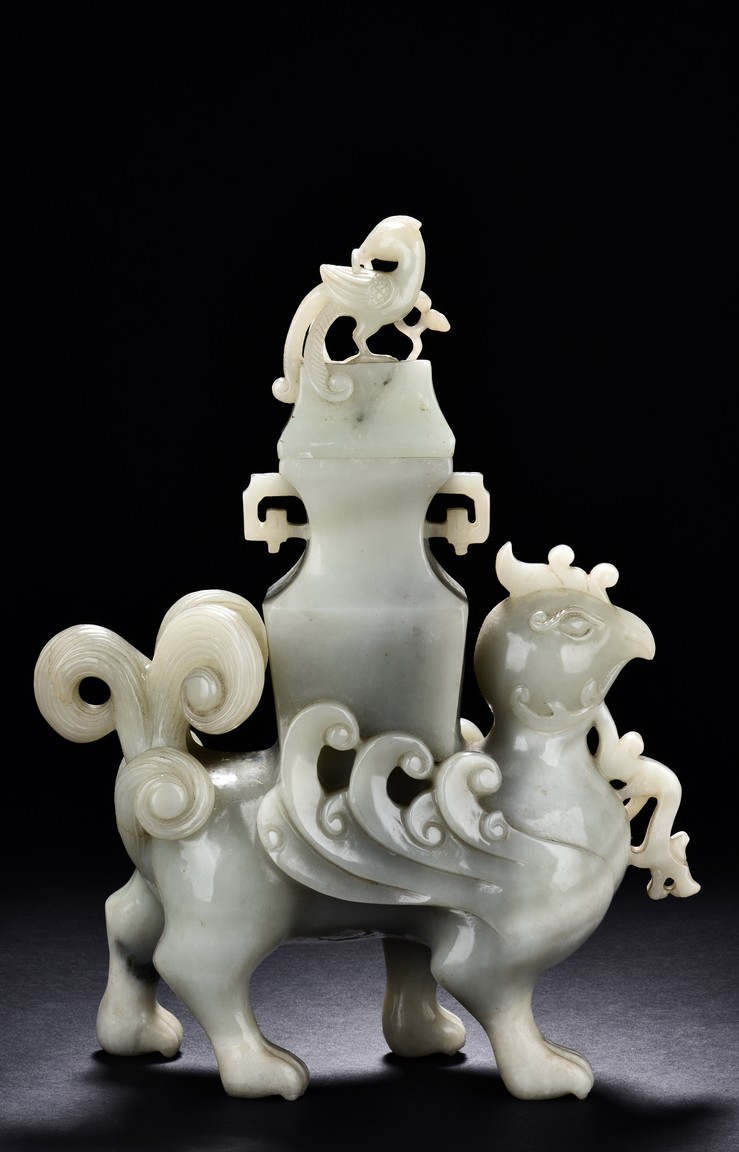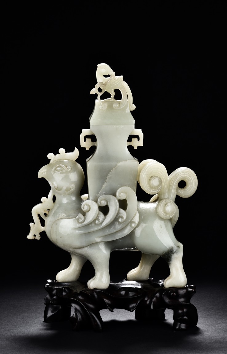 Modelled in the form of a mythical beast standing foursquare, looking straight forward, the wings curled up, the tails splitting into five curled branches , its back rests an lidded vase with recessed neck flanked by handles, the cover surmounted with a phoenix figure with long tails grasping a lingzhi branch in the mouth.