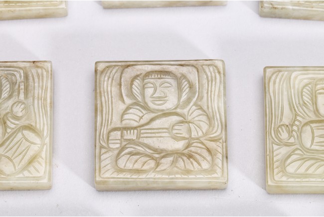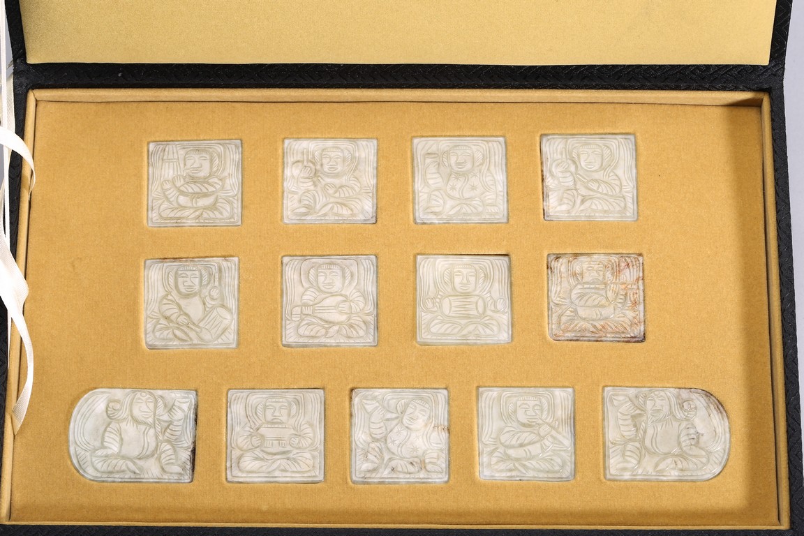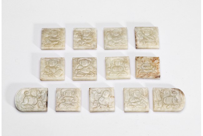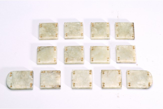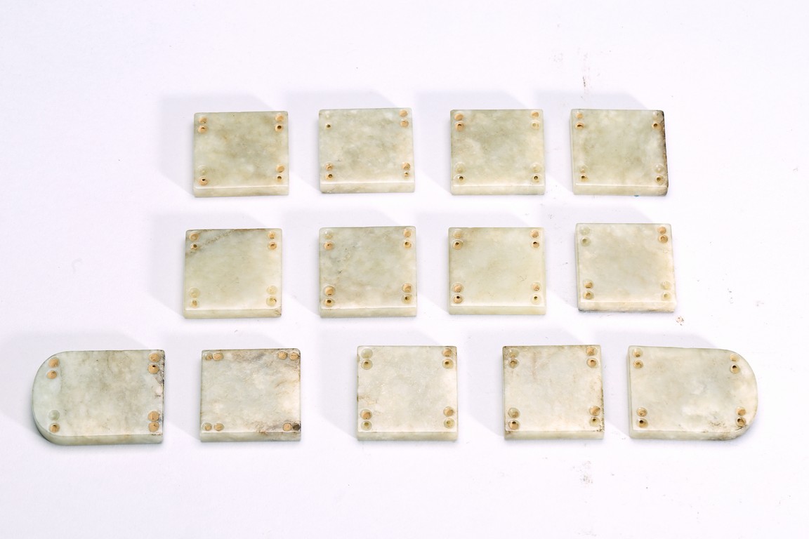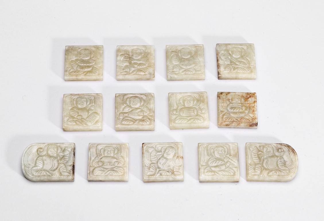 Consisting of thirteen square shaped jade panels, each depicting a shallow relief design of figure playing different music instrument, the reverse with two drilled apertures on each of the four corners. Tang Dynasty period.