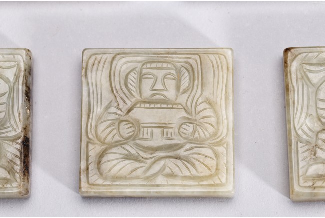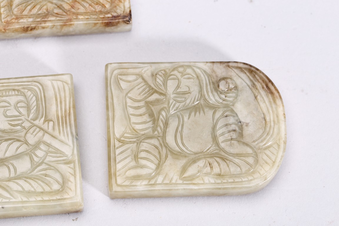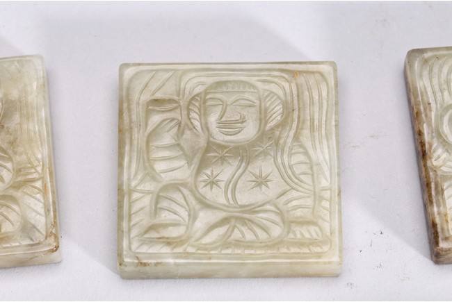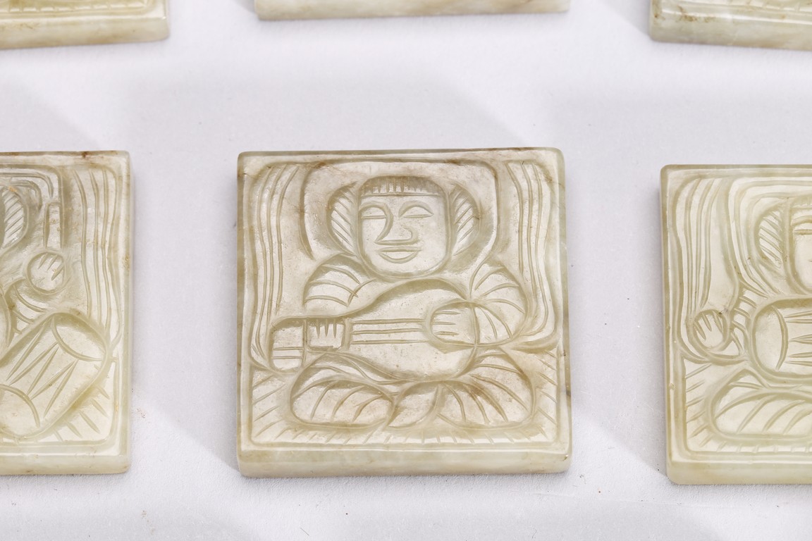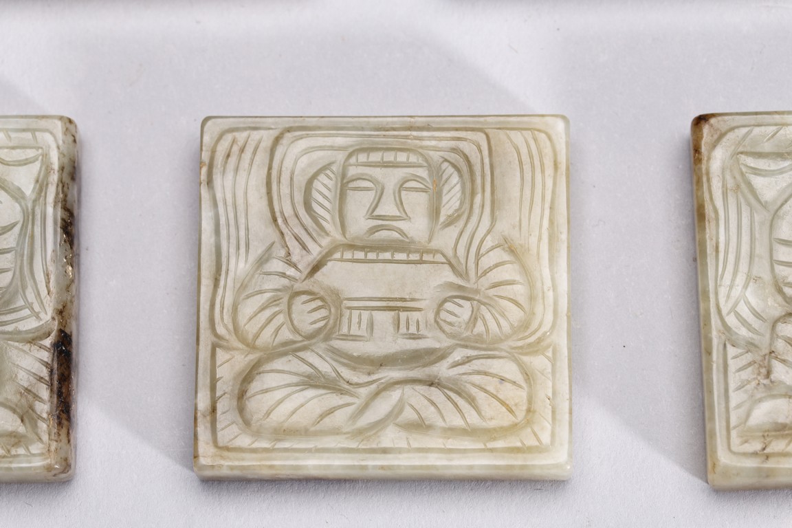 Consisting of thirteen square shaped jade panels, each depicting a shallow relief design of figure playing different music instrument, the reverse with two drilled apertures on each of the four corners. Tang Dynasty period.