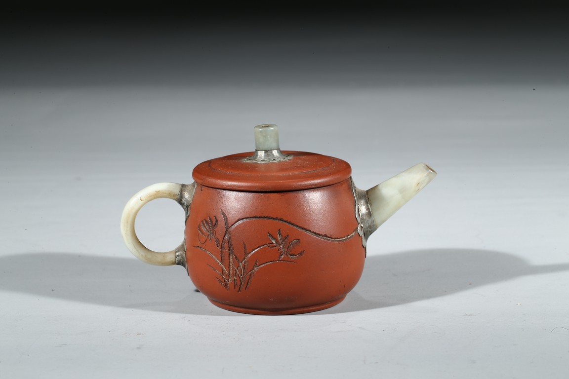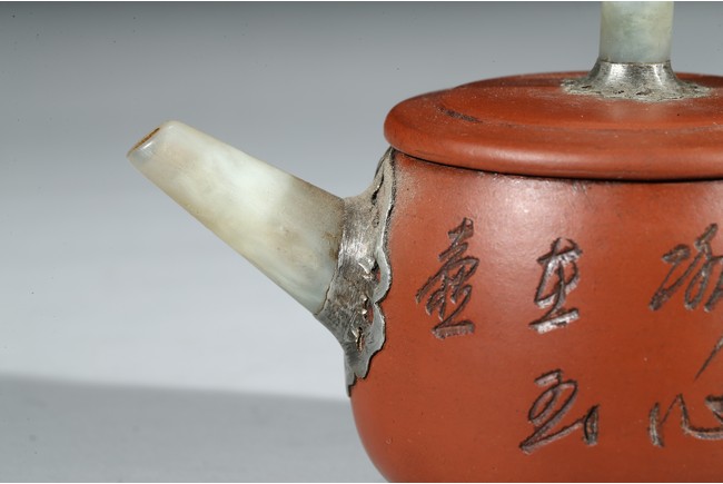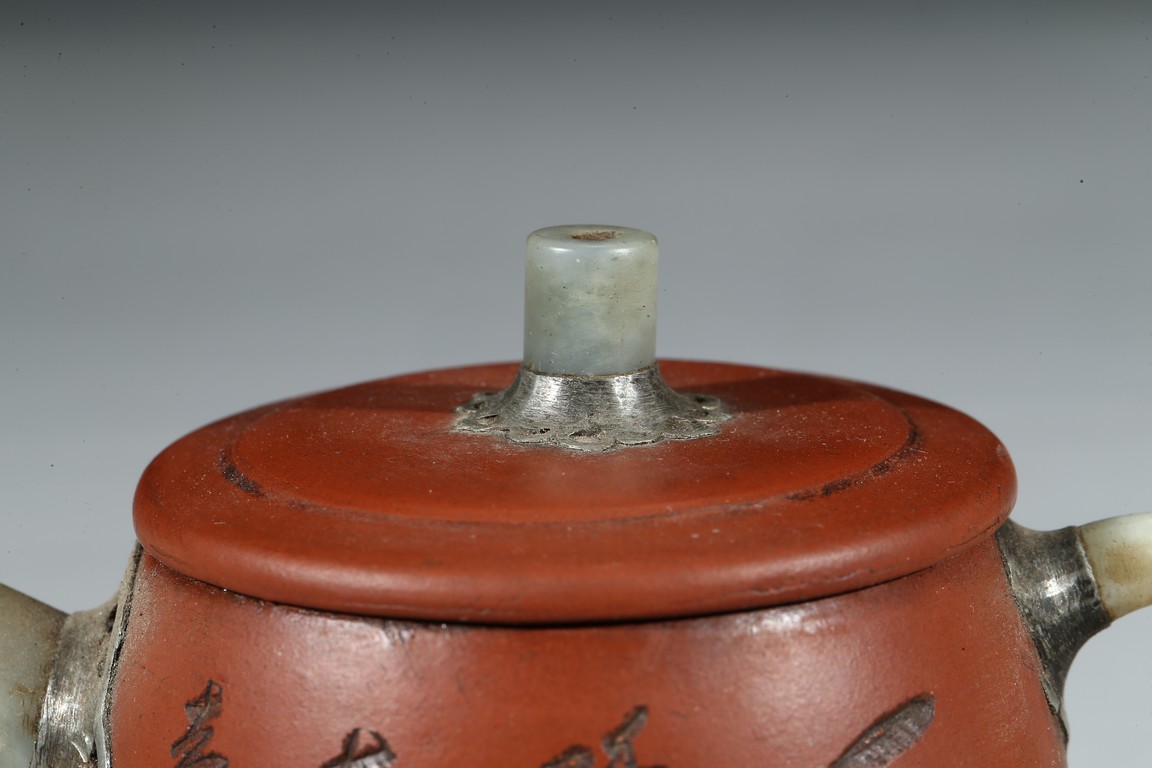 The teapot with finial, spout, and handle in jade, body and base inscribed.