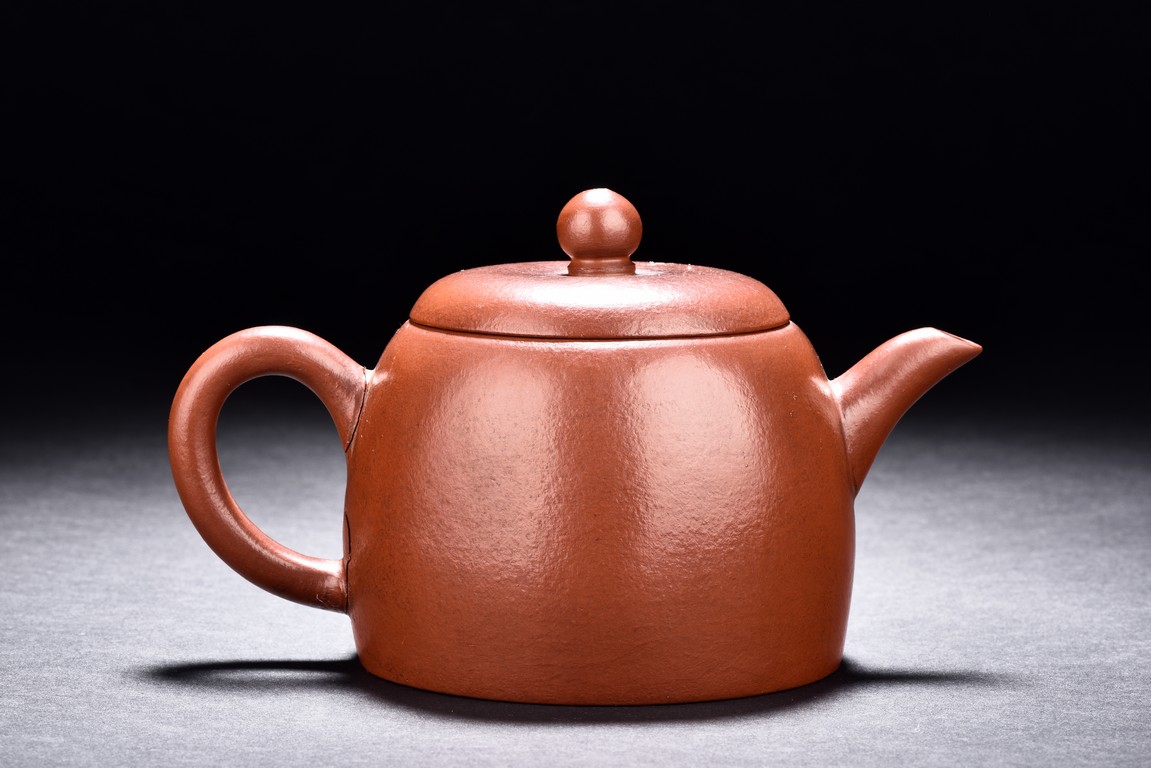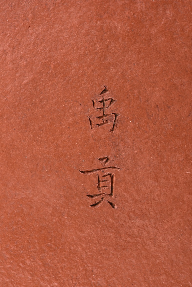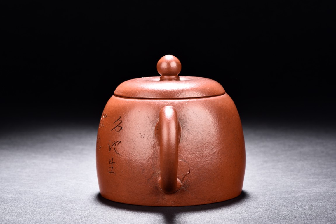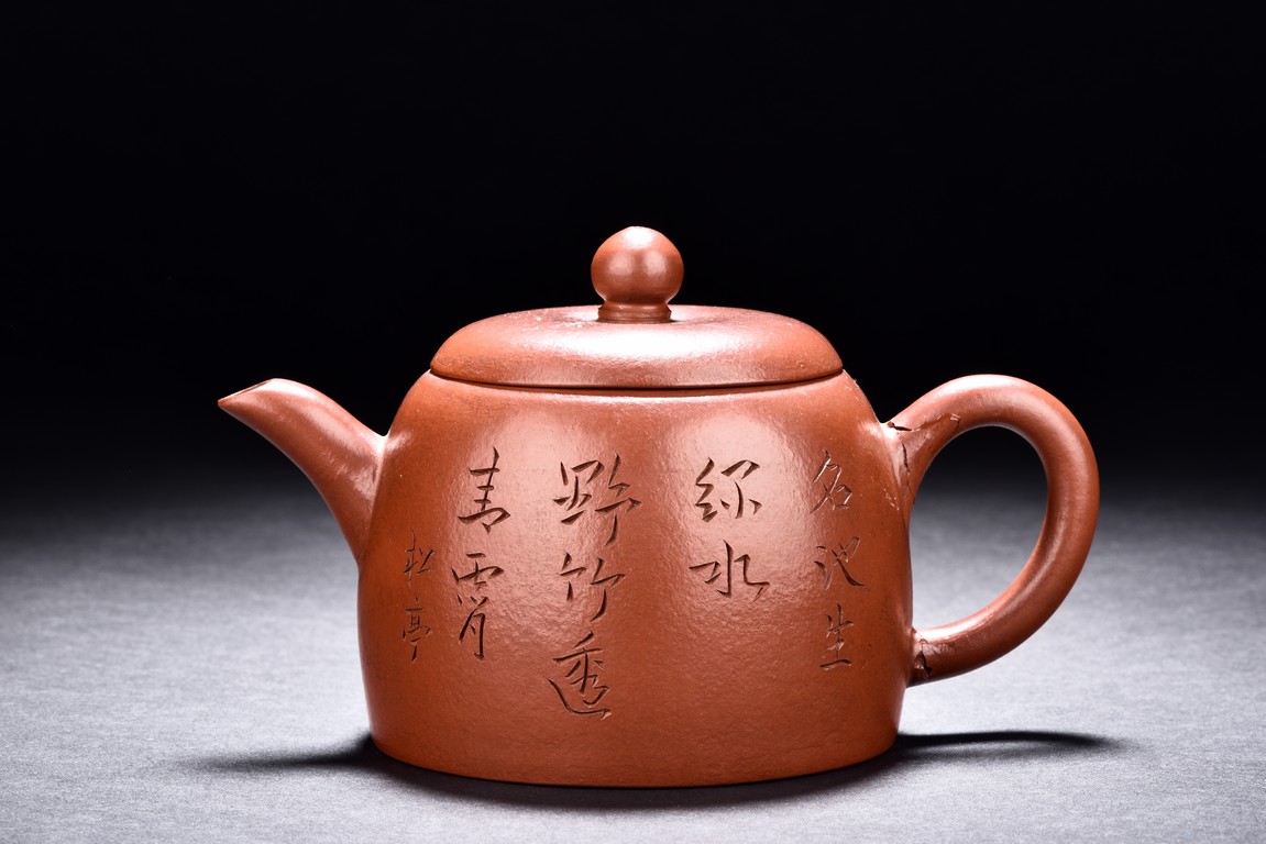 The teapot is incised with a poem on the body with two character colophone 'Song Ting', with ear-shaped round handle, curved spout. The bottom incised with two character 'Yu Gong'.