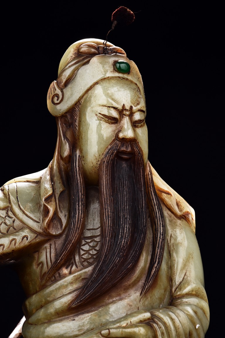 The figure is shown holding his signature blade on righ hand, the left hand holding a scroll, the face with stern expression, with long beard falling to chest, wearing a hat embellished with gem bead. Qing Dynasty Period.