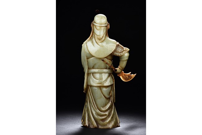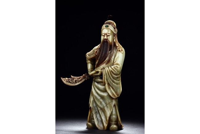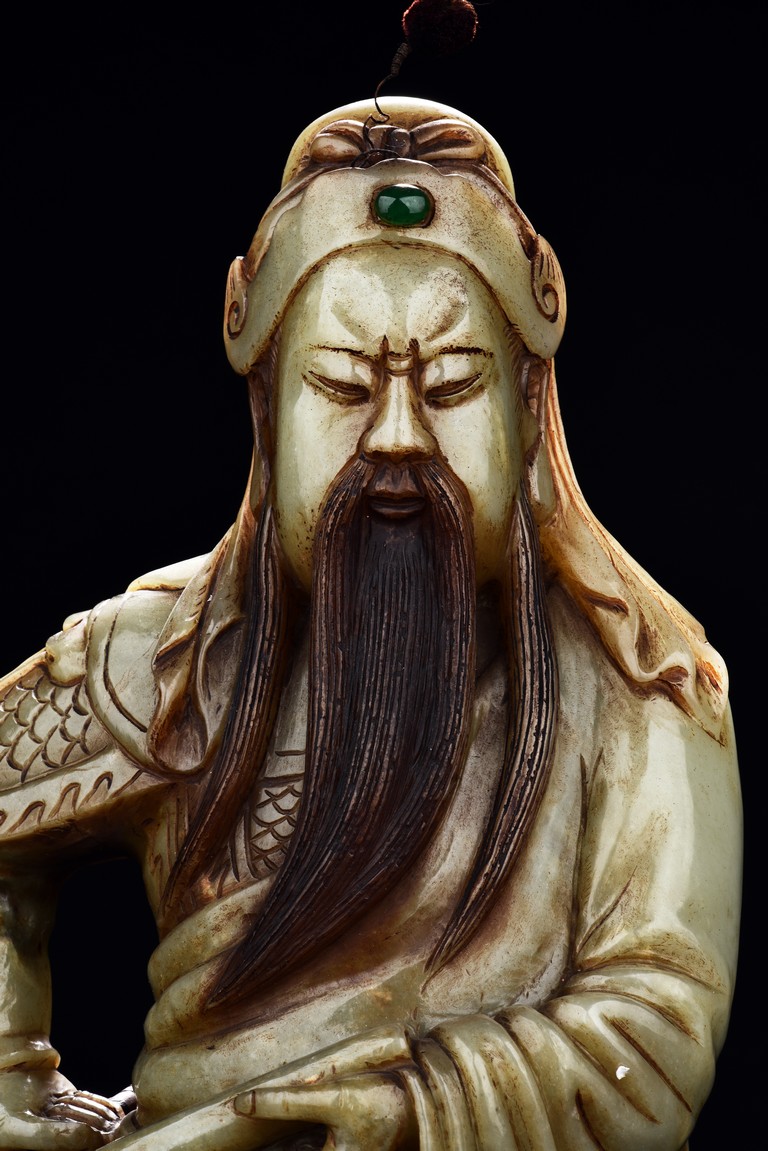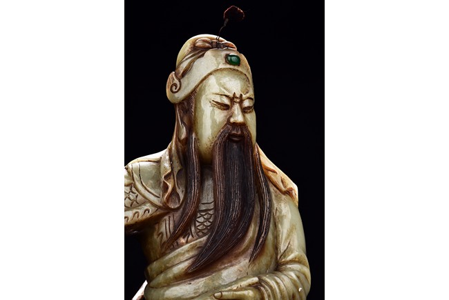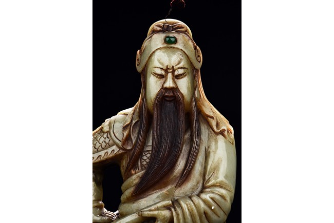 壽山石是傳統“四大名石”之一。關羽一生忠義勇武,忠貞不二,歷代帝王均將關羽當做“忠義”化身,由侯而王,旋而進帝,最後被尊為武聖人而受世人崇拜。立體圓雕關公站像,頭帶文帽,面容威嚴,三尺美髯垂胸,左手持書卷,右手持青龍偃月刀,刀身盤龍隱現。身披長衫,線條流暢自然,貼身而落,神采奕奕。整體造型生動刻畫準確,刀法熟練,真乃名家名作之風範。