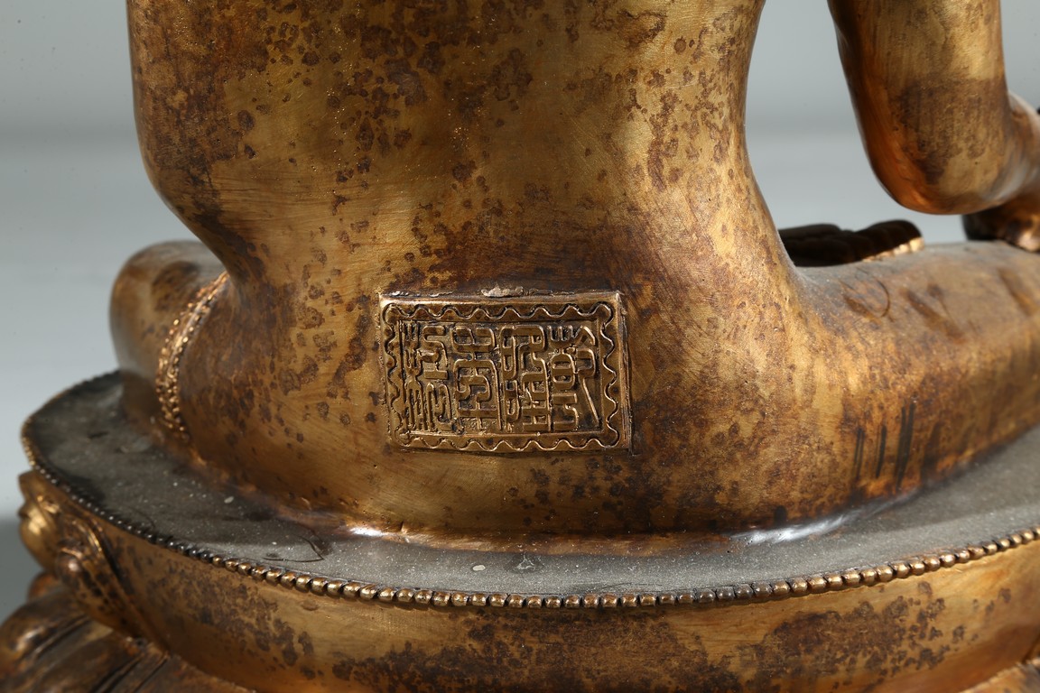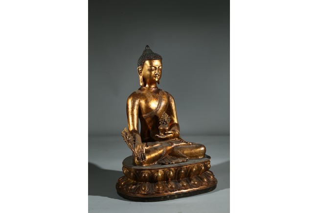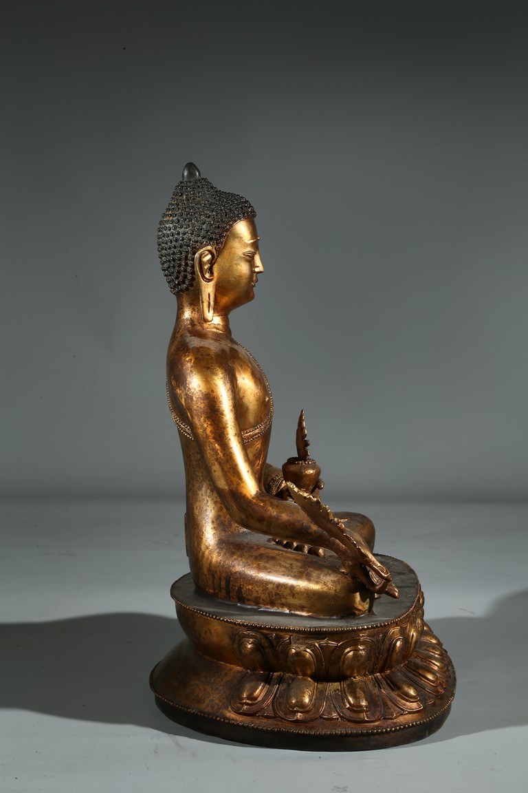 Provenance: Property from a Nevada private collection 佛像頭部螺髪均勻密佈,頭頂肉髻高高隆起,髻頂安寶珠。大耳齊垂,耳輪清晰。面部圓潤,形似鵝卵,雙眉纖細,斜向兩側上挑,眉間飾圓形白毫,雙目睜視,象徵洞悉世間一切,鼻梁尖挺,嘴部小巧,下唇明顯厚實,整體看上去神情俊朗,而又不失佛教的莊嚴與神聖。身軀雄健,四肢優美,姿態挺拔,氣勢非凡。上身著袒右肩,衣質薄透貼體,充分顯露出軀體和肌肉的自然起伏與變化。結跏端坐於蓮花寶座上,左手置雙膝上托藥鉢,右手仰置右膝握一藥果。整體氣勢非凡,風格優雅、法相莊嚴。 來源: 內華達州私人藏家提供