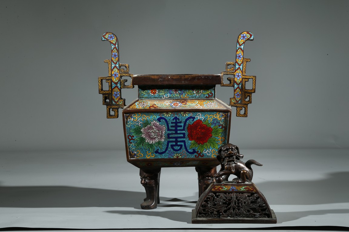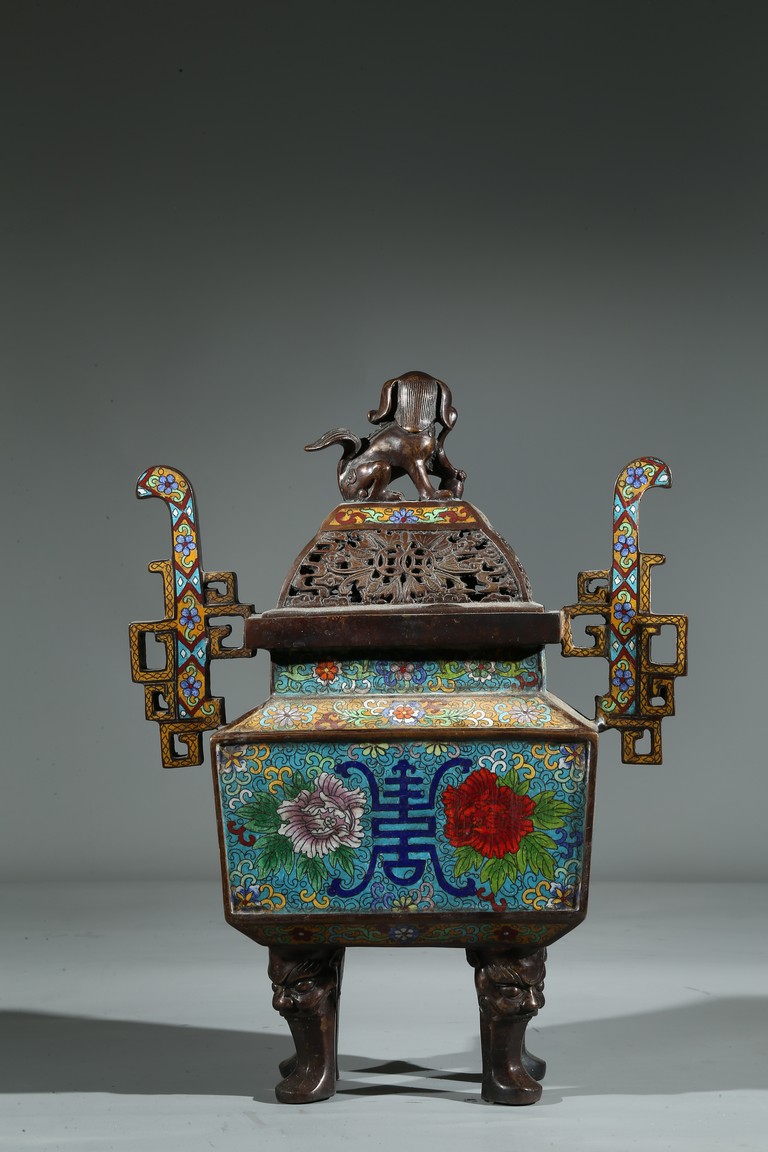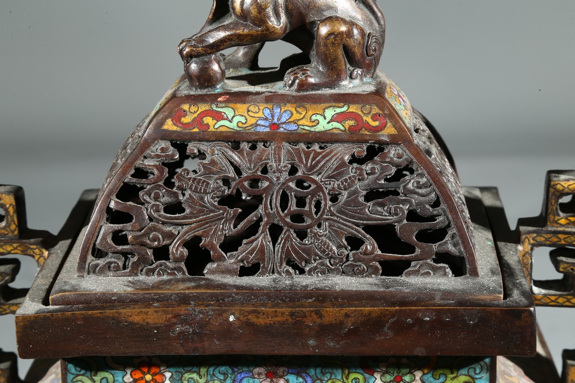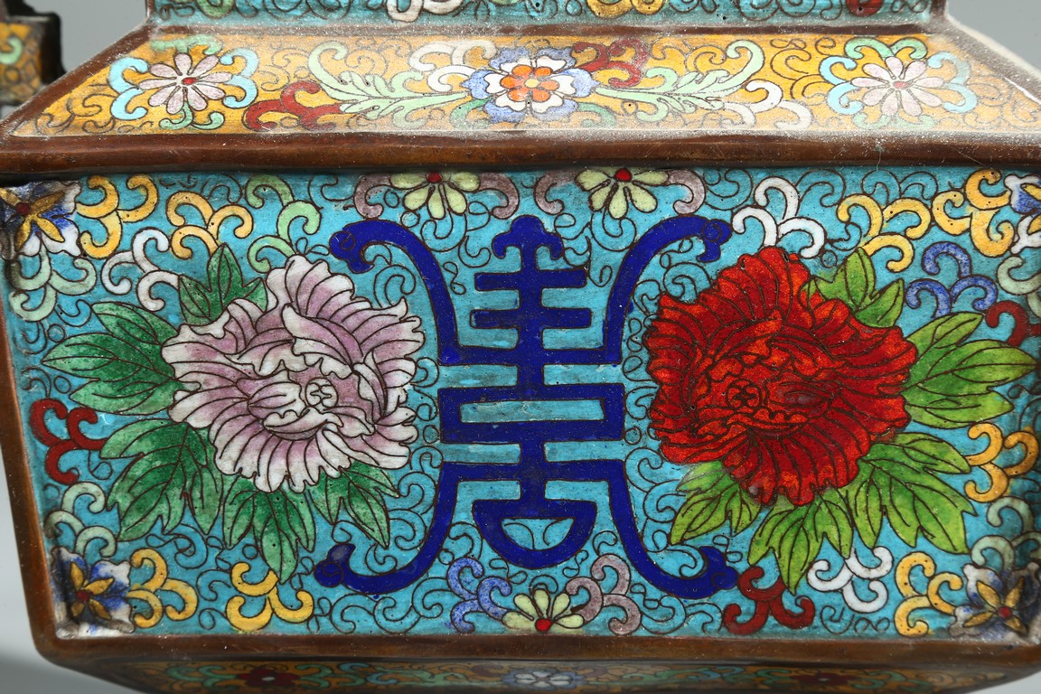 Of square form, the body enamelled with flowers and stylized shou character, flanked by two shaped handles, fitted with openwork cover with buddhist lion finial. Qing Dynasty period.