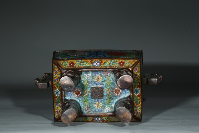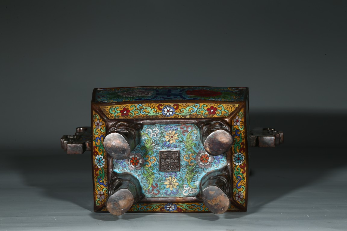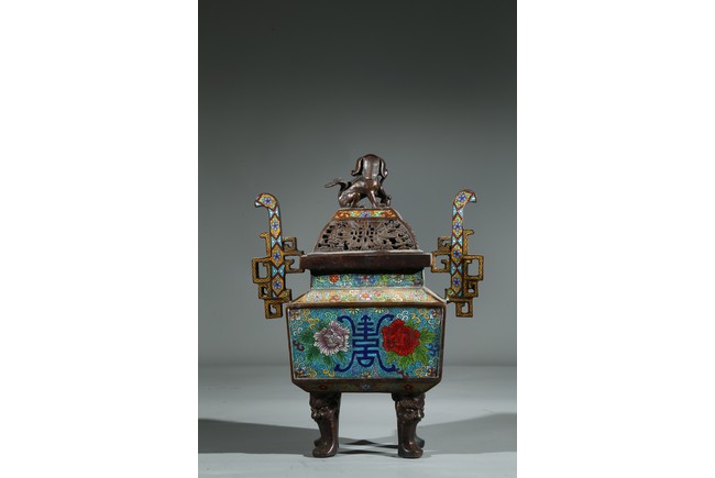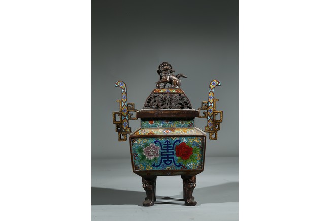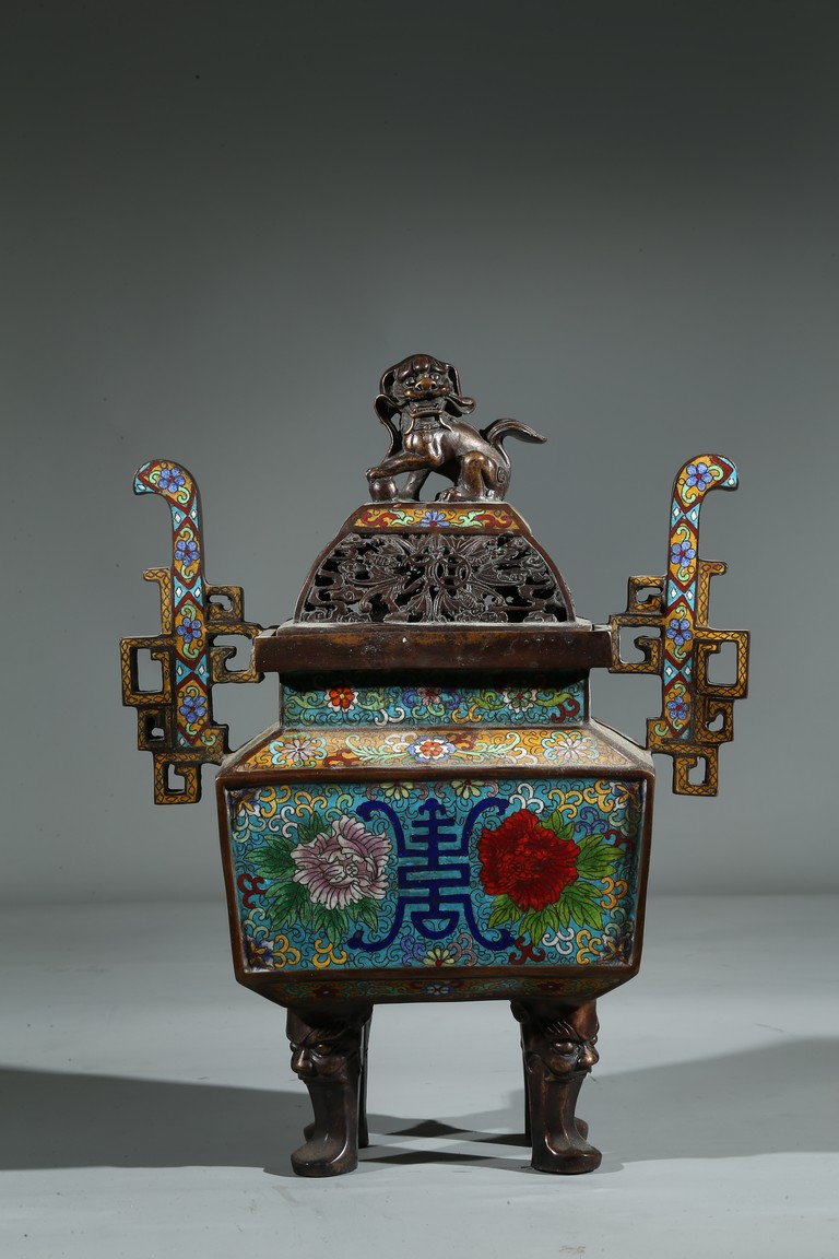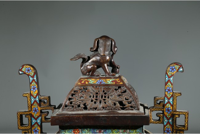 Of square form, the body enamelled with flowers and stylized shou character, flanked by two shaped handles, fitted with openwork cover with buddhist lion finial. Qing Dynasty period.