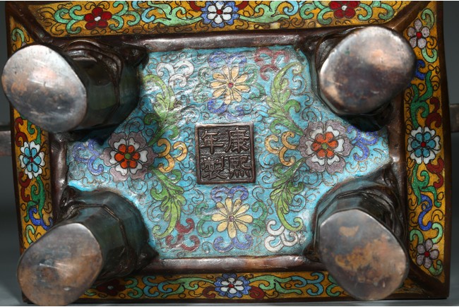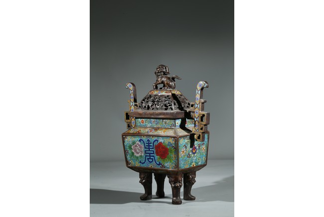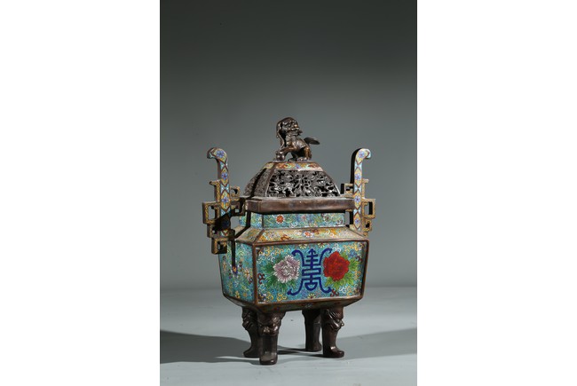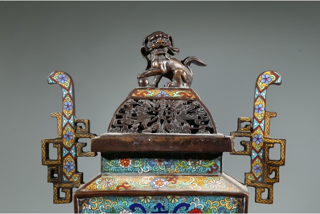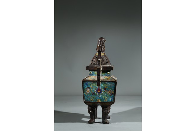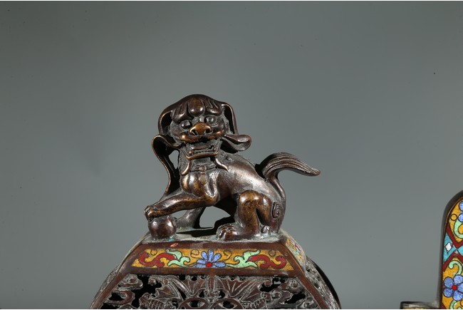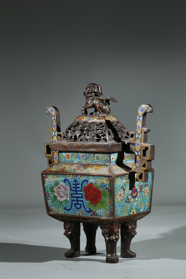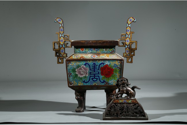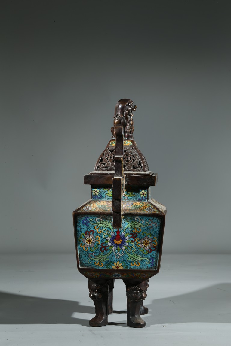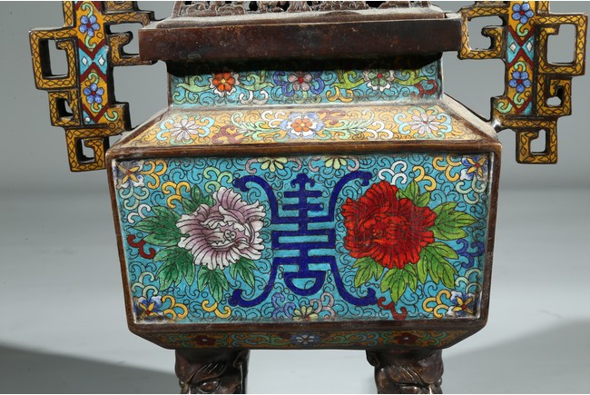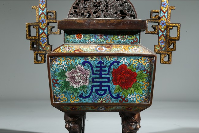 此爐掐絲精細,色彩豐富,窮盡其妍,銅質精實,鎏金璀璨,工藝繁複。爐身鼎式,直盤口,與器蓋子母口相合,嚴絲合縫。蓋上獅鈕,雄獅作迴首狀,怒目圓瞪,張牙咧嘴,嬉戲繡球。通體以淺藍色琺瑯釉為地,周身滿飾纏枝花卉紋、壽字紋,繁花似錦,搭配精美,佈局具有層次感,生動傳神,靈動精采,整幅畫面賞心悅目。底部“康熙年製”款識。