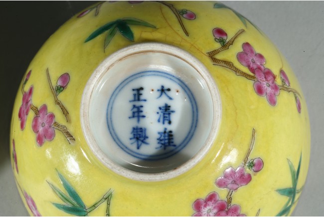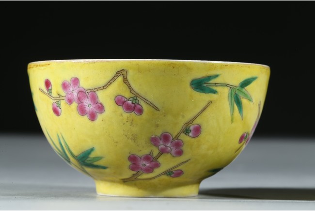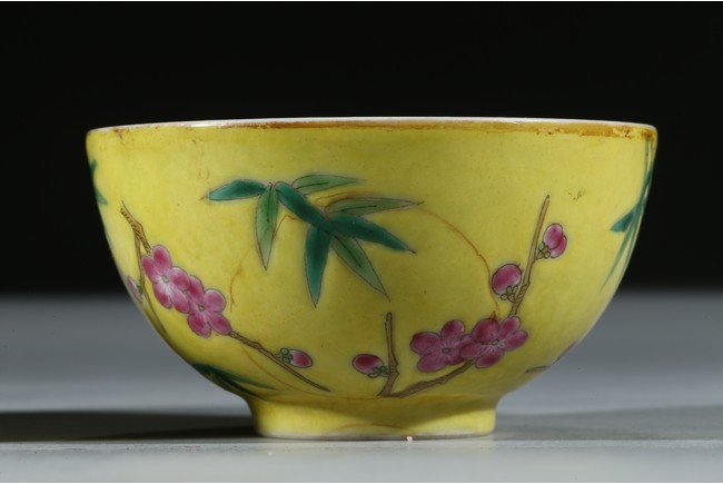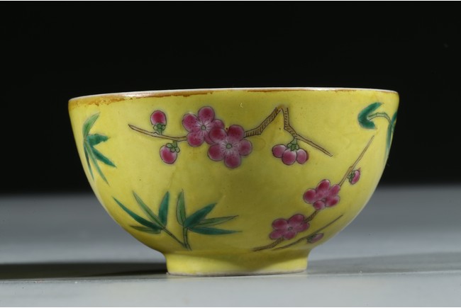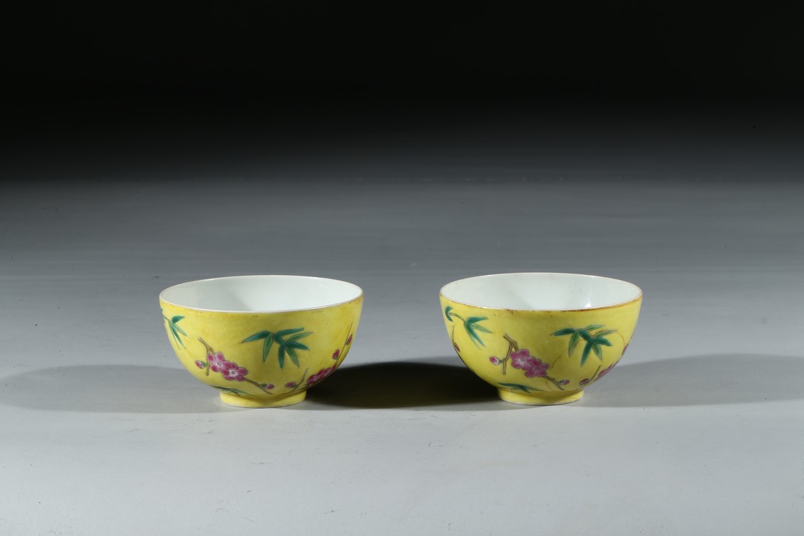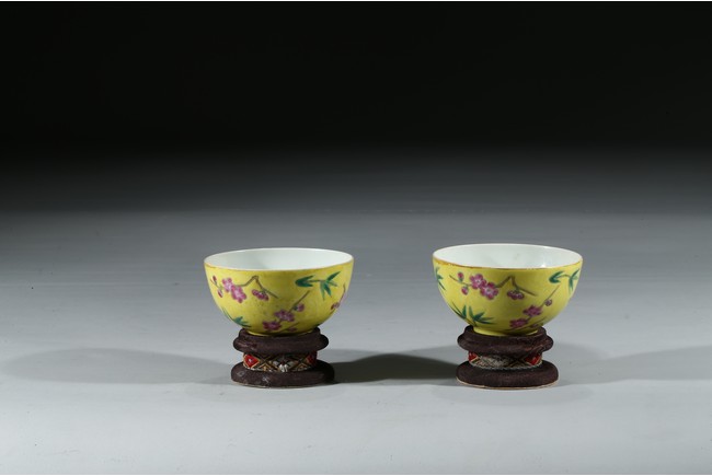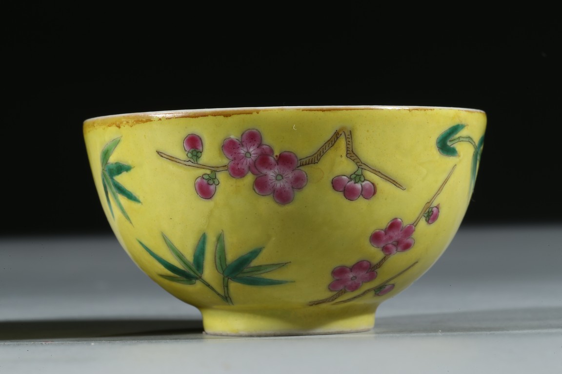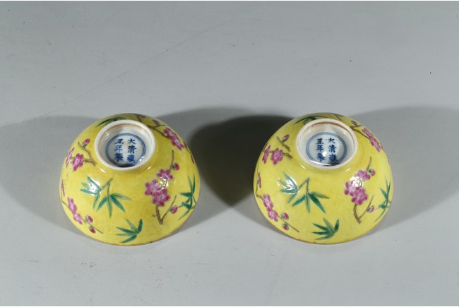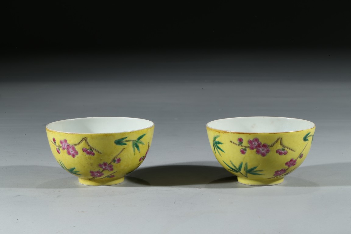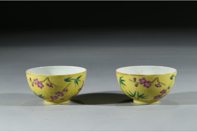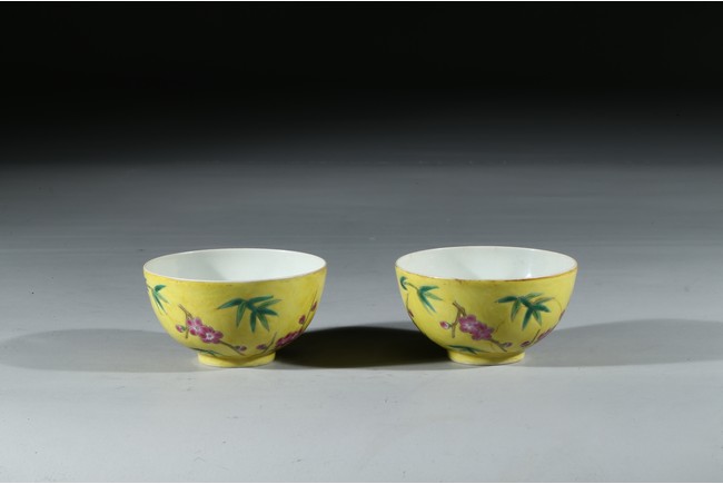 Each enamelled with plum blossom and bamboo design reserved on yellow ground, base with apocryphal Yongzheng mark. Qing Dynasty period.