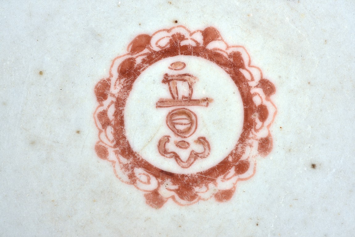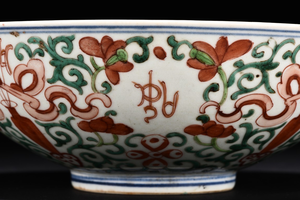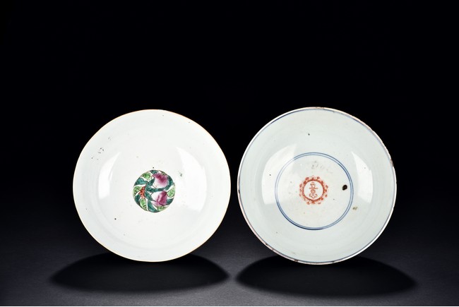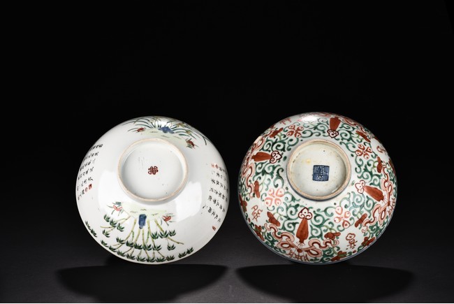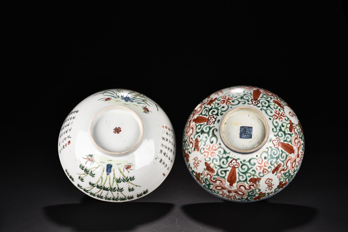 Including one bowl painted with four character Ji Xiang Ru Yi interspersed with scrolling floral pattern, bottom with dynasty mark, the other with poems and bamboo, orchid, bottom with pictograph mark. Republic period.