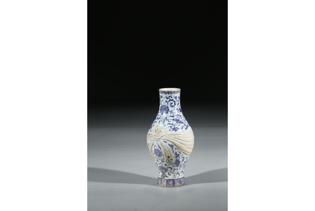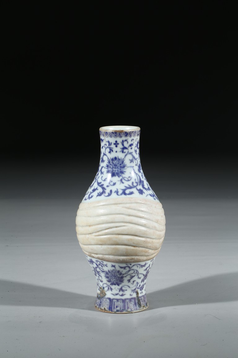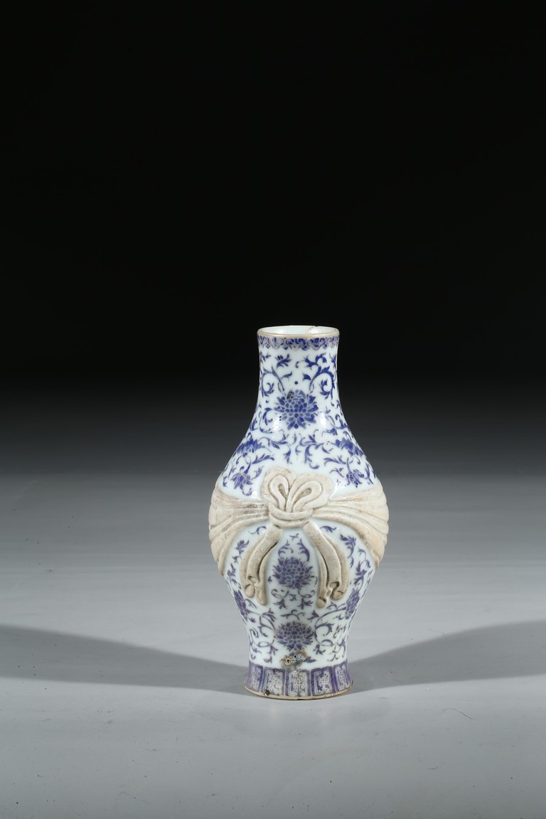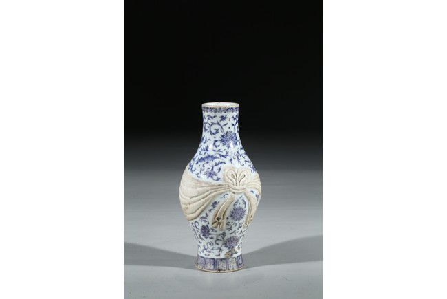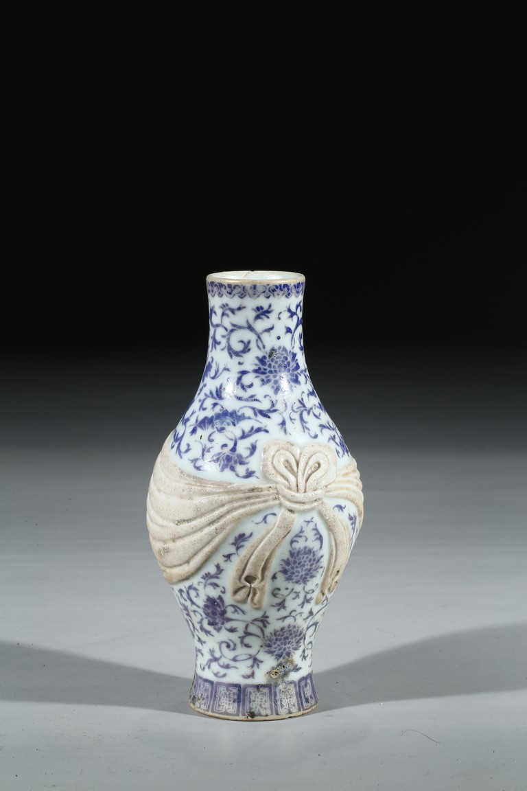 A BLUE AND WHITE SASH TIED VASE 清 青花花卉纹包袱瓶