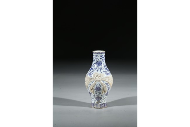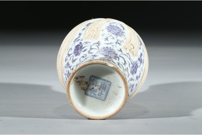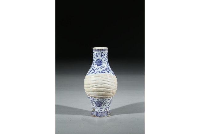 Exterior moulded with a sash-tied decoration and dense scrolled lotus pattern.