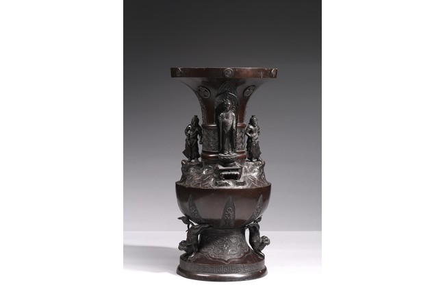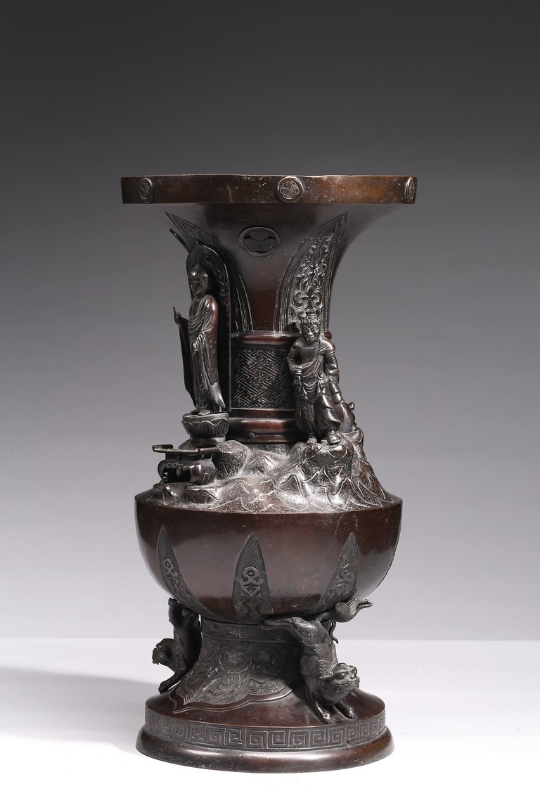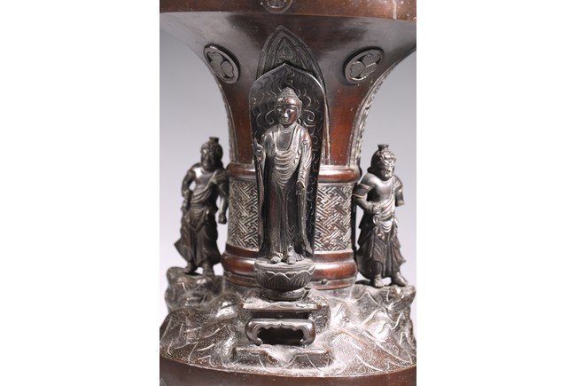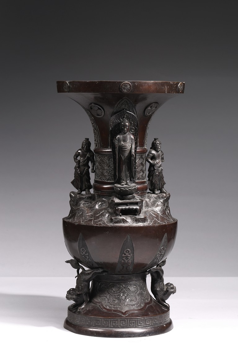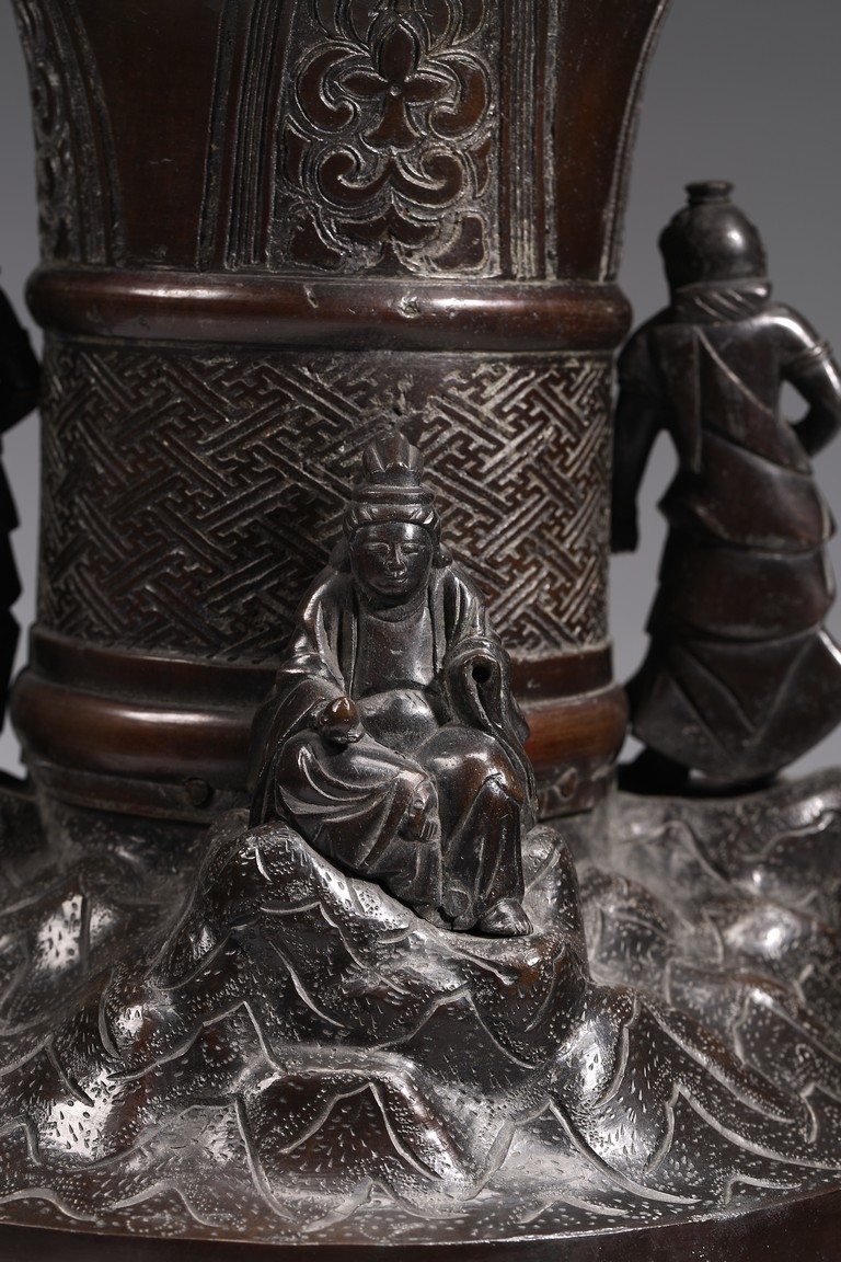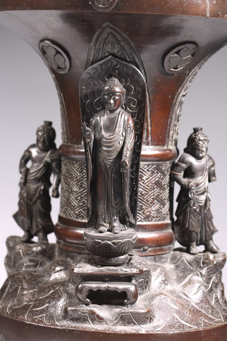 Mounted with a figure of Buddha and three figural attendants below a wide flared rim, embossed with Ming style designs, raised on a bell form base with two figural Buddhist lions. Base plate absent. Meiji Period.