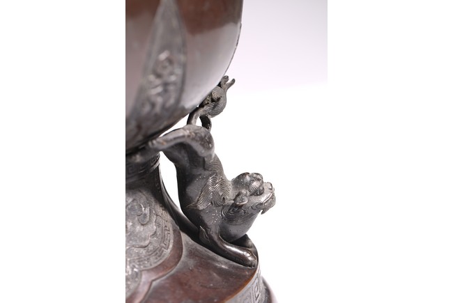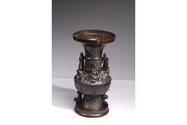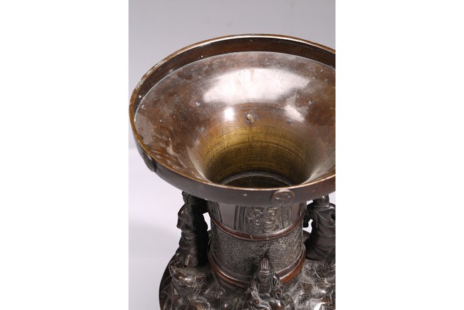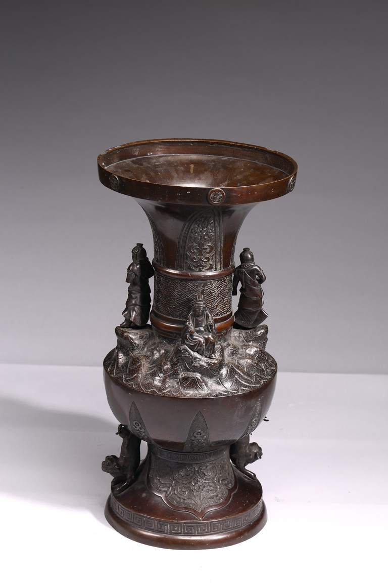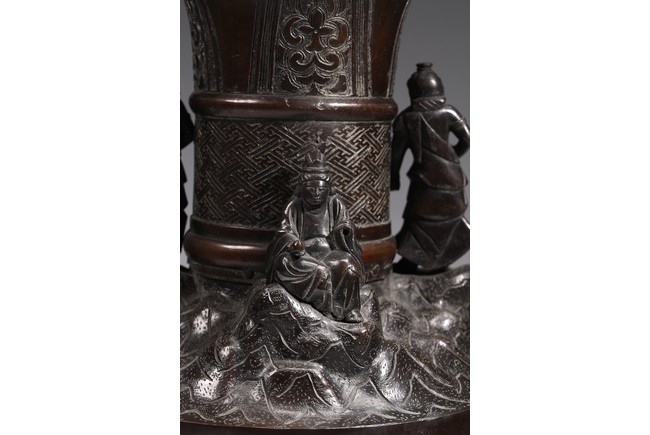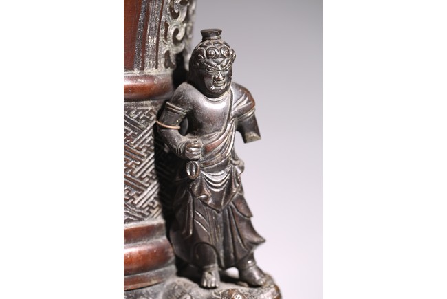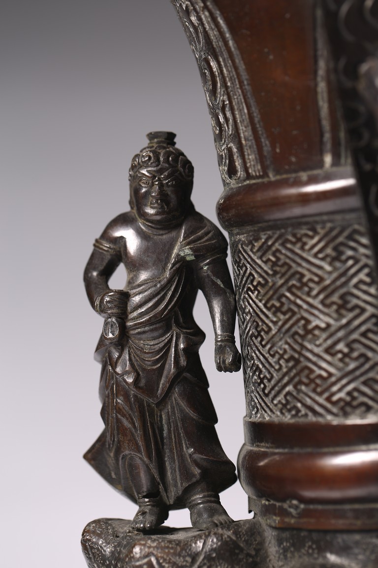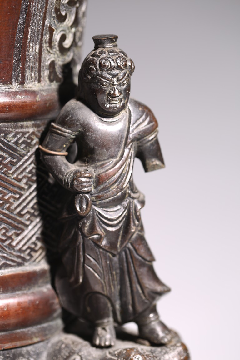 Mounted with a figure of Buddha and three figural attendants below a wide flared rim, embossed with Ming style designs, raised on a bell form base with two figural Buddhist lions. Base plate absent. Meiji Period.