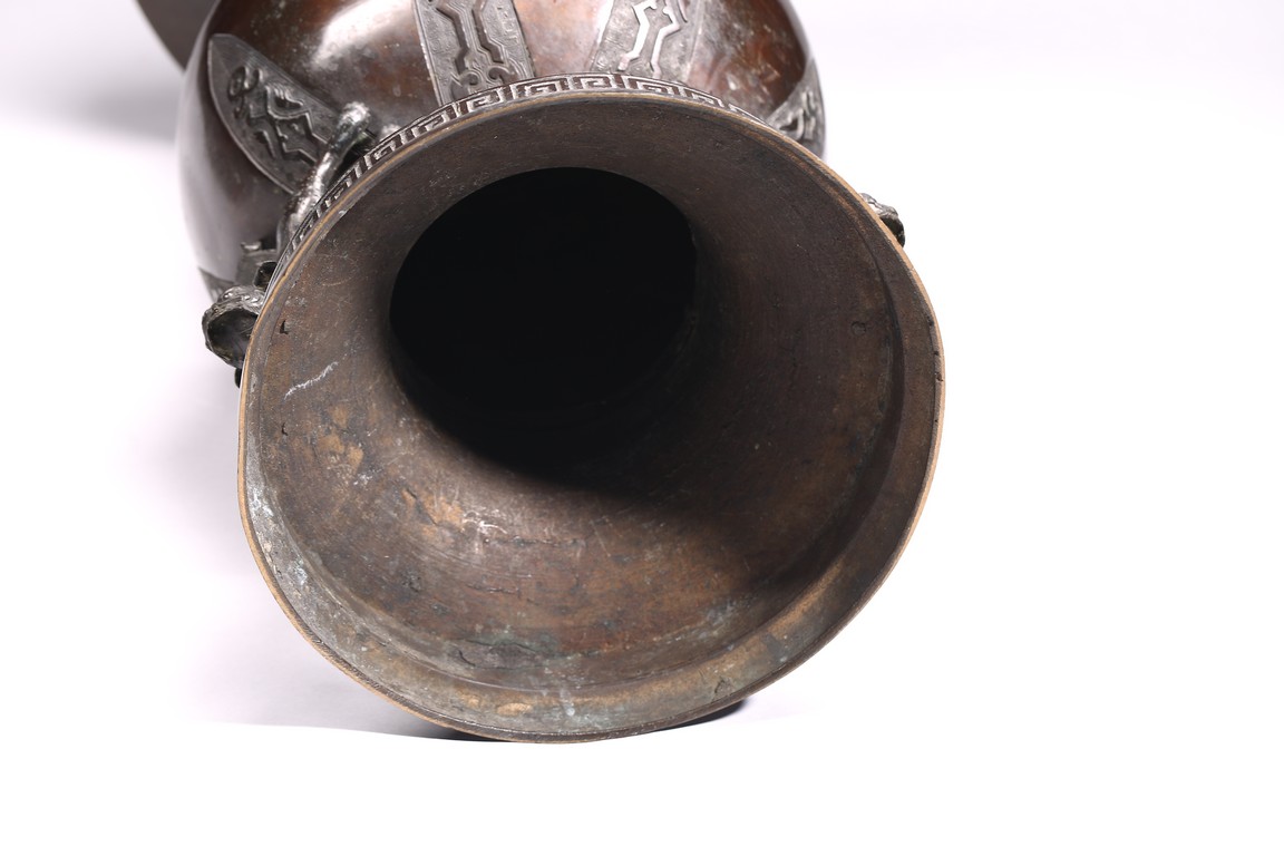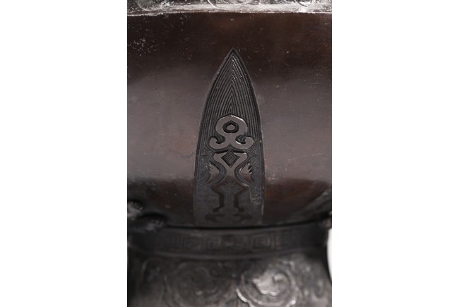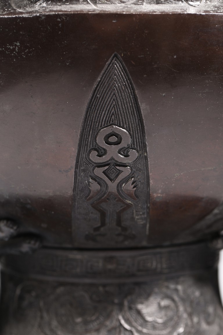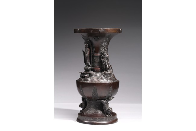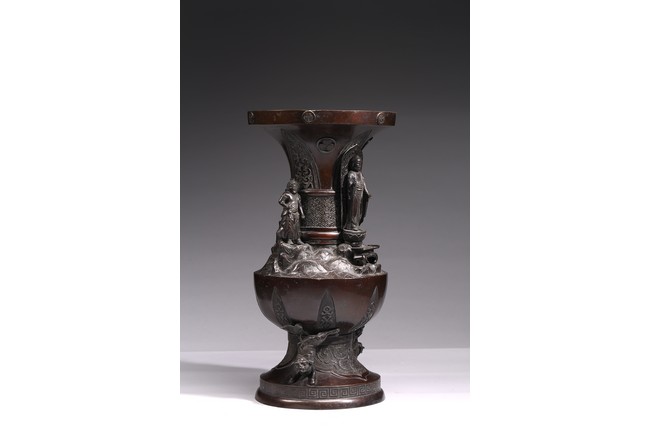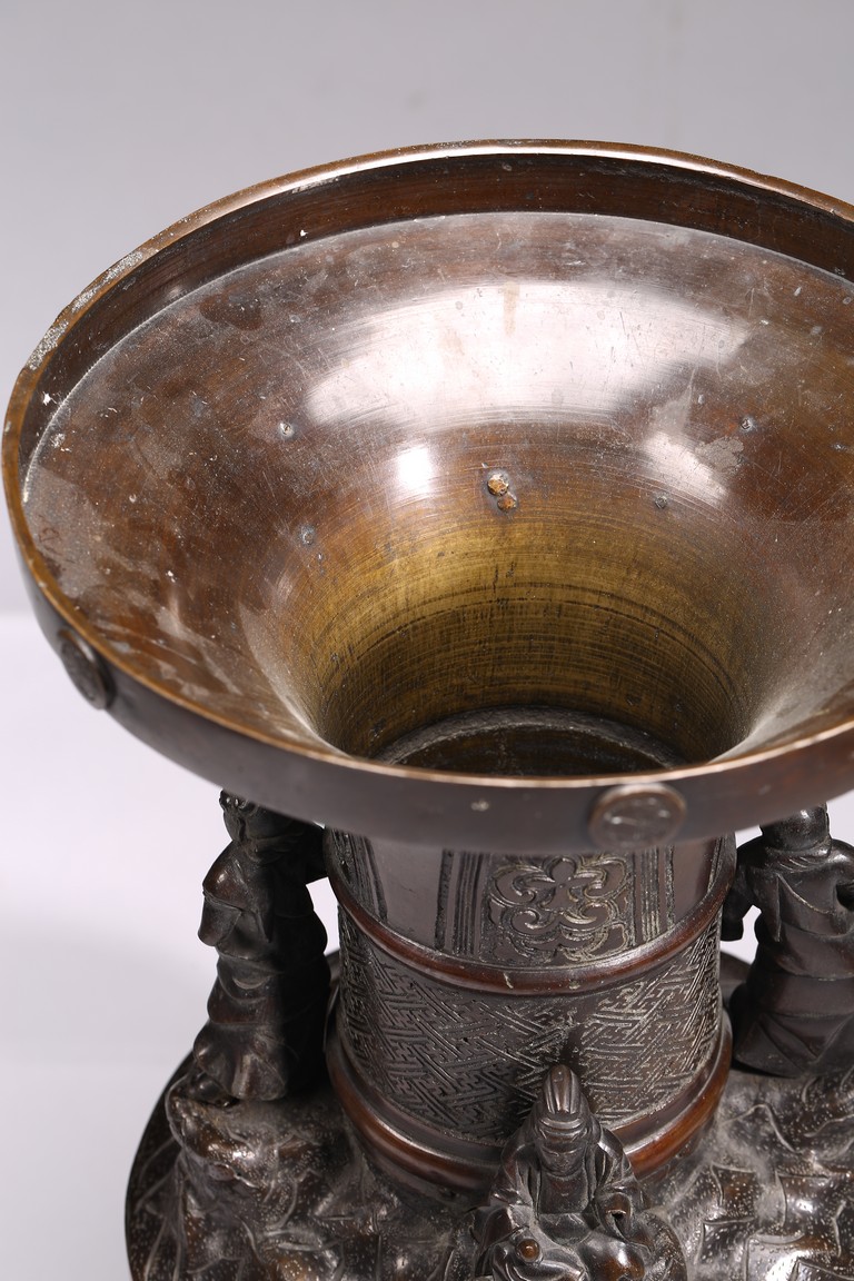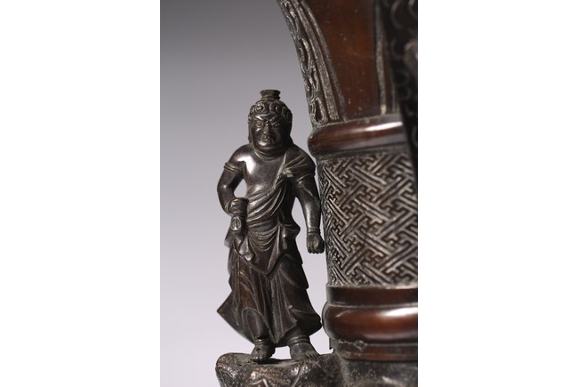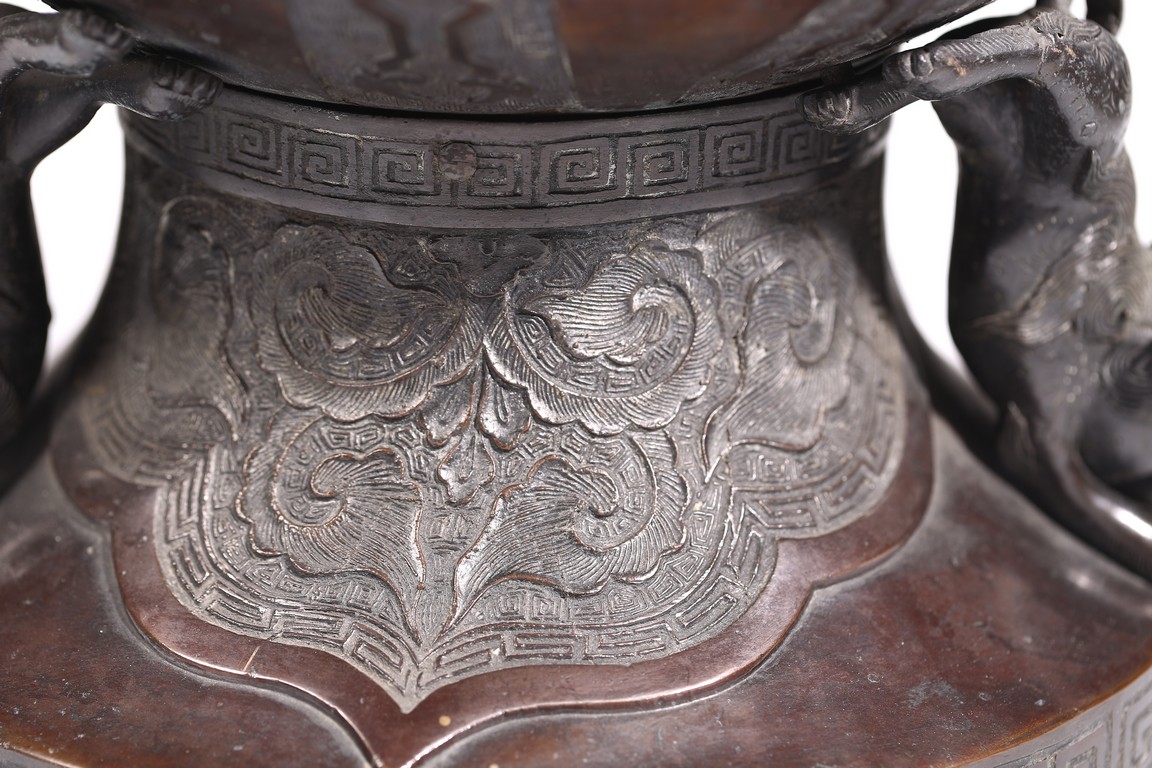 Mounted with a figure of Buddha and three figural attendants below a wide flared rim, embossed with Ming style designs, raised on a bell form base with two figural Buddhist lions. Base plate absent. Meiji Period.