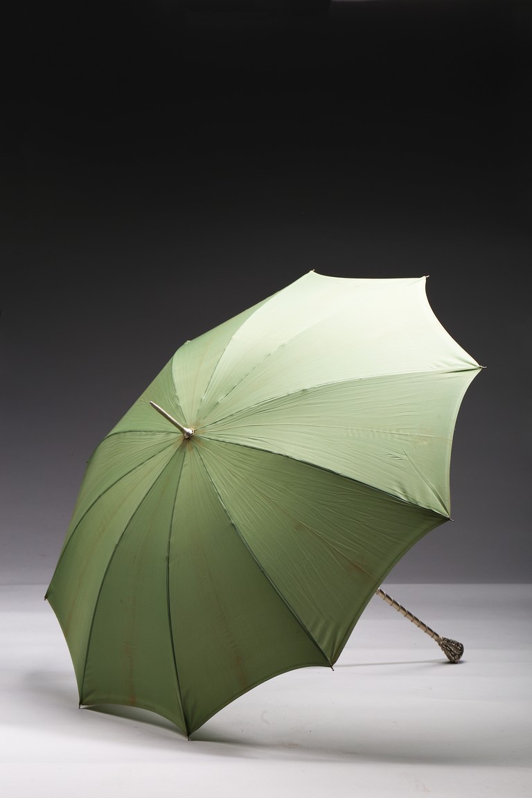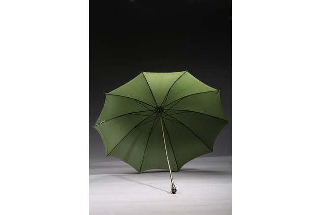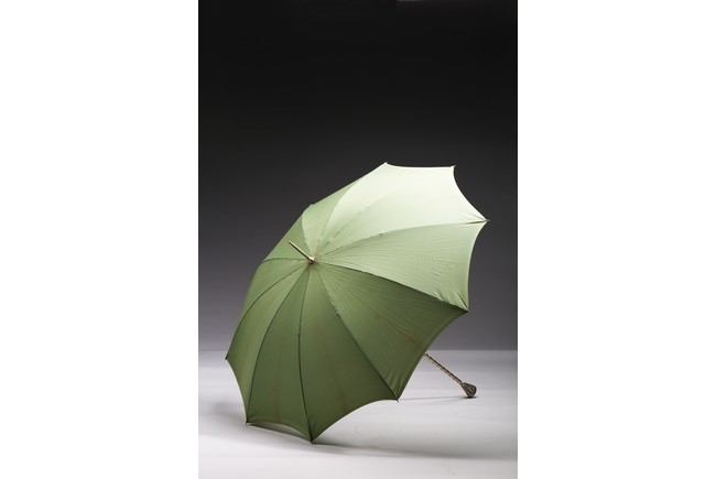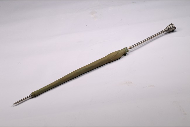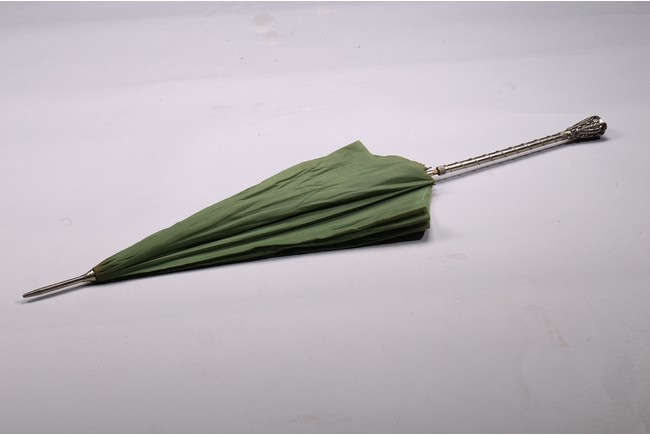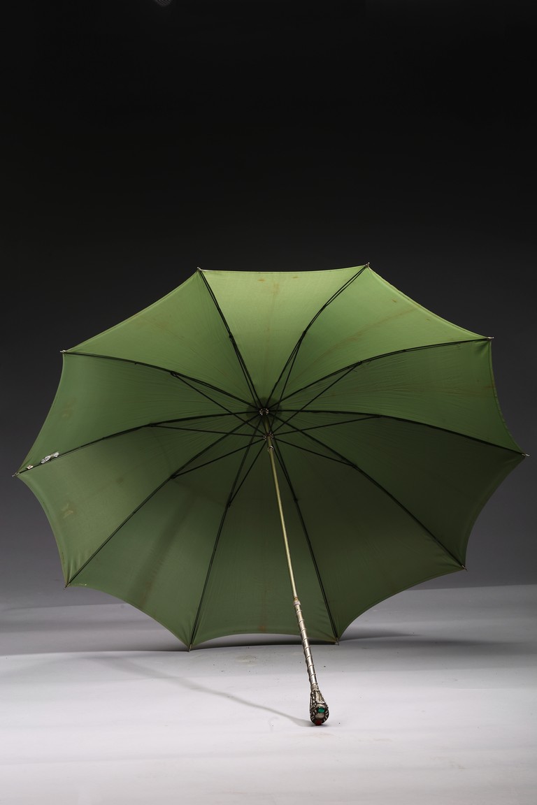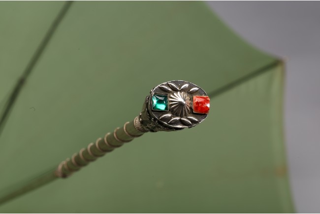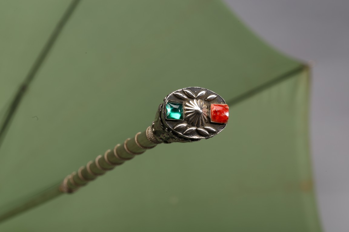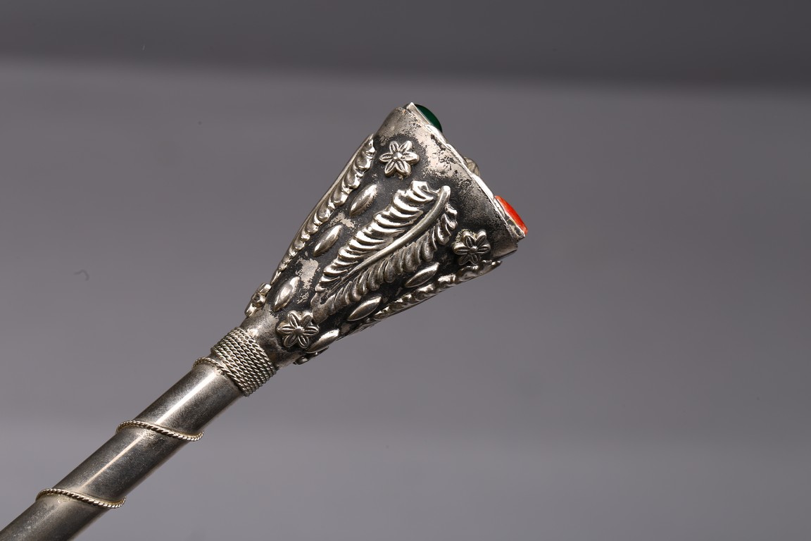 The handle cast in relief with raised motif and embellished with gem-like decorations.