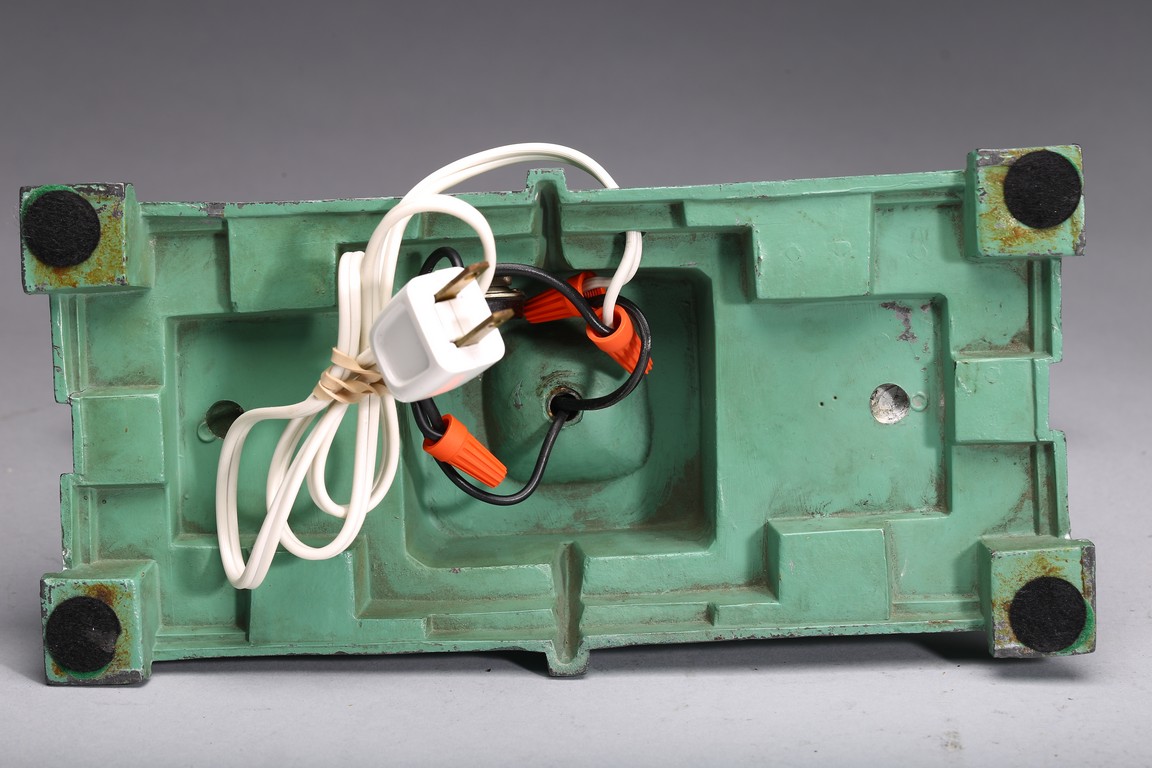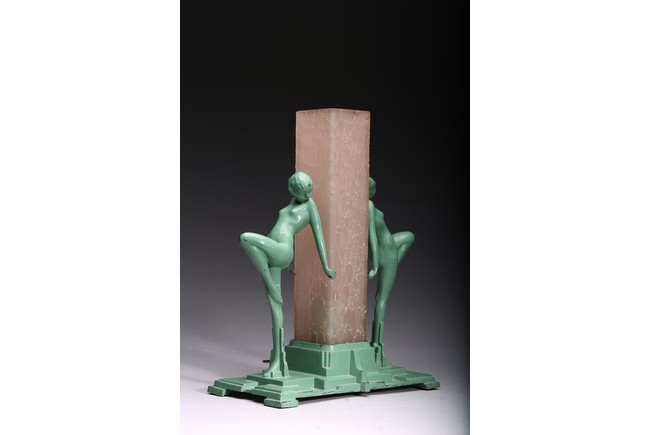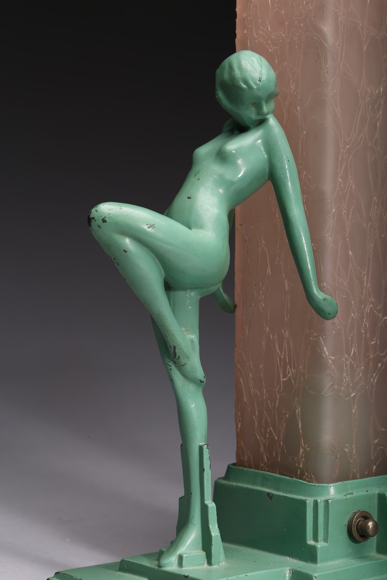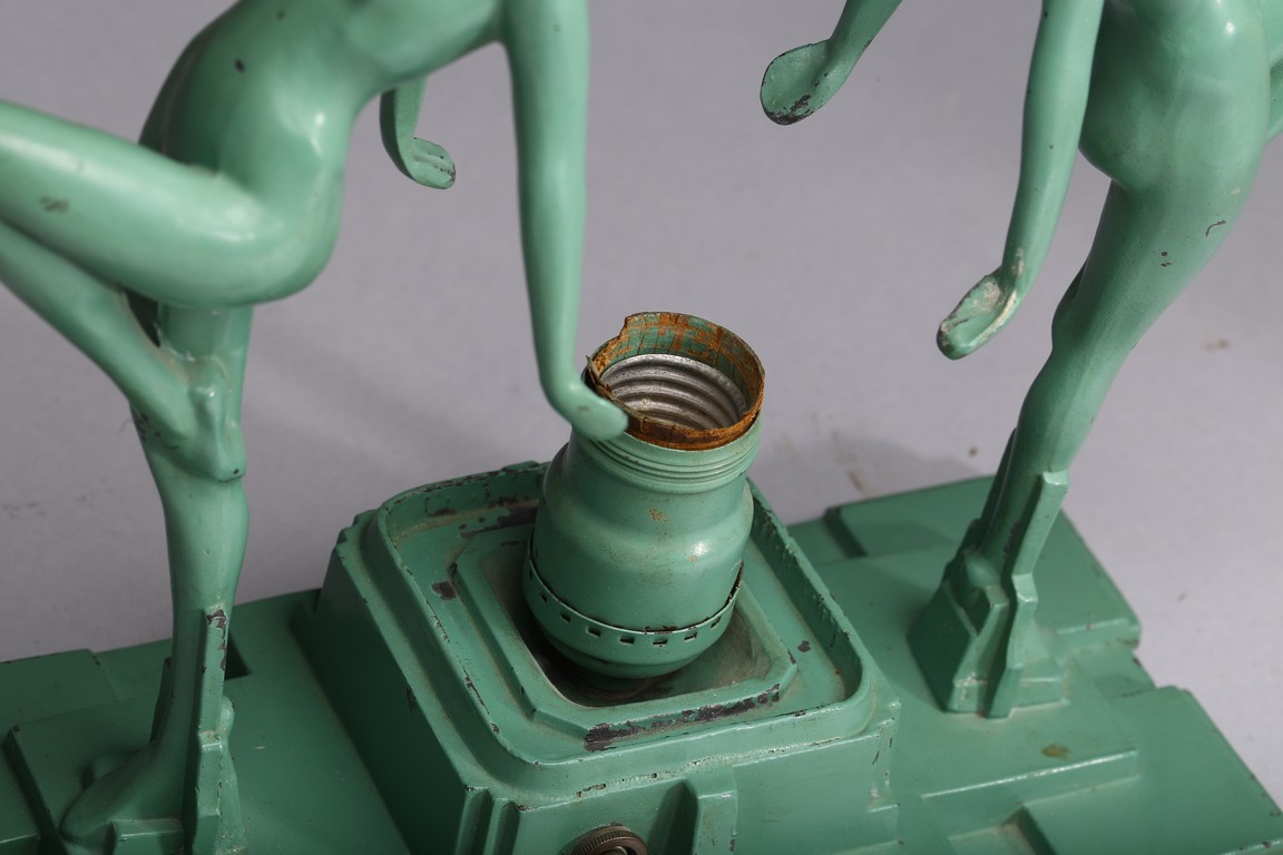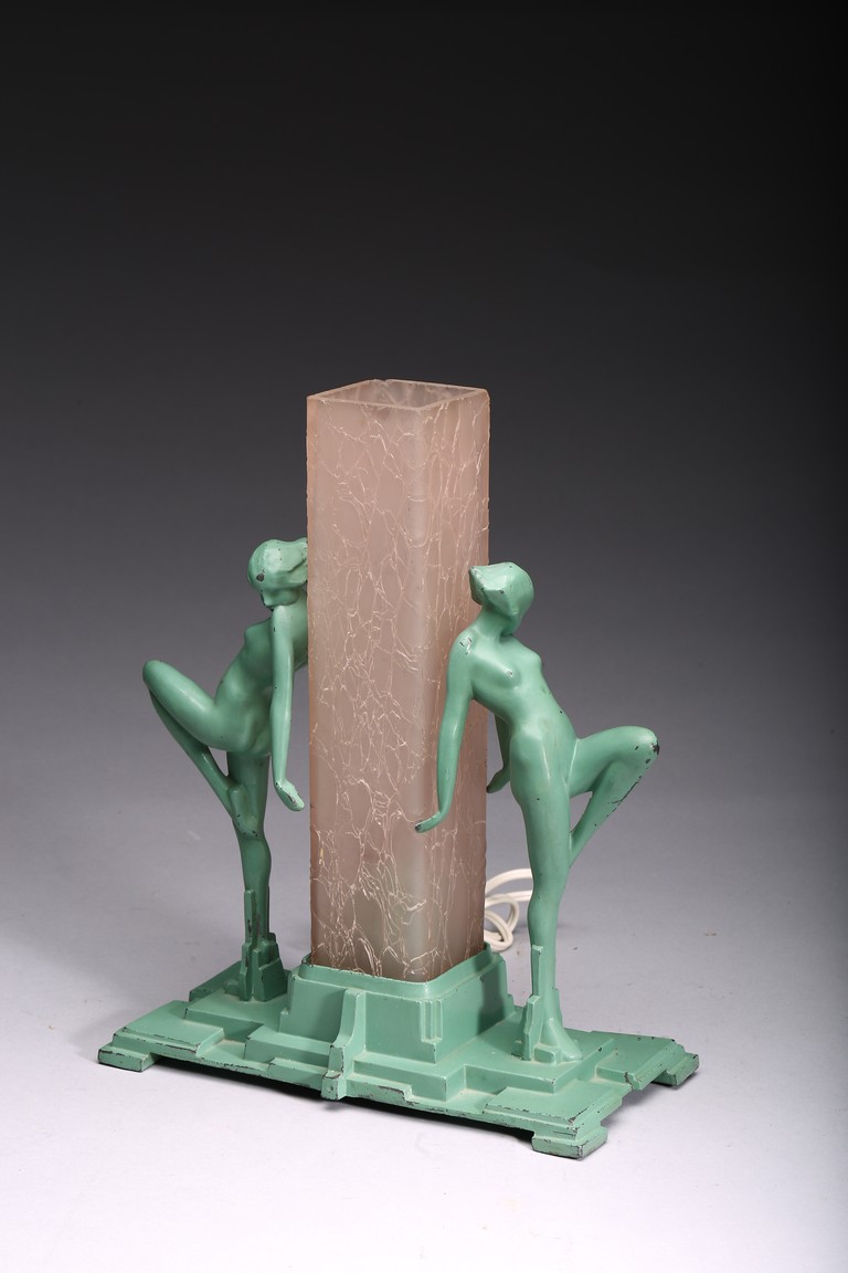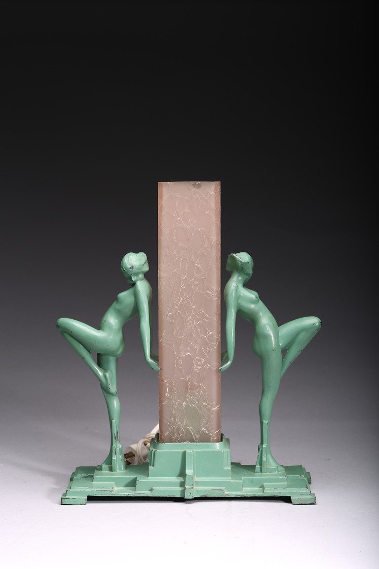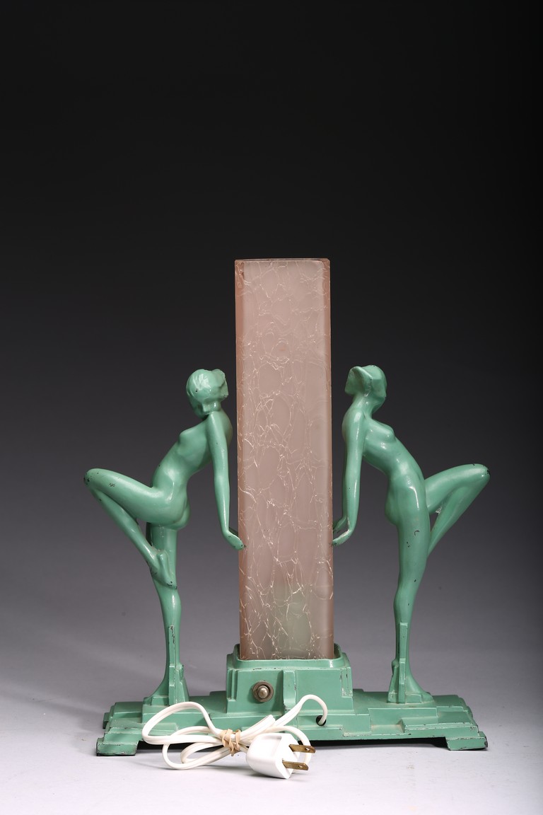 Frankart (American 1920s-1930s), No. L222 Original Frankart figural lamp depicting two young female nude dancing beauties with knees bent and raised and arms pulled back holding a squared rose pink crackle glass shade that diffuses the light emitted from the lamp within. Figures standing at full length on a stepped Art Deco base, both in Roman Green finish. Marked on back "FRANKART INC. PAT DES. 78417" Lamp published in Frankart 1930-1931 catalog, p. 17, fig. L222.
