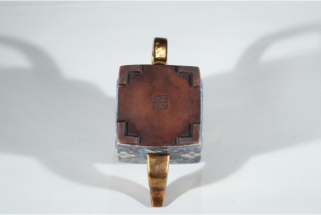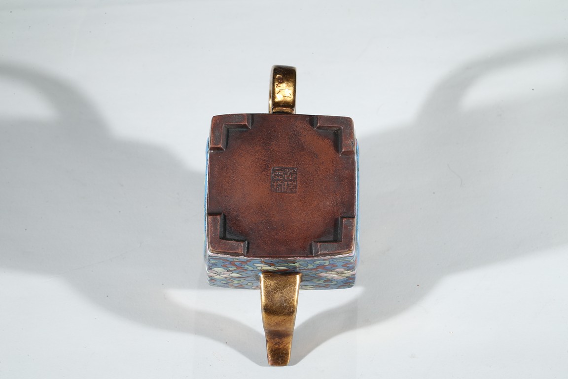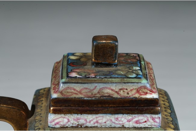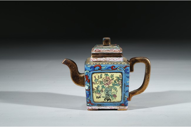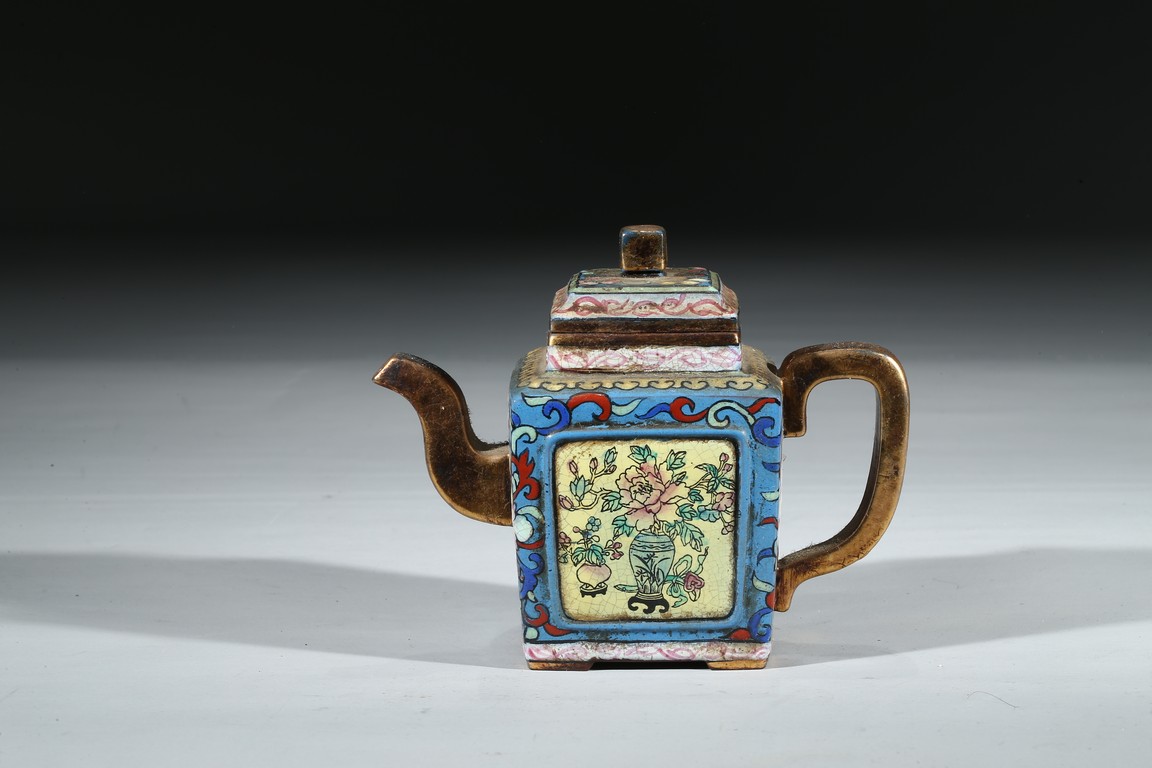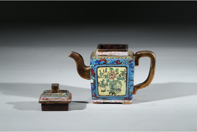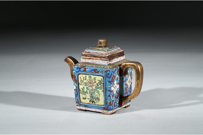 Of square section, body enamelled with bogu pattern, spout and handle painted in gilt.