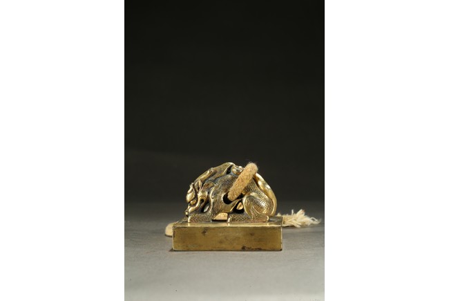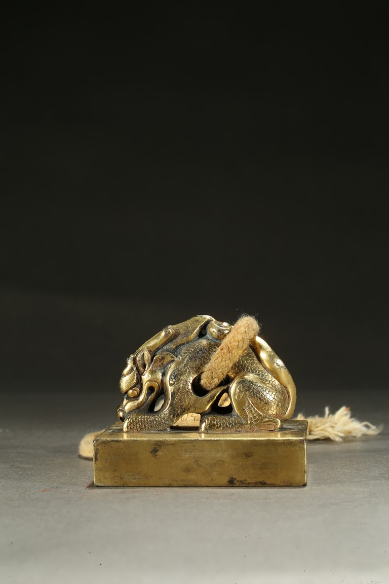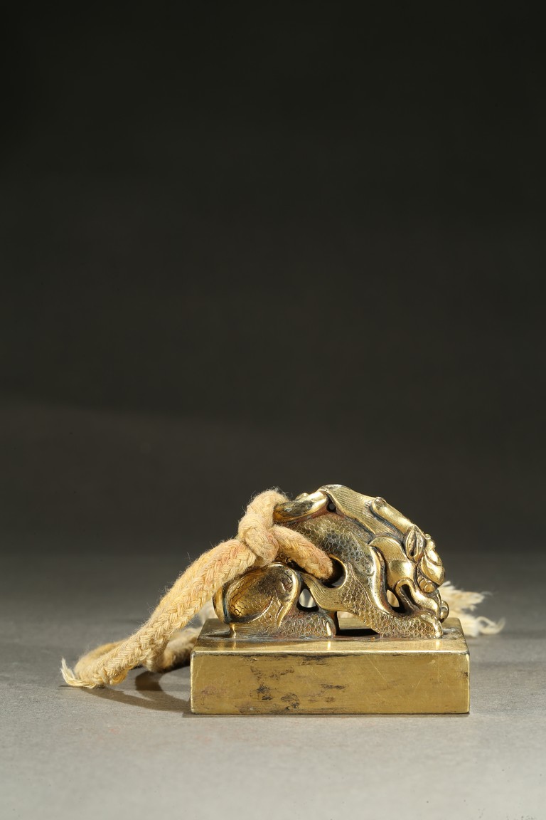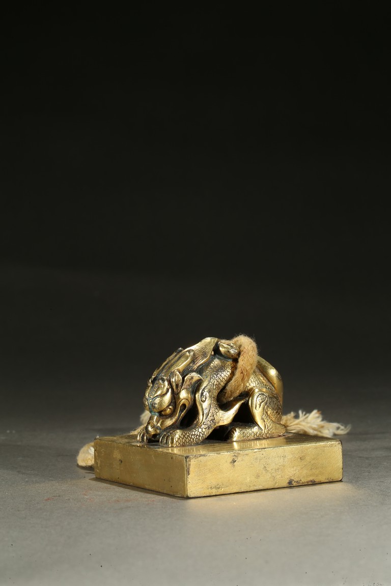 Of square section, the seal surmounted with a recumbent mythical beast seated on its rear haunches, its scaly body emitting flame scrolls around the limb, its powerful head resting on front paws with mouth slightly open, the mane further detailed with incised lines, tail bifurcated, the seal surface with four character inscription. Qing Dynasty period.