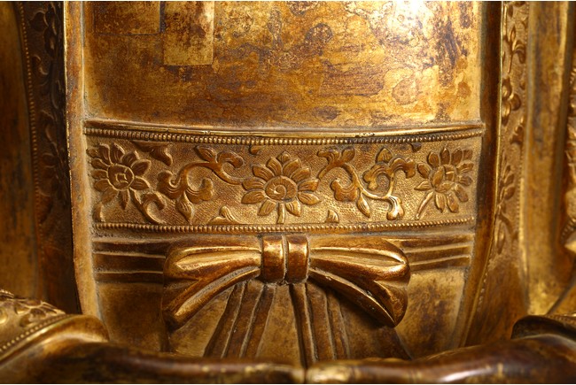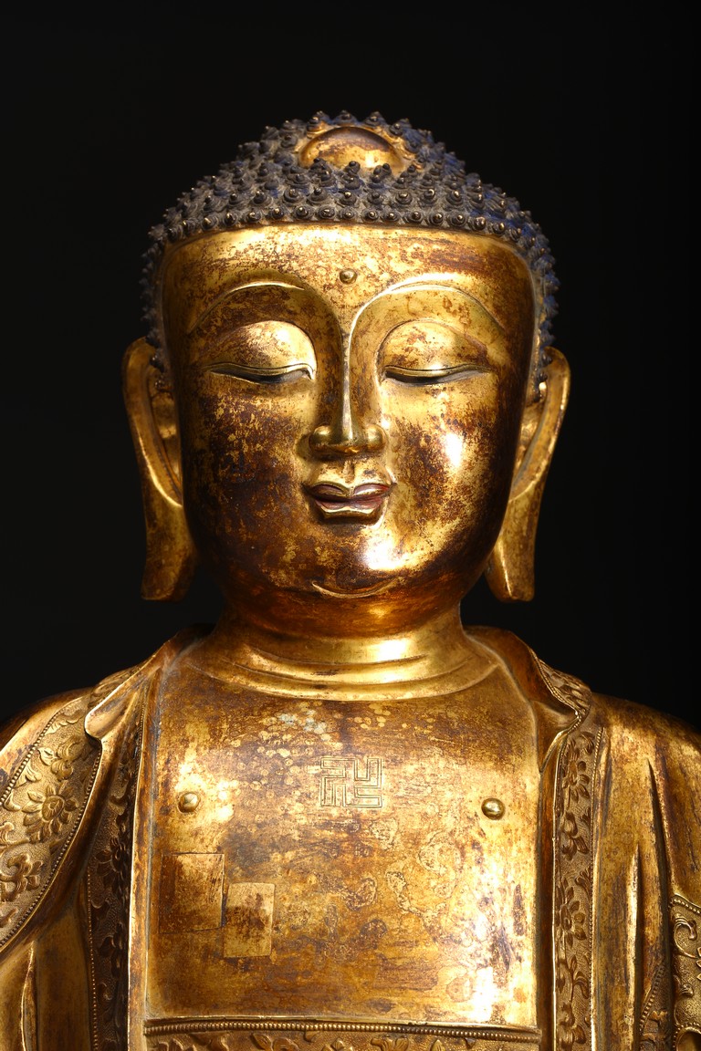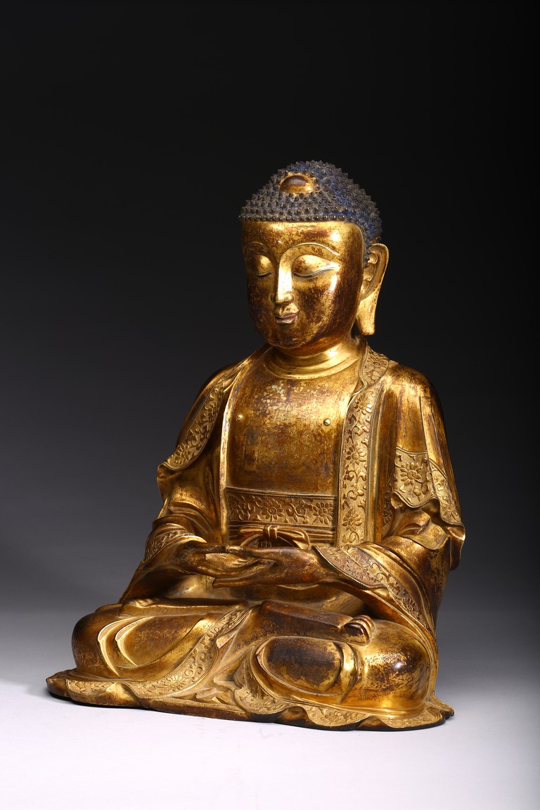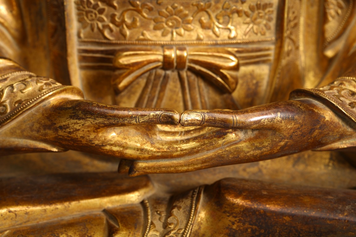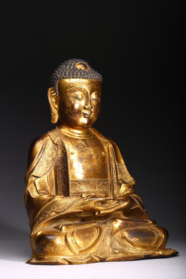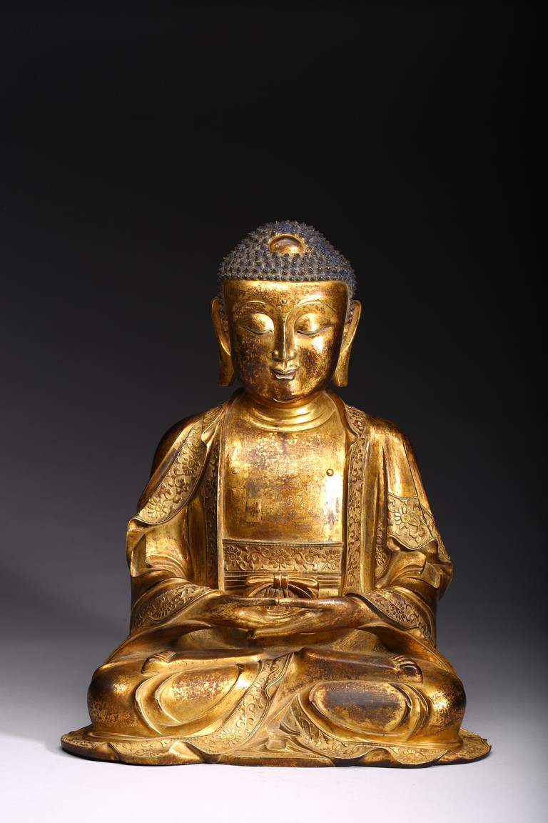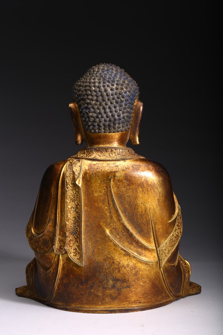 阿彌陀佛是主持西方極樂世界的教主,形象為雙手在趺坐的雙膝上平行疊放,稱為禪定印。這尊造像是標準的明代中原漢傳佛教造像,整體鎏金厚重,鏨花精美。造像雙手結禪定印,結全跏趺坐。頭部較大,頭飾螺發,肉髻圓隆高凸,頂飾摩尼寶珠,是宋元以來中原漢傳佛教常見的裝飾形式。面相方圓端莊,眼瞼低垂,目光下斂,雙目宛若未開敷的蓮花苞,俯視著芸芸眾生,神態慈祥柔和。上身著雙領式通肩大衣,下身著高束腰長裙,腰繫束帶並打結。衣紋採用內地傳統寫實性技法,簡潔流暢。整尊造型端莊大方,比例舒展勻稱,胎體厚重敦實。