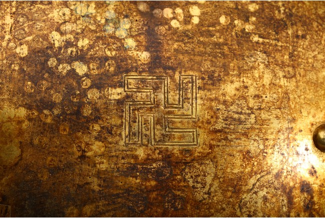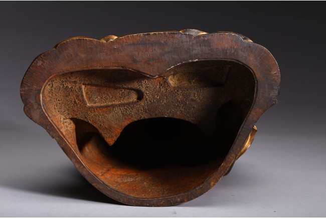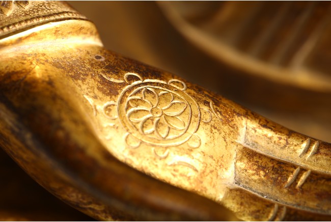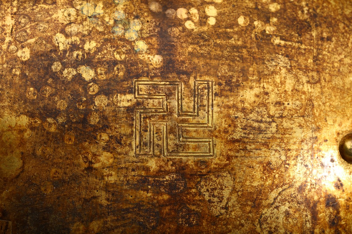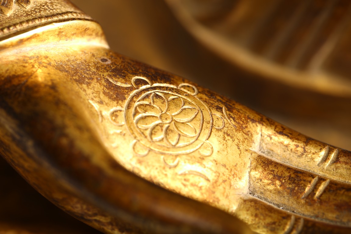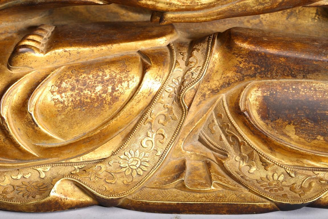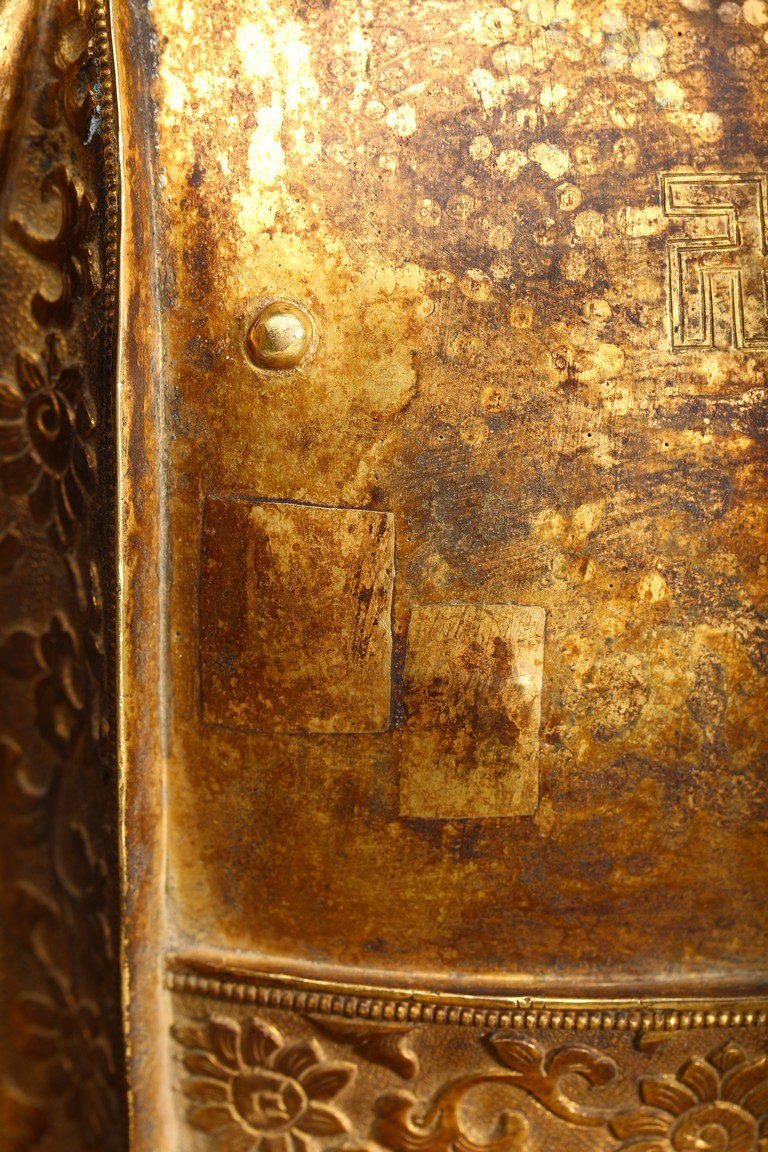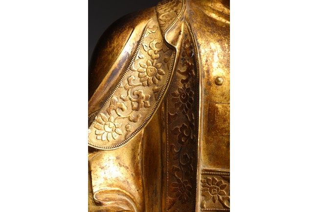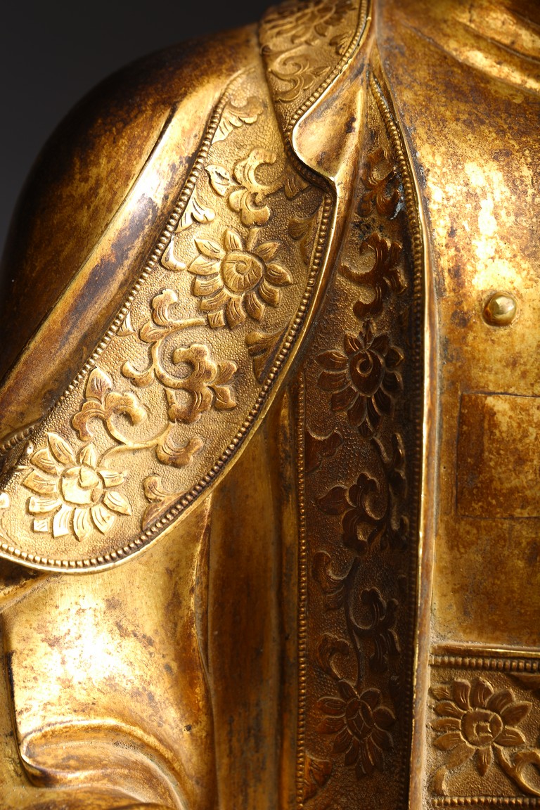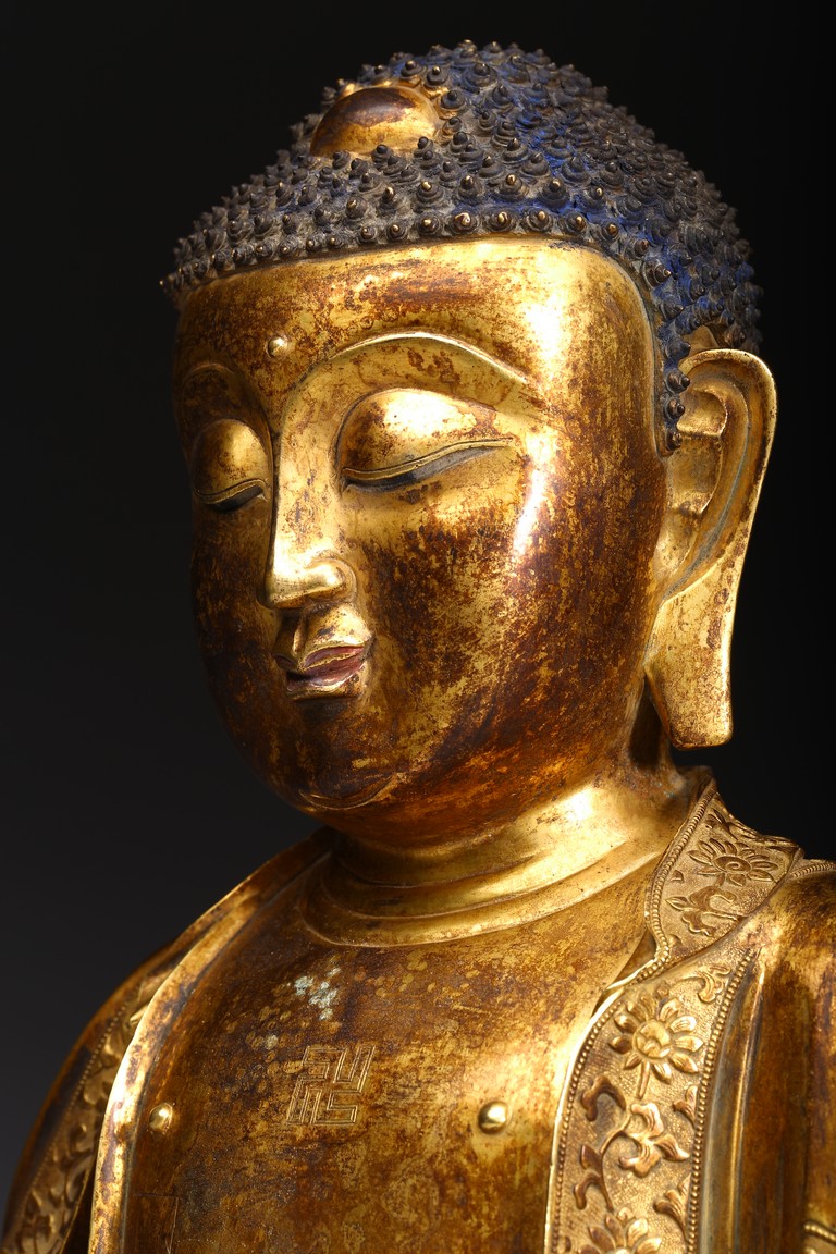 阿彌陀佛是主持西方極樂世界的教主,形象為雙手在趺坐的雙膝上平行疊放,稱為禪定印。這尊造像是標準的明代中原漢傳佛教造像,整體鎏金厚重,鏨花精美。造像雙手結禪定印,結全跏趺坐。頭部較大,頭飾螺發,肉髻圓隆高凸,頂飾摩尼寶珠,是宋元以來中原漢傳佛教常見的裝飾形式。面相方圓端莊,眼瞼低垂,目光下斂,雙目宛若未開敷的蓮花苞,俯視著芸芸眾生,神態慈祥柔和。上身著雙領式通肩大衣,下身著高束腰長裙,腰繫束帶並打結。衣紋採用內地傳統寫實性技法,簡潔流暢。整尊造型端莊大方,比例舒展勻稱,胎體厚重敦實。