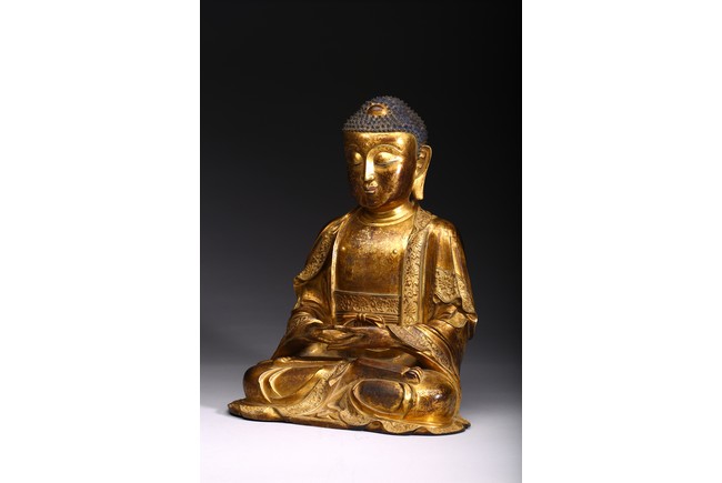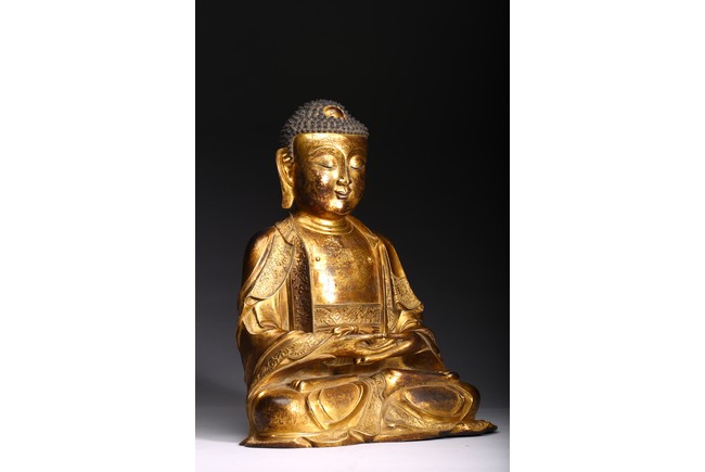 Cast seated in dhyanasana with his hands in dhyana mudra, wearing a sanghati open revealing the belly, the full round face with downcast eyes and gentle smile, the base unsealed. Ming Dynasty period.