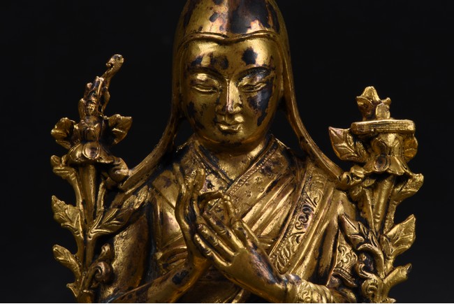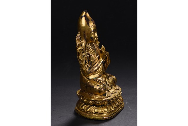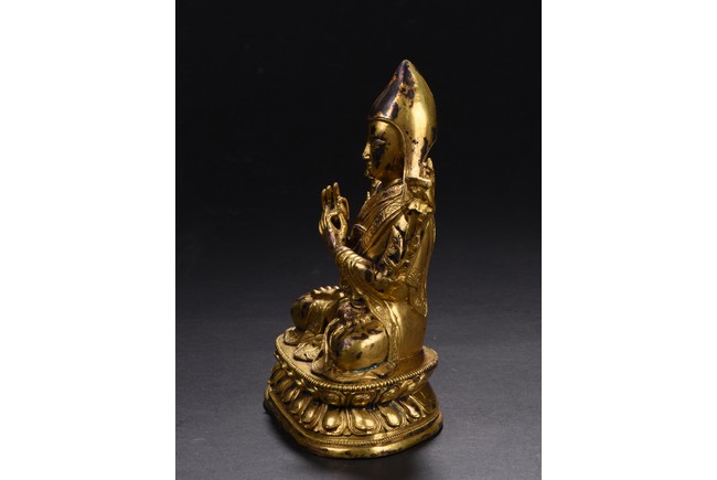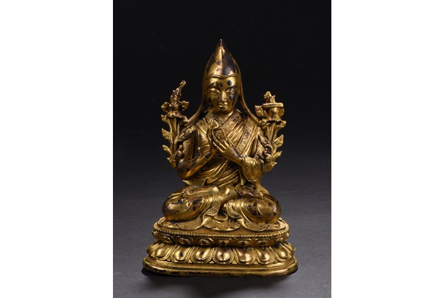 Provenance: Property from a private collection, San Francisco 宗喀巴不僅是西藏格魯派即黃教的創立者,也是藏傳佛教界最為重要的宗教改革家,精神領袖之一,被藏族人民譽為“第二佛”,即釋迦摩尼之後的另一位世間佛尊。此像表現的就是一尊標準的宗喀巴大師像。宗喀巴頭戴黃色的尖頂僧帽,又稱桃形尖帽,後來成為格魯派僧人共同的形象標誌;它與噶當派僧人所戴班智達帽頗為相似,體現了宗喀巴大師對噶當派的忠實繼承。面相飽滿圓潤,慈眉善目,身著交領式坎肩、僧裙和袒右肩袈裟,衣紋自然寫實。紋飾精緻細膩。雙手當胸結說法印,手心各牽一蓮莖,花朵至肩頭盛放。結跏趺坐於蓮花寶座上,姿態端莊。蓮座造型寬大,上緣飾有一週連珠紋,蓮瓣寬大。整軀造型大方,形象莊嚴,工藝精細,鑄胎厚重。 來源:三藩市私人藏家收藏