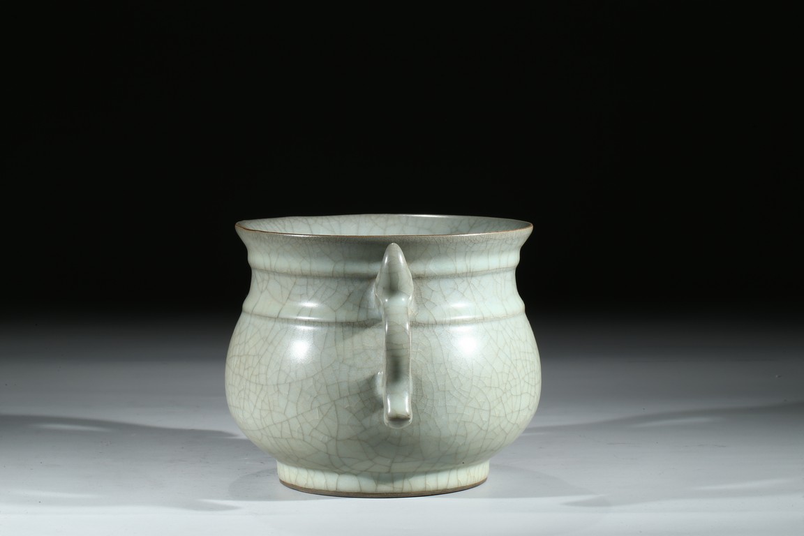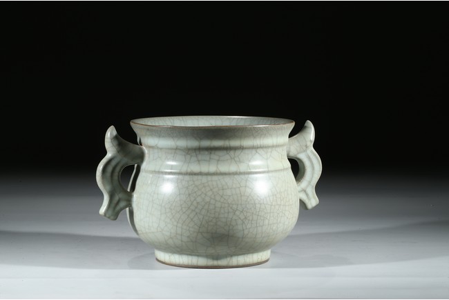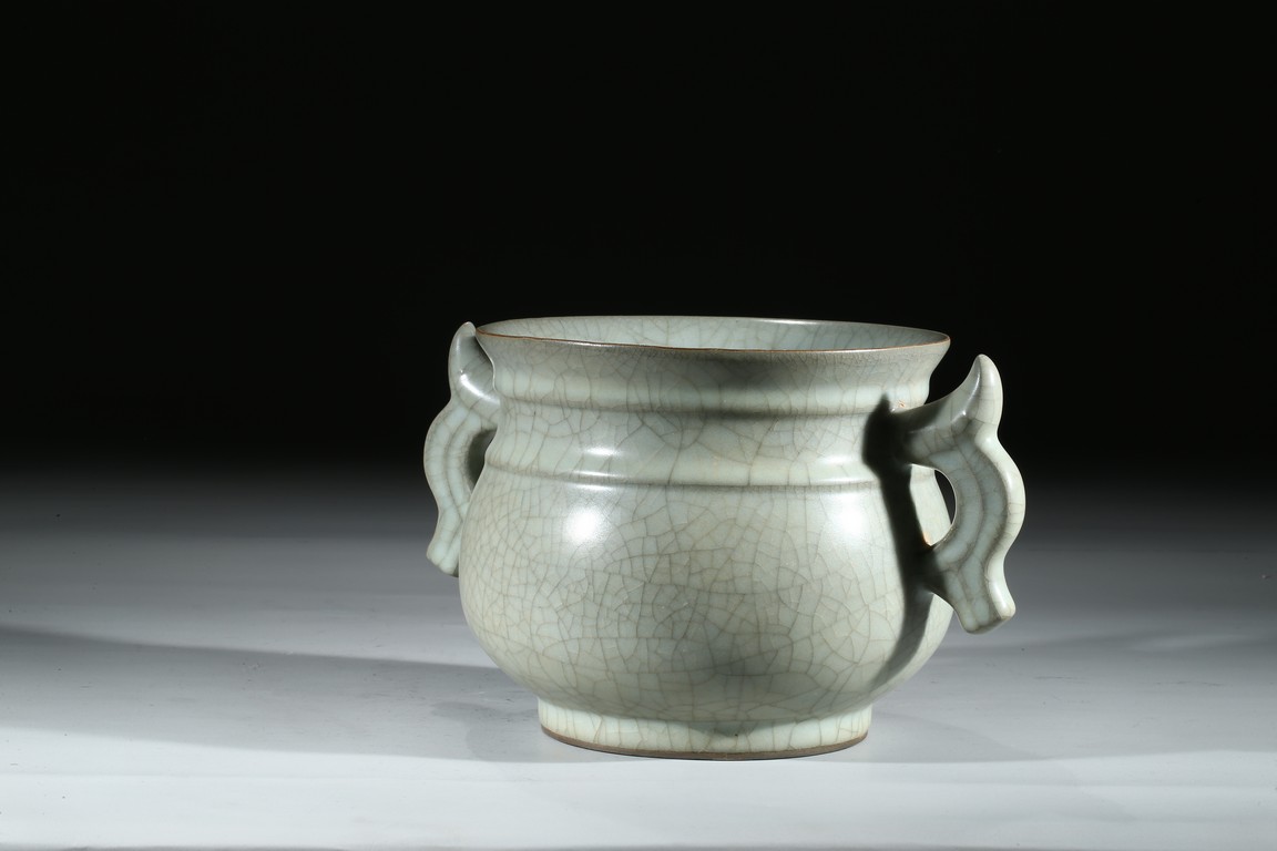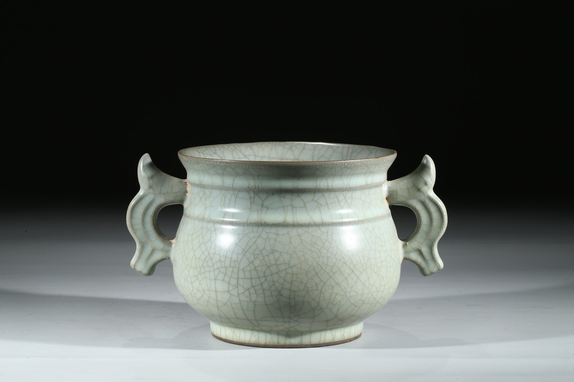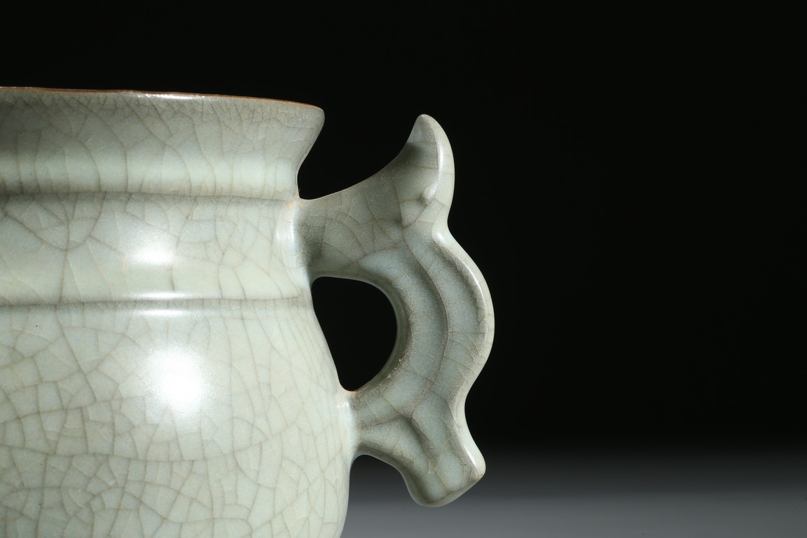宋人仿古尚美,宋器美在古意盎然。口沿外撇,頸部有兩道凸弦紋。鼓腹,通體細小開片,佈局有致,釉色肥厚瑩潤,器口一圈芒口,足底露胎。