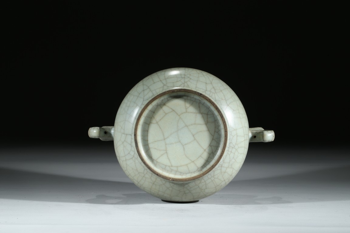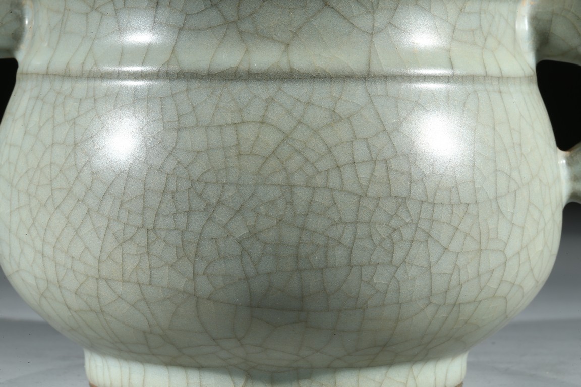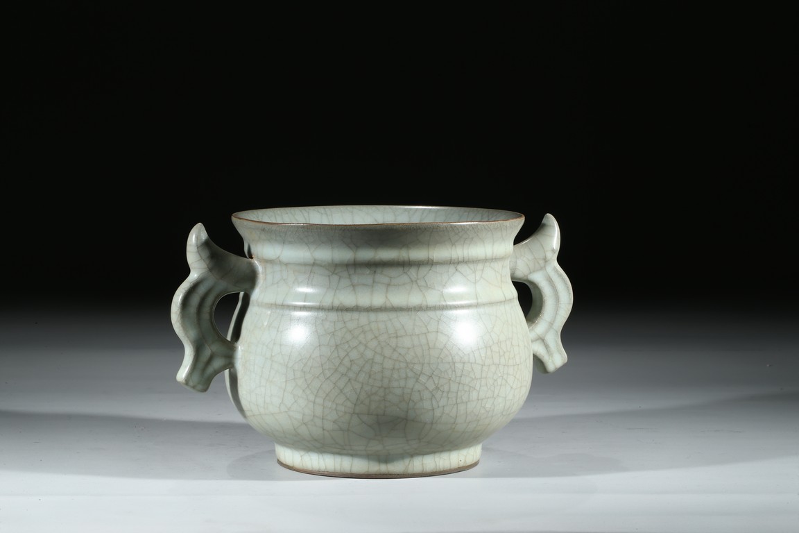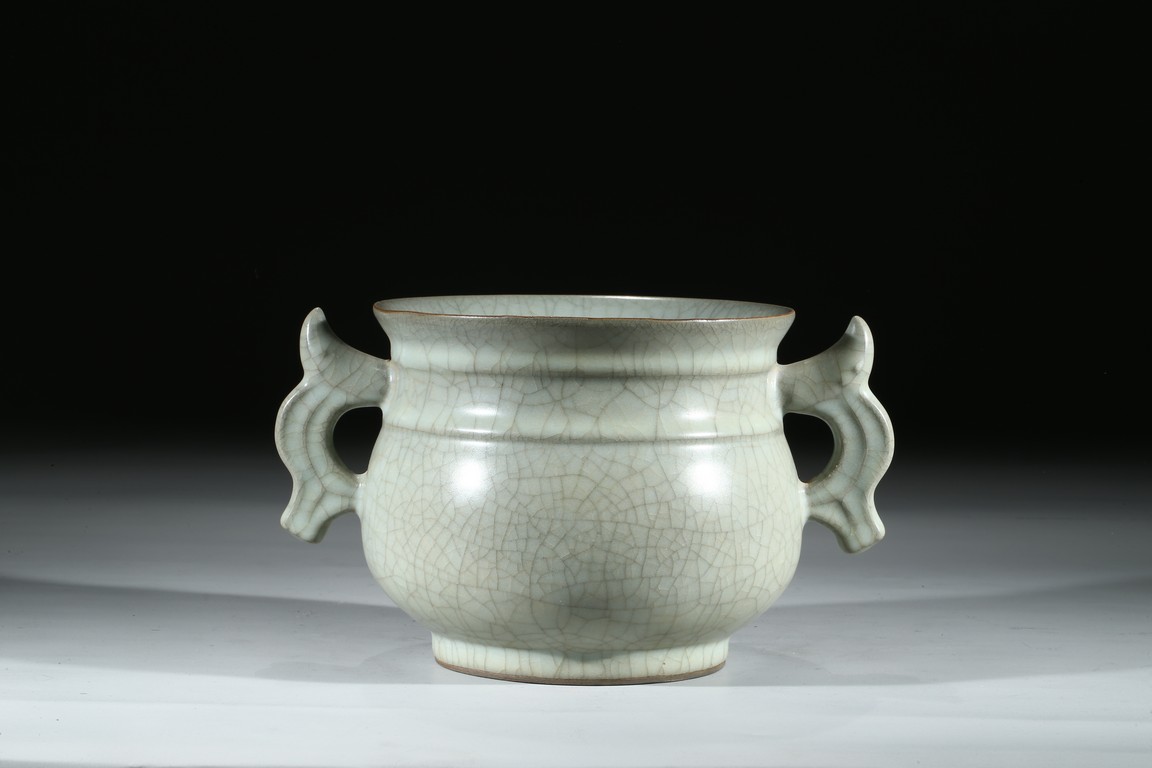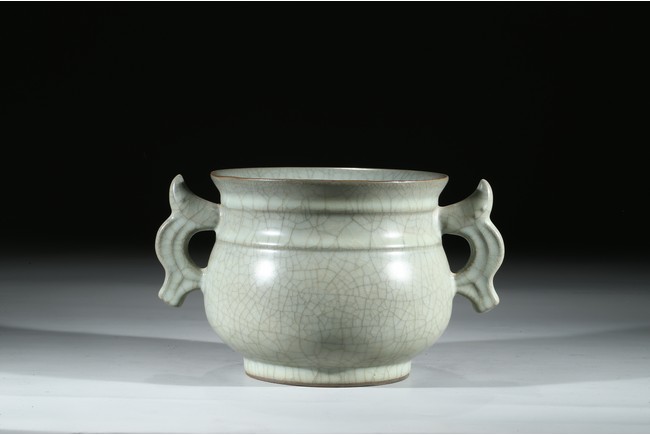 宋人仿古尚美,宋器美在古意盎然。口沿外撇,頸部有兩道凸弦紋。鼓腹,通體細小開片,佈局有致,釉色肥厚瑩潤,器口一圈芒口,足底露胎。
