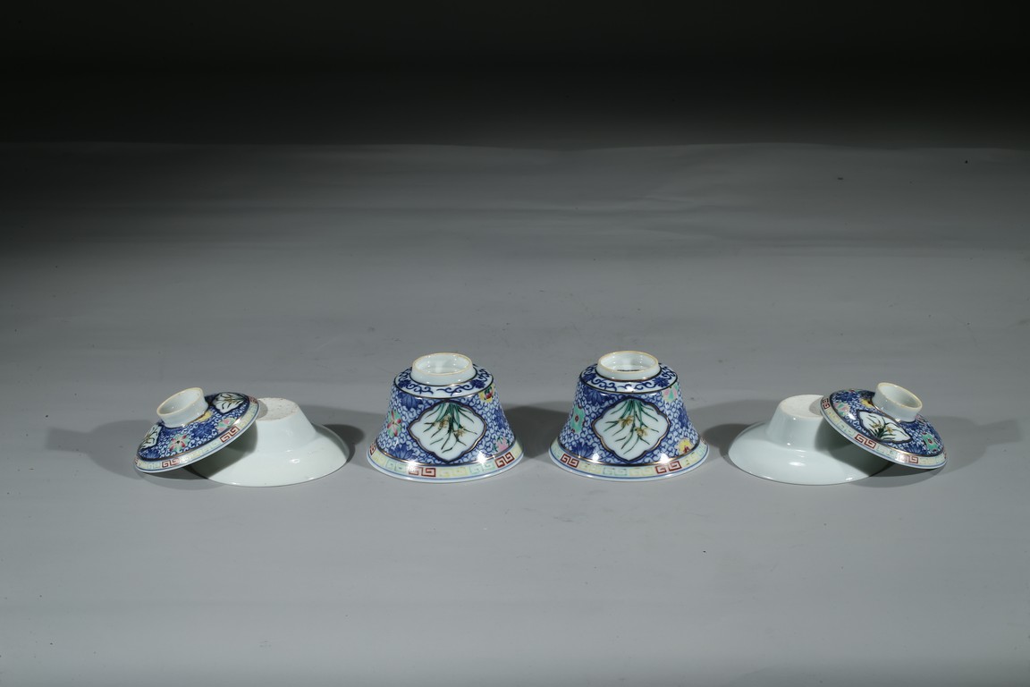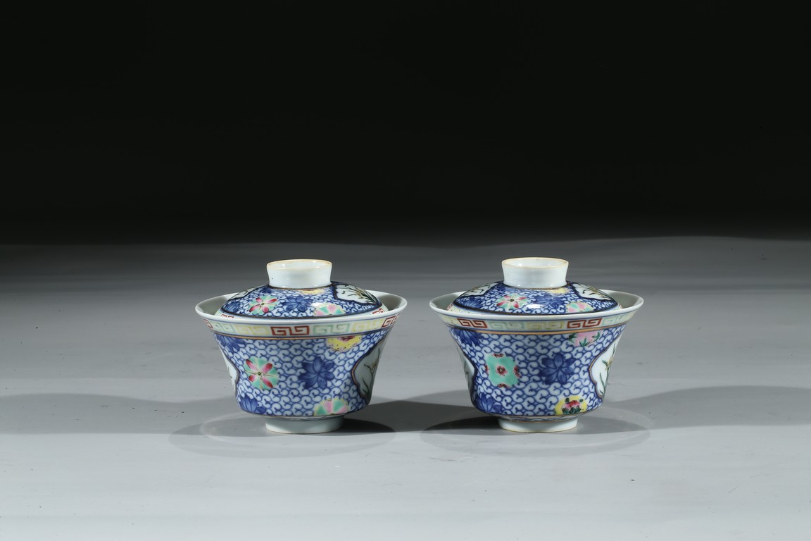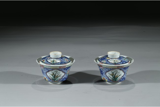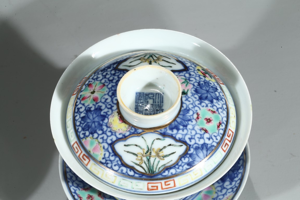 Each bowl is decorated with orchids within a shaped cartouche interrupted by 'flower-balls' within underglaze blue scrolled background, the cover enamelled with similar design, the cover finial inscribed with six character Qianlong mark, with stands. Qing Dynasty period.