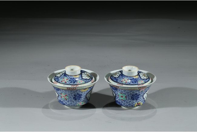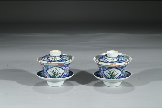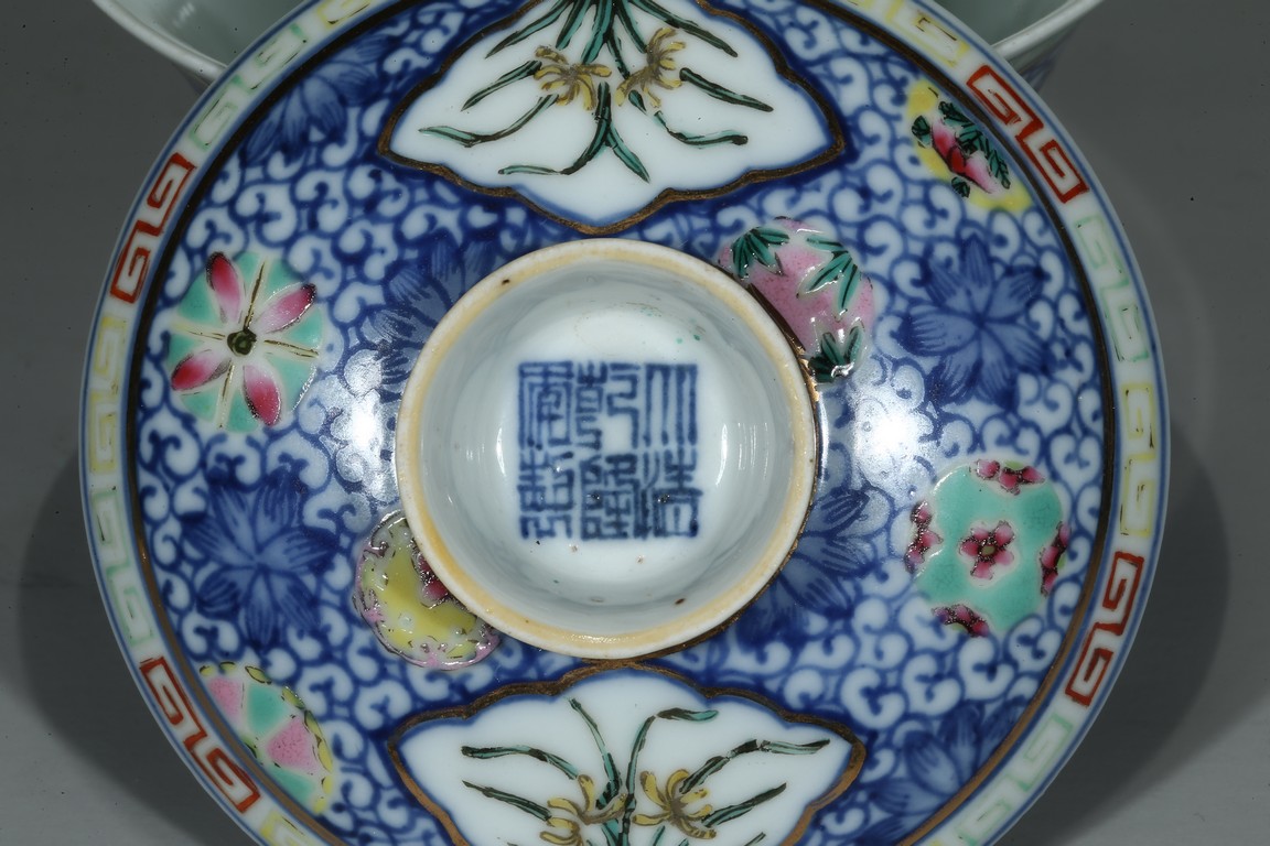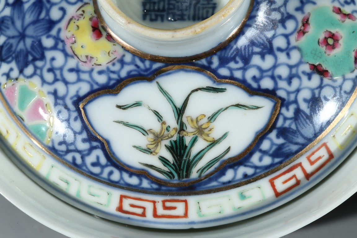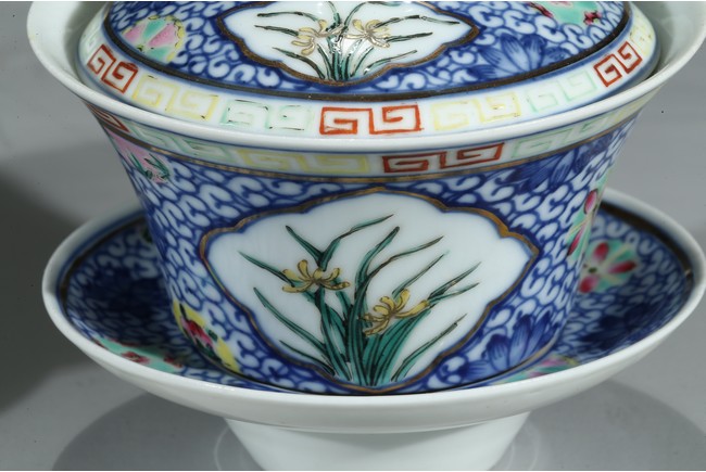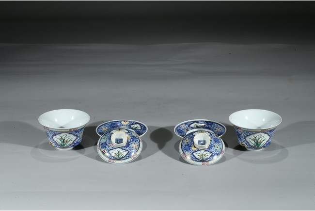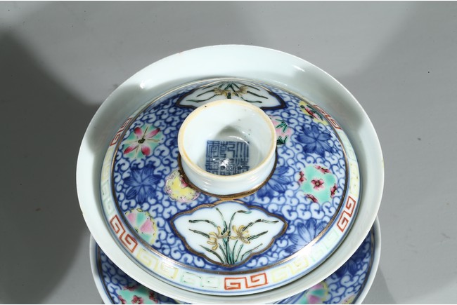 Each bowl is decorated with orchids within a shaped cartouche interrupted by 'flower-balls' within underglaze blue scrolled background, the cover enamelled with similar design, the cover finial inscribed with six character Qianlong mark, with stands. Qing Dynasty period.