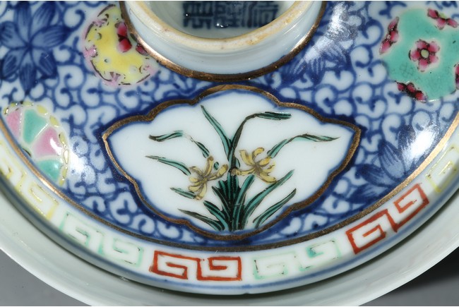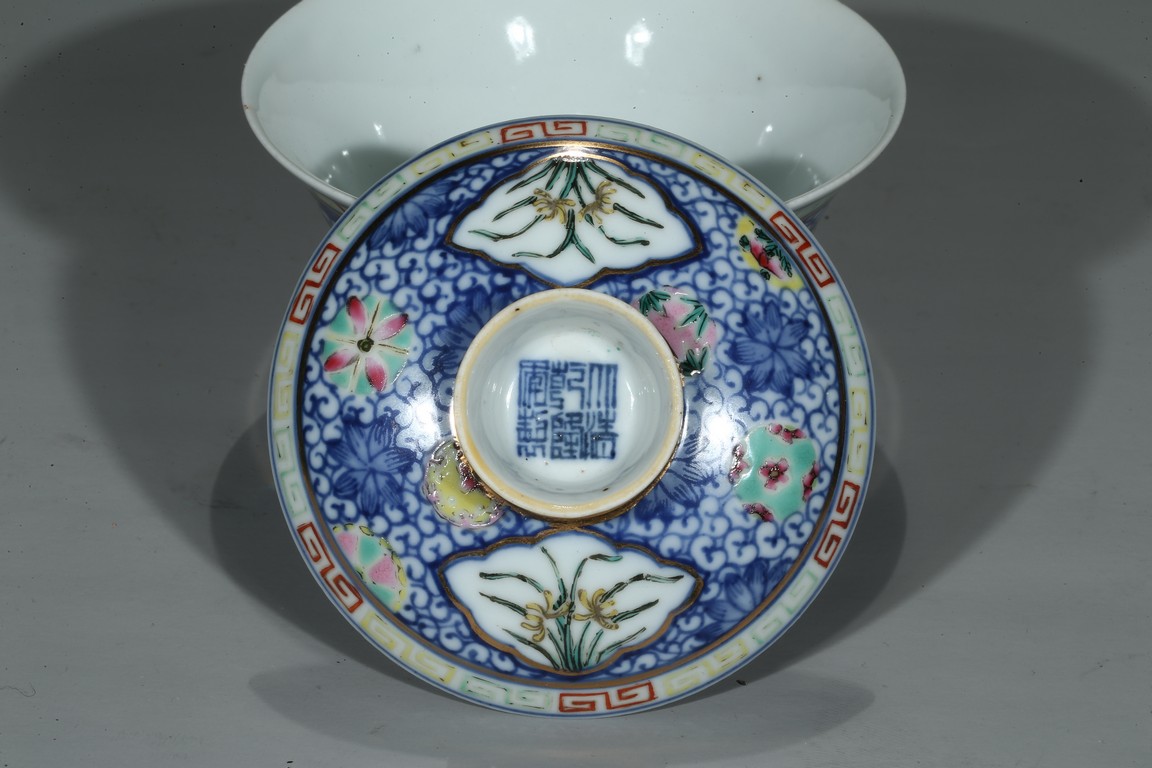 碗身敞口,微侈口,腹下漸收,圈足,胎體輕盈細薄,器身描金開光繪“蘭草紋”,又以青花繪纏枝花卉紋為地,上下爭奇鬥艷。花團錦簇,各盡其妍,猶如萬花齊放,富麗堂皇。蓋及碗身品相完好,保存至今實為不易。“大清乾隆年制”款識。