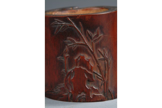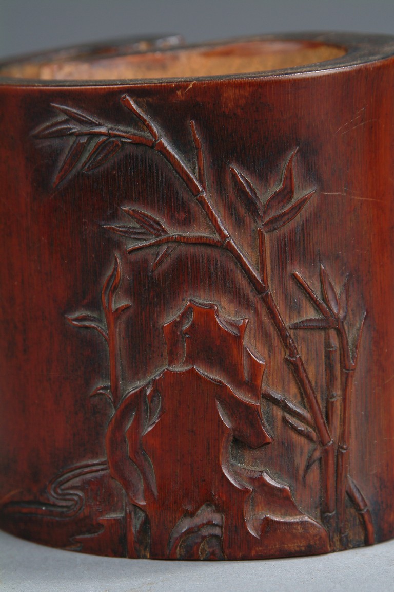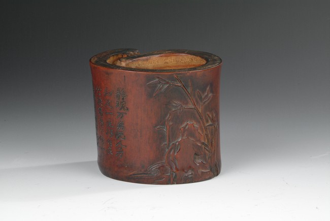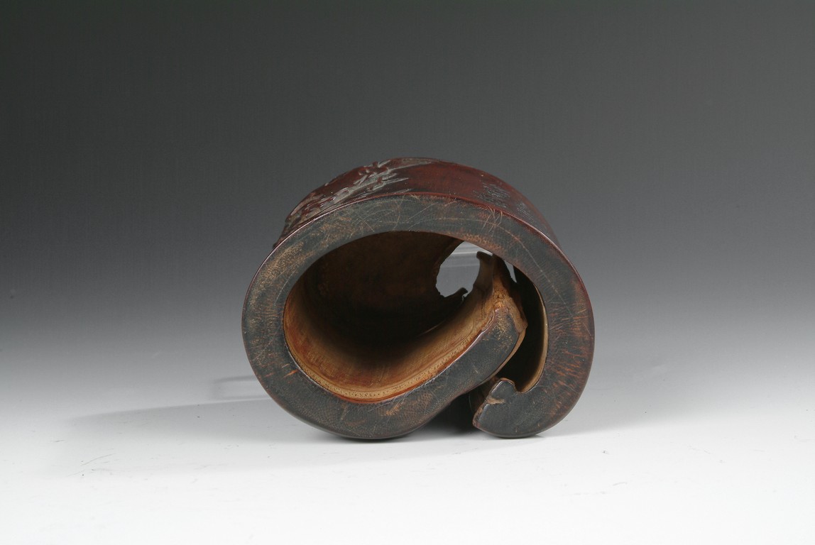 The brush pot was made out of a bamboo section that was not perfectly round, as one section of the stem wall was pushed inwards. The outside was carved with bamboo, viewing stones, and a Chinese poem calligraphy. Qing Dynasty period.