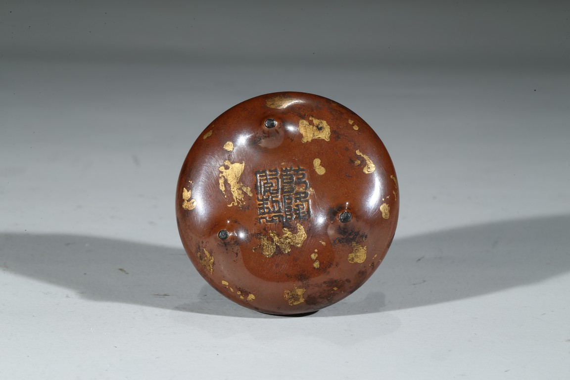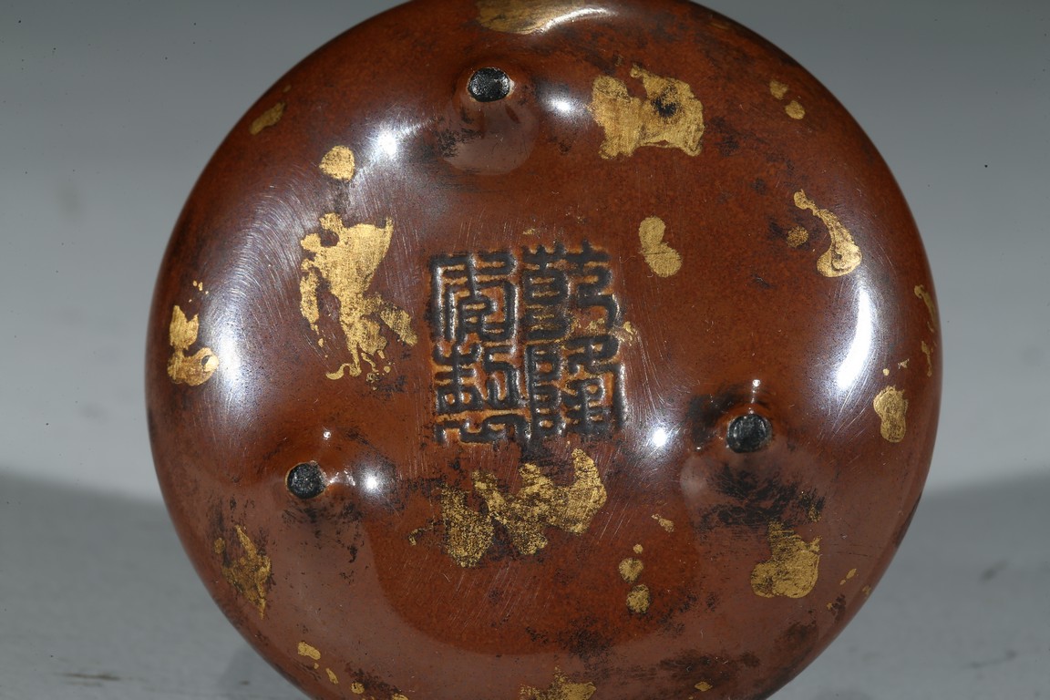 Provenance: Property from a Nevada private collection 此件器物為仿生瓷,系指仿造現實生活中的生物、器物等不同物體而燒制的瓷器。此爐敞口圓唇,頸部微收,扁圓腹,底部三凸乳足,沖天耳張弛有度。器身滿施醬釉,通體灑金為飾,金點斑駁,金片大小錯落,恣意而為,分布自然。底部“乾隆年制”刻款。 來源: 內華達州私人藏家提供